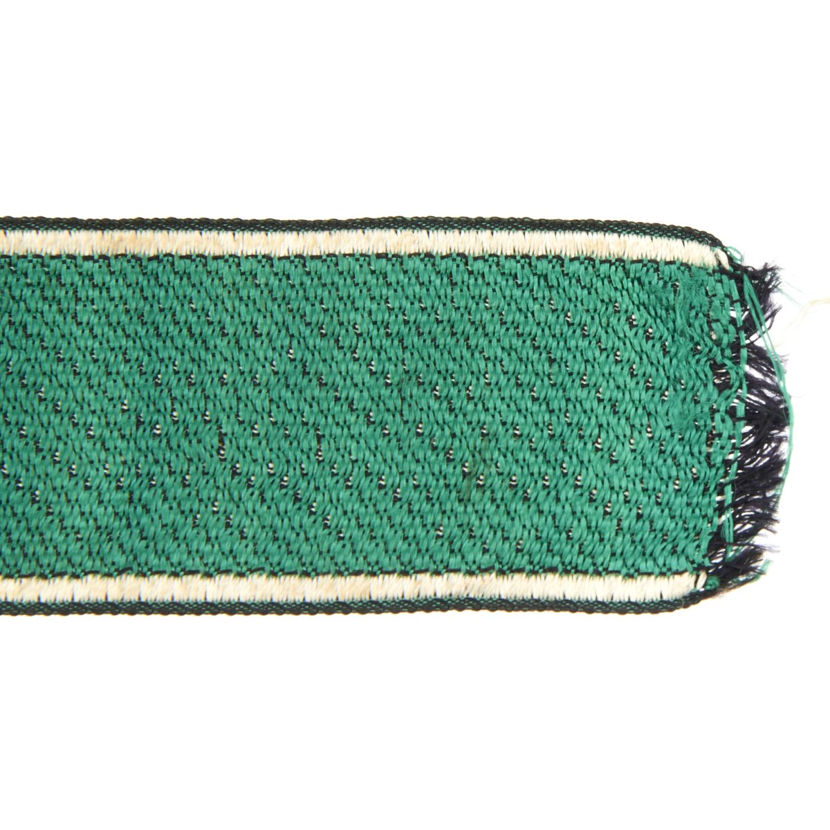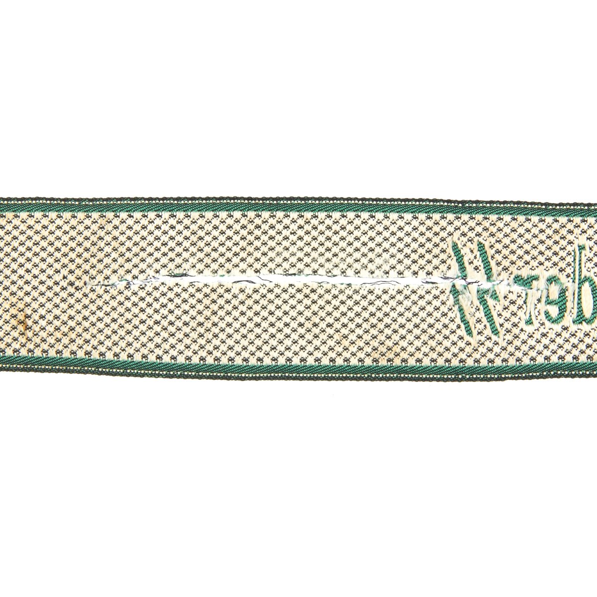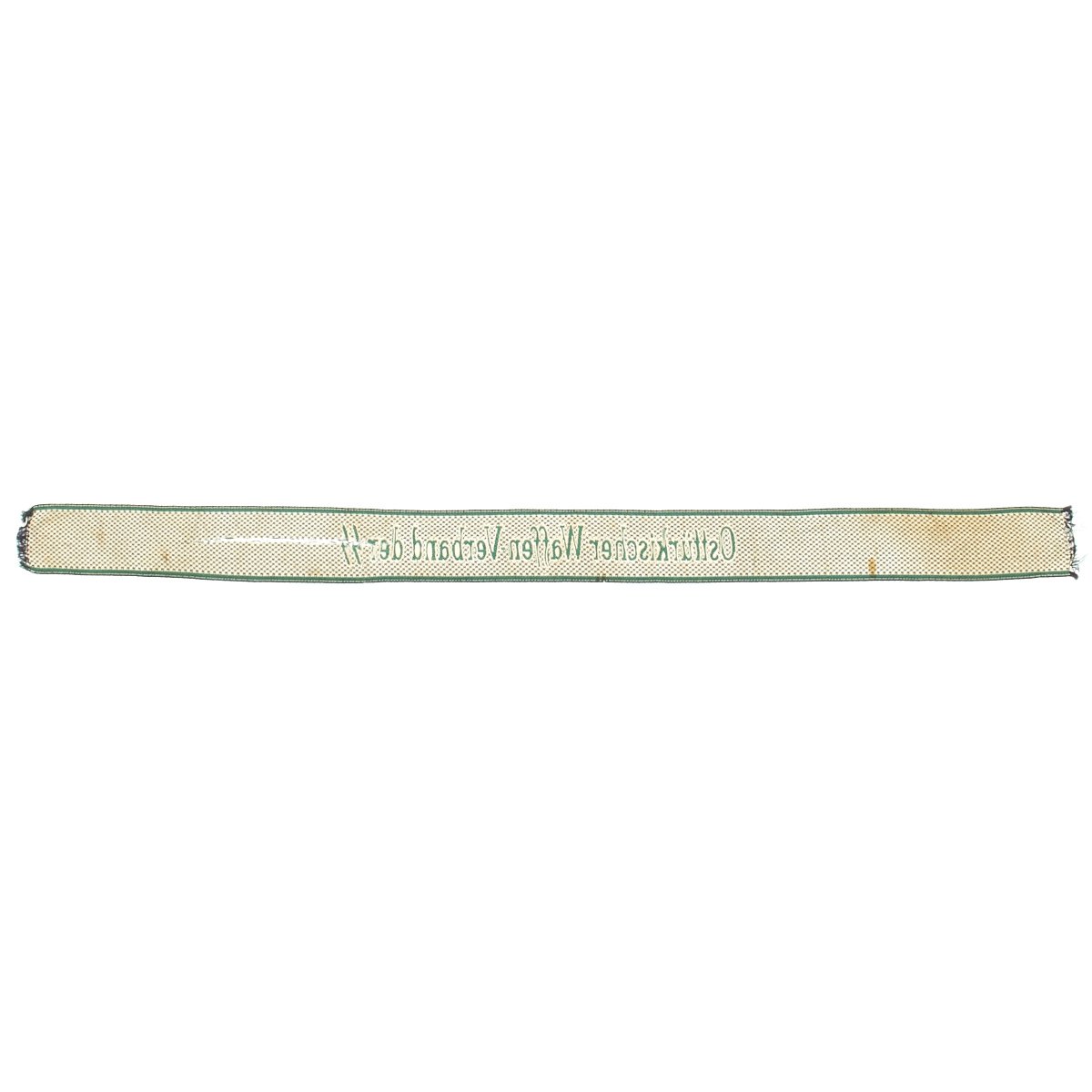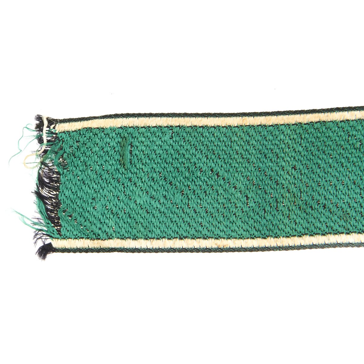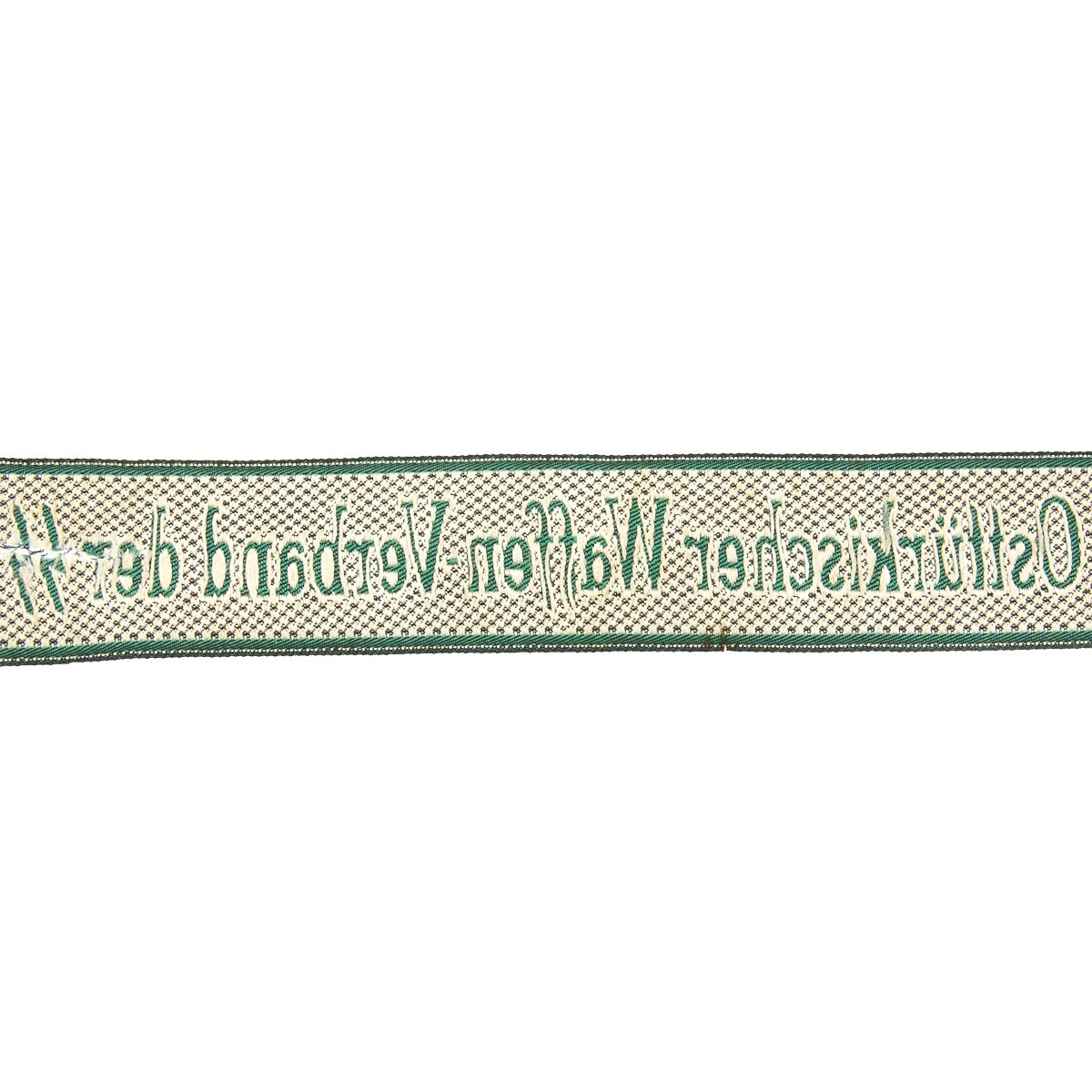 Original Item: Only One Available. CC Camp made green, white and black embroidery, inscribed "Osttürkischer Waffen-Verband der SS" in white on a green field, with black and white trim along the two lateral edges, 1 1/8 inch x 17 inches. Overall condition is excellent, with the exception of a 3 inch spit in the center of the band. It has been backed with clear fabric tape to prevent further loss. This tape can be easily removed.