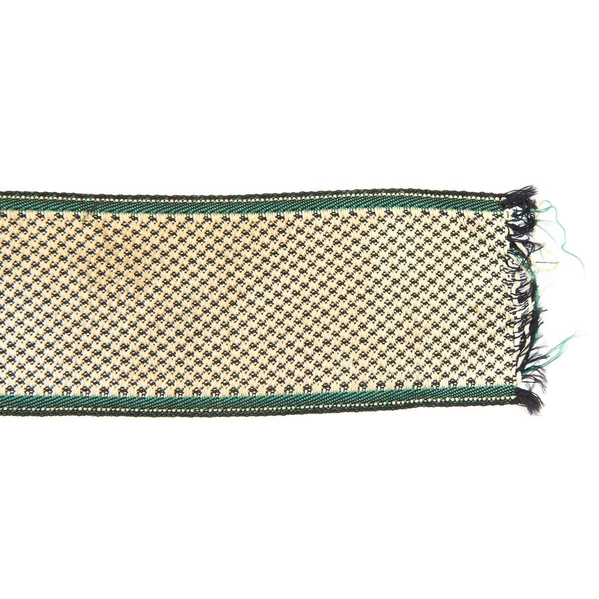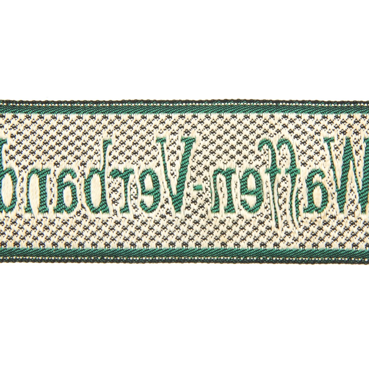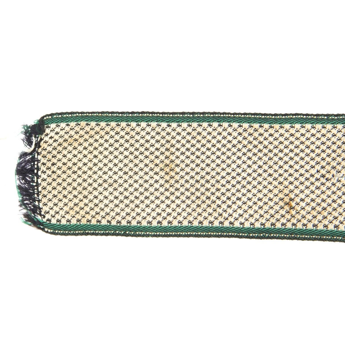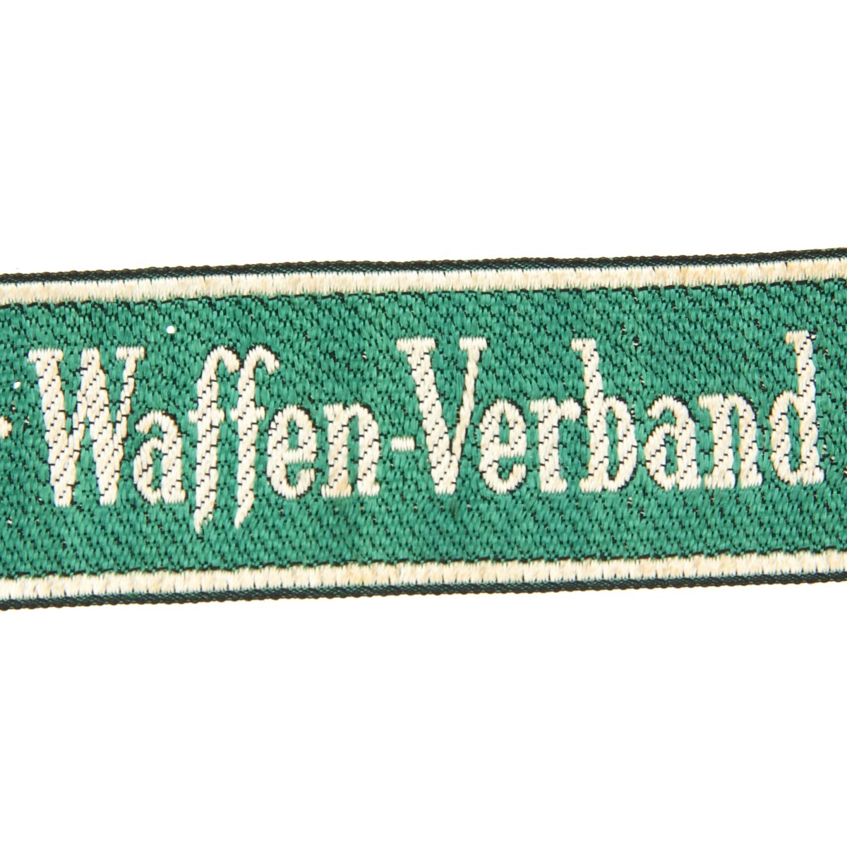 Original Item: Only One Available. CC Camp made green, white and black embroidery, inscribed "Osttürkischer Waffen-Verband der SS" in white on a green field, with black and white trim along the two lateral edges, 1 1/8 inch x 17 inches. Overall condition is excellent, with the exception of a 3 inch spit in the center of the band. It has been backed with clear fabric tape to prevent further loss. This tape can be easily removed.