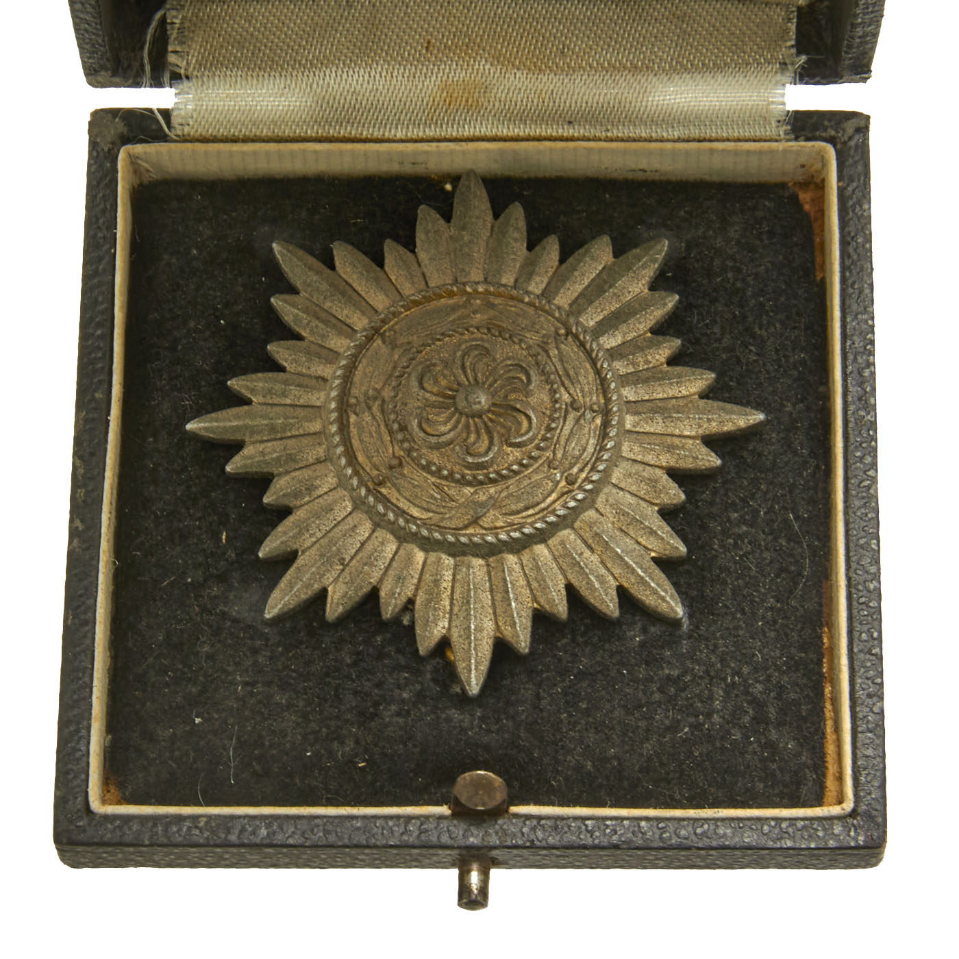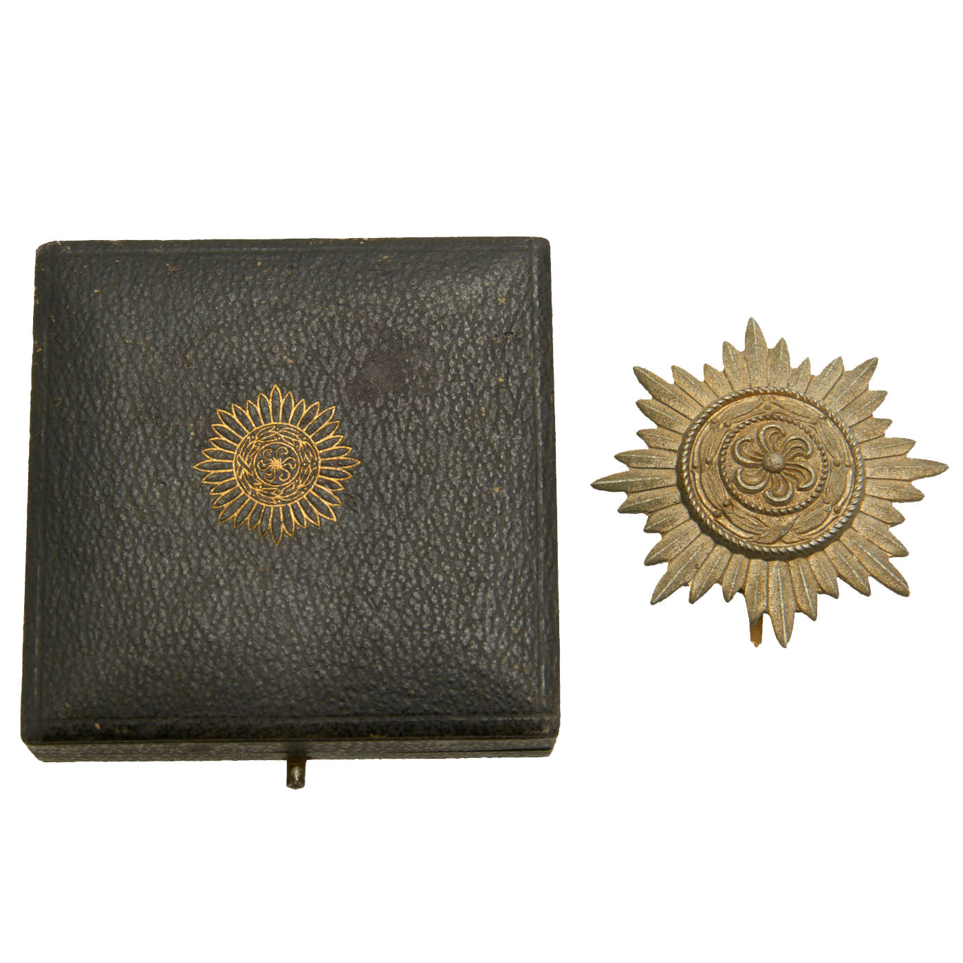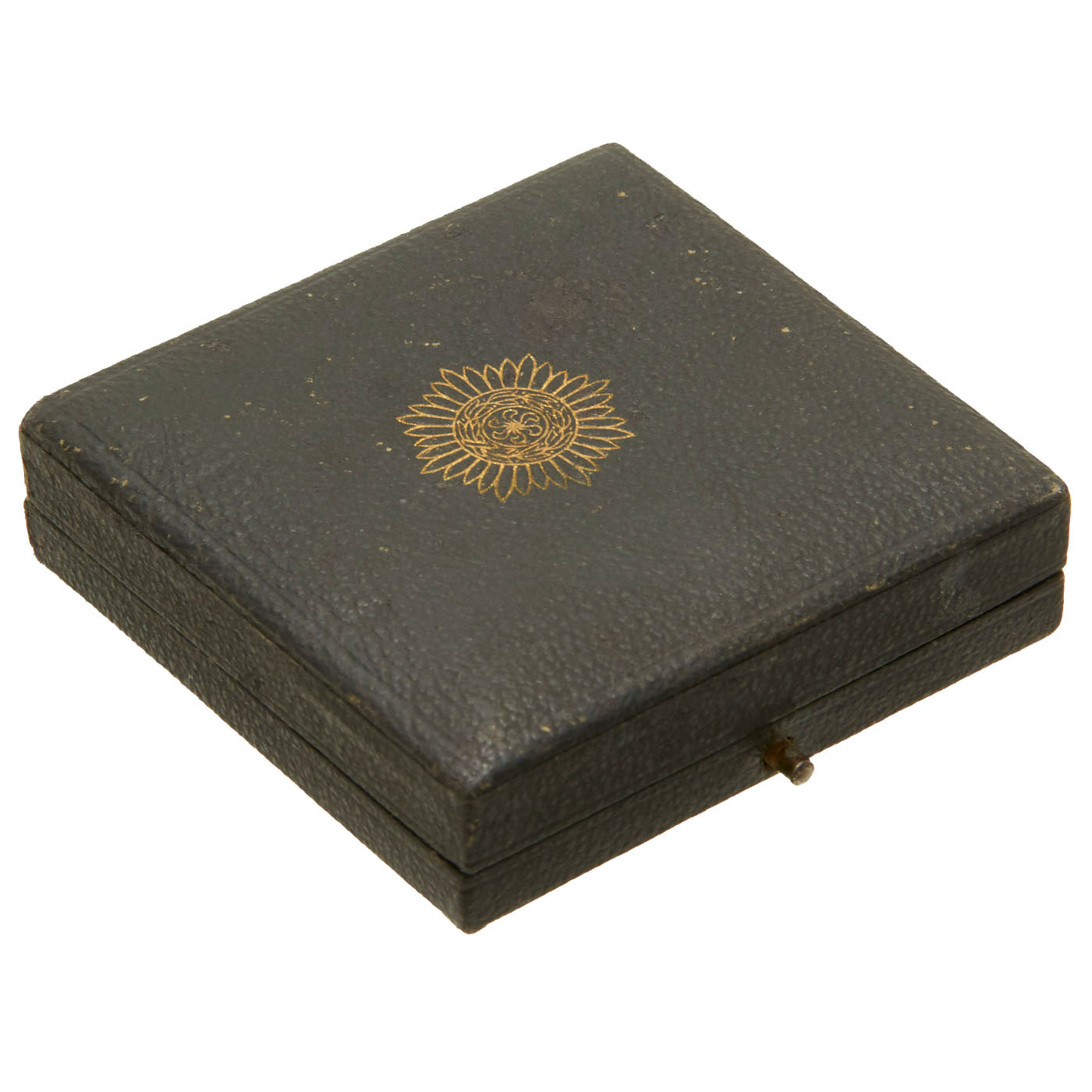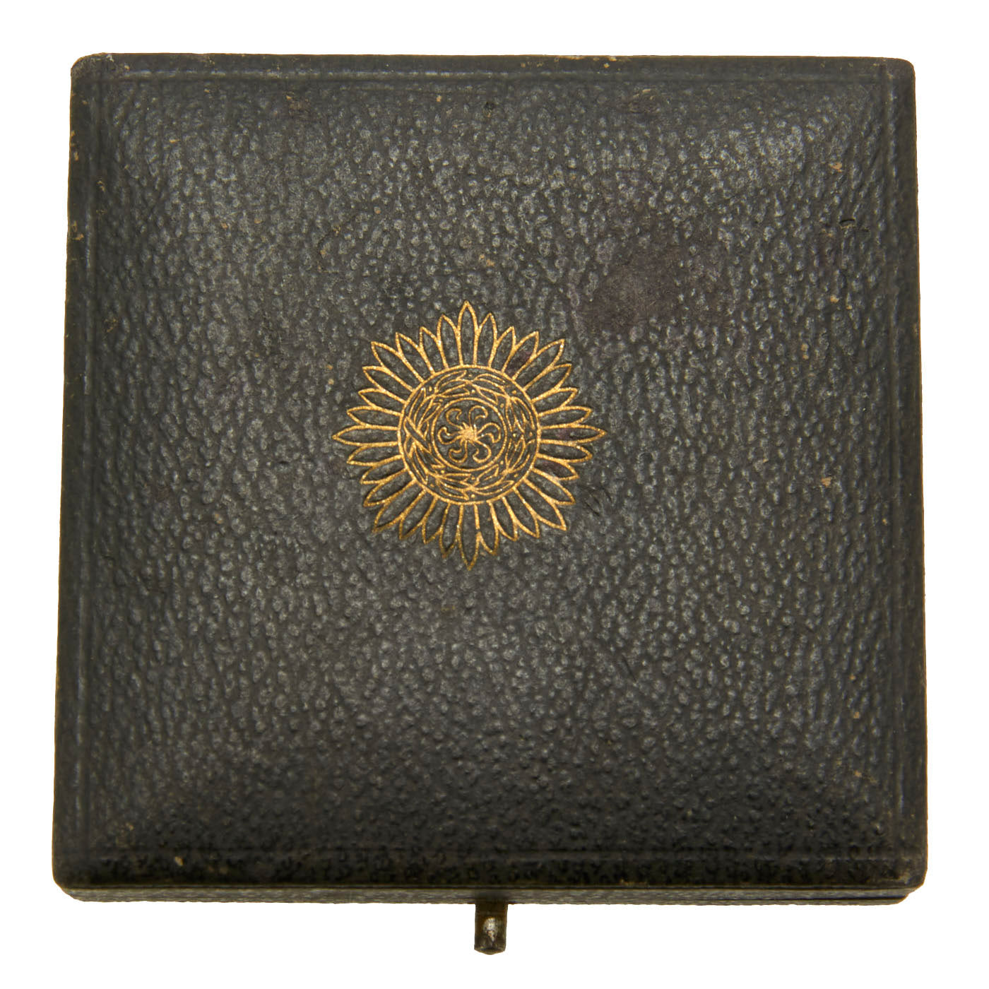 This Ostvolk Medal First Class in Gold is complete with its original case of issue, which is very rarely encountered. The lid of the case is impressed with the design of this award (the gold grade without swords, a perfect match for the award inside). The leatherette exterior shows some handling wear and abrasions. The push-button closure mechanism is intact and functional. Inside, the award rests on a black flocked insert. This is a fantastic example of the Ostvolk Medal First Class in Gold, and a very hard cased set to find.