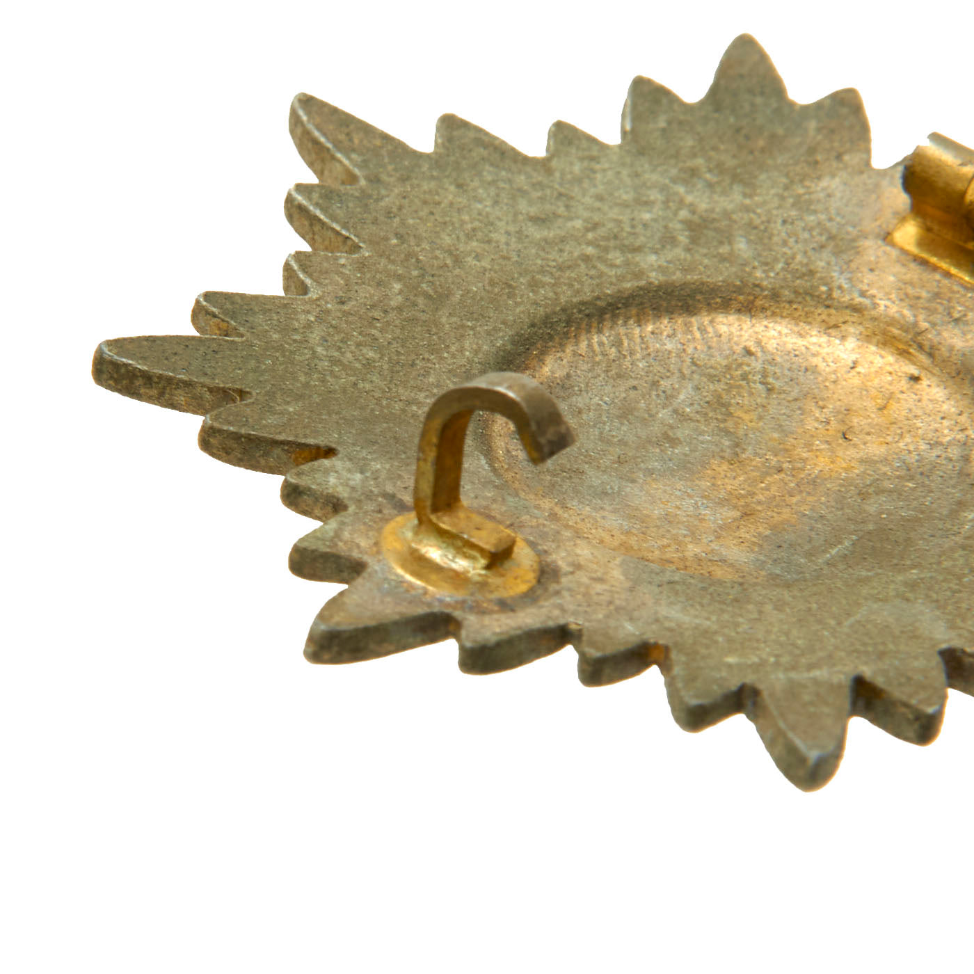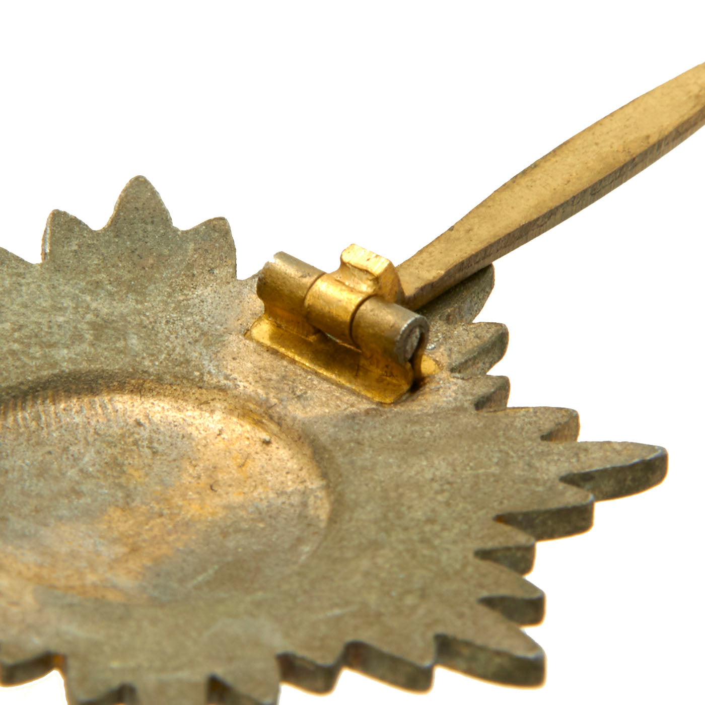 Original Item: Only One Available. This cased Ostvolk "Eastern Peoples" Medal First Class in Gold is a very rare set. The award itself is unmarked, and made from zinc, both typical traits for these awards. It is the type without swords, and was issued for merit. Most of the finish on the front of the award is worn away. The badge shows minor wear and normal age patina and remains in excellent condition overall. The reverse of the badge also retains some of the original shiny gold finish on the zinc and nearly all of the original finish on the hardware. The hardware setup features a wide pin and is intact, unrepaired, functional and textbook for this award.