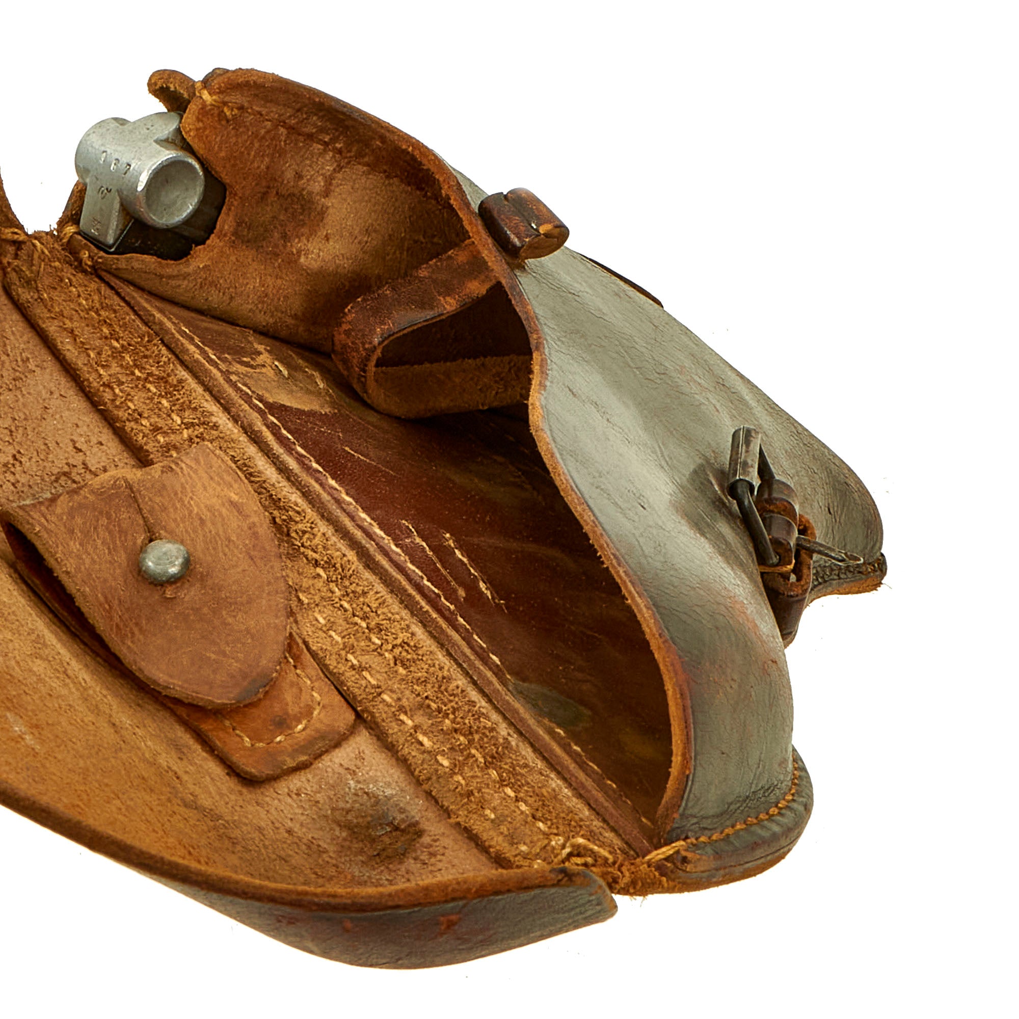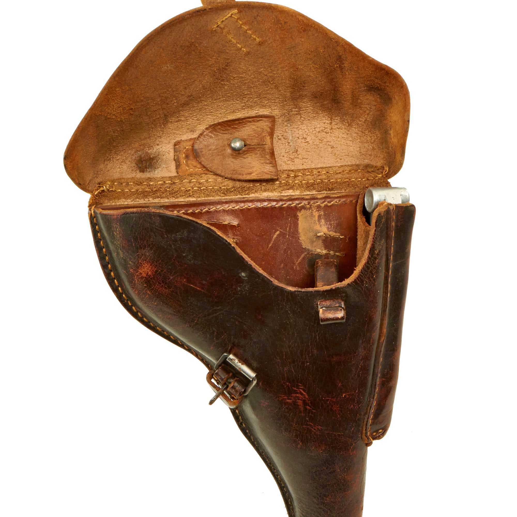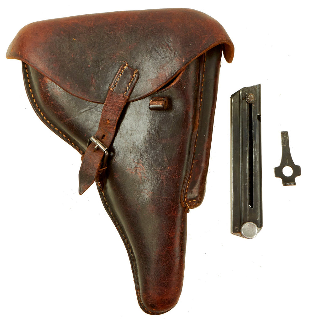 Original Item: Only One Available. This is a very nice example of a standard issue brown leather hardshell P-08 holster, which was used by German forces during WWII. Most Luger holsters since late WWI in 1916 had been black, but they were still produced in brown for various units who utilized brown leather. This fine holster also comes complete with a spare magazine, as well as an original take-down and loading tool. Both are in very good condition, and the magazine is marked with serial number 167 / v on the aluminum end fitting. It also has Waffenamt Eagle / 63 stamped, for the legendary Mauser Factory of Obendorf.