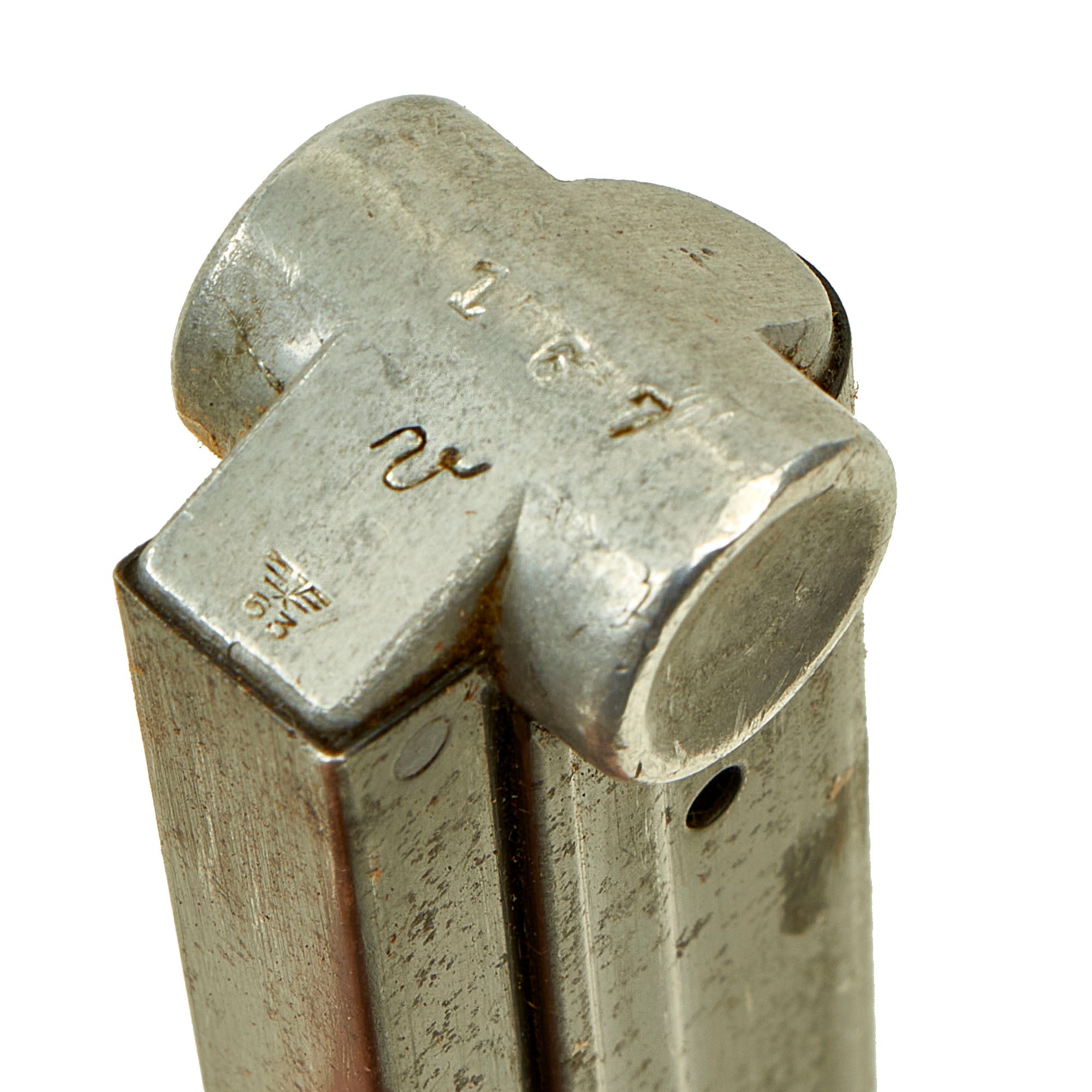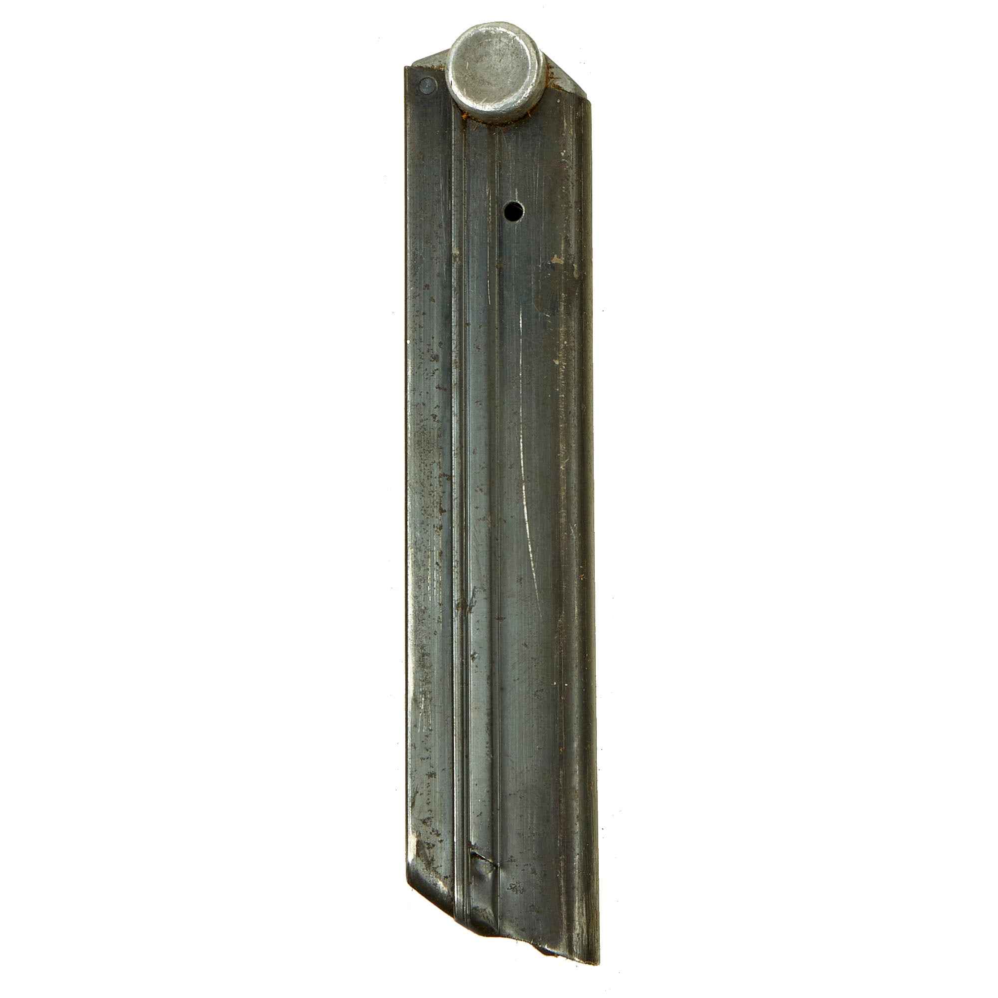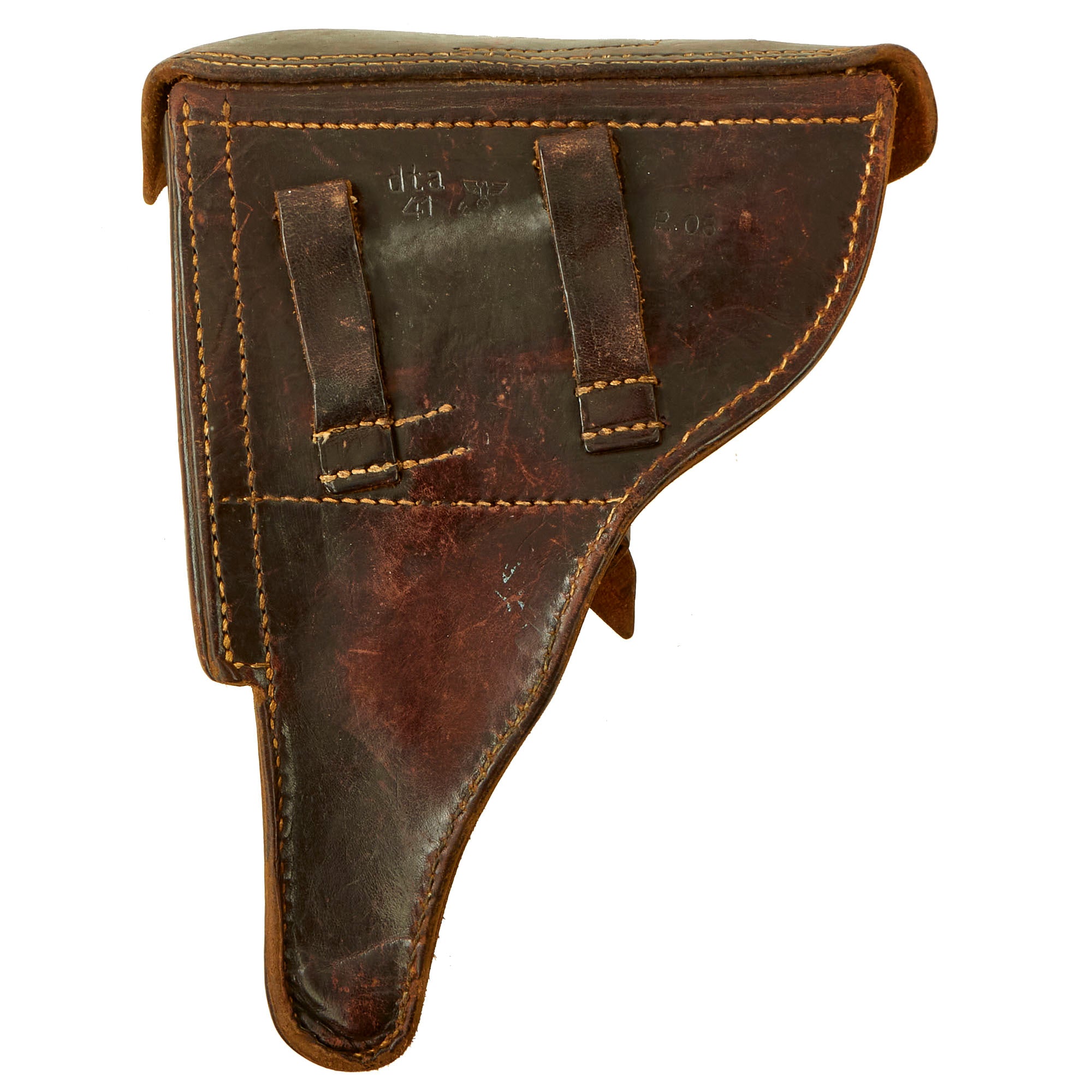 Original Item: Only One Available. This is a very nice example of a standard issue brown leather hardshell P-08 holster, which was used by German forces during WWII. Most Luger holsters since late WWI in 1916 had been black, but they were still produced in brown for various units who utilized brown leather. This fine holster also comes complete with a spare magazine, as well as an original take-down and loading tool. Both are in very good condition, and the magazine is marked with serial number 167 / v on the aluminum end fitting. It also has Waffenamt Eagle / 63 stamped, for the legendary Mauser Factory of Obendorf.