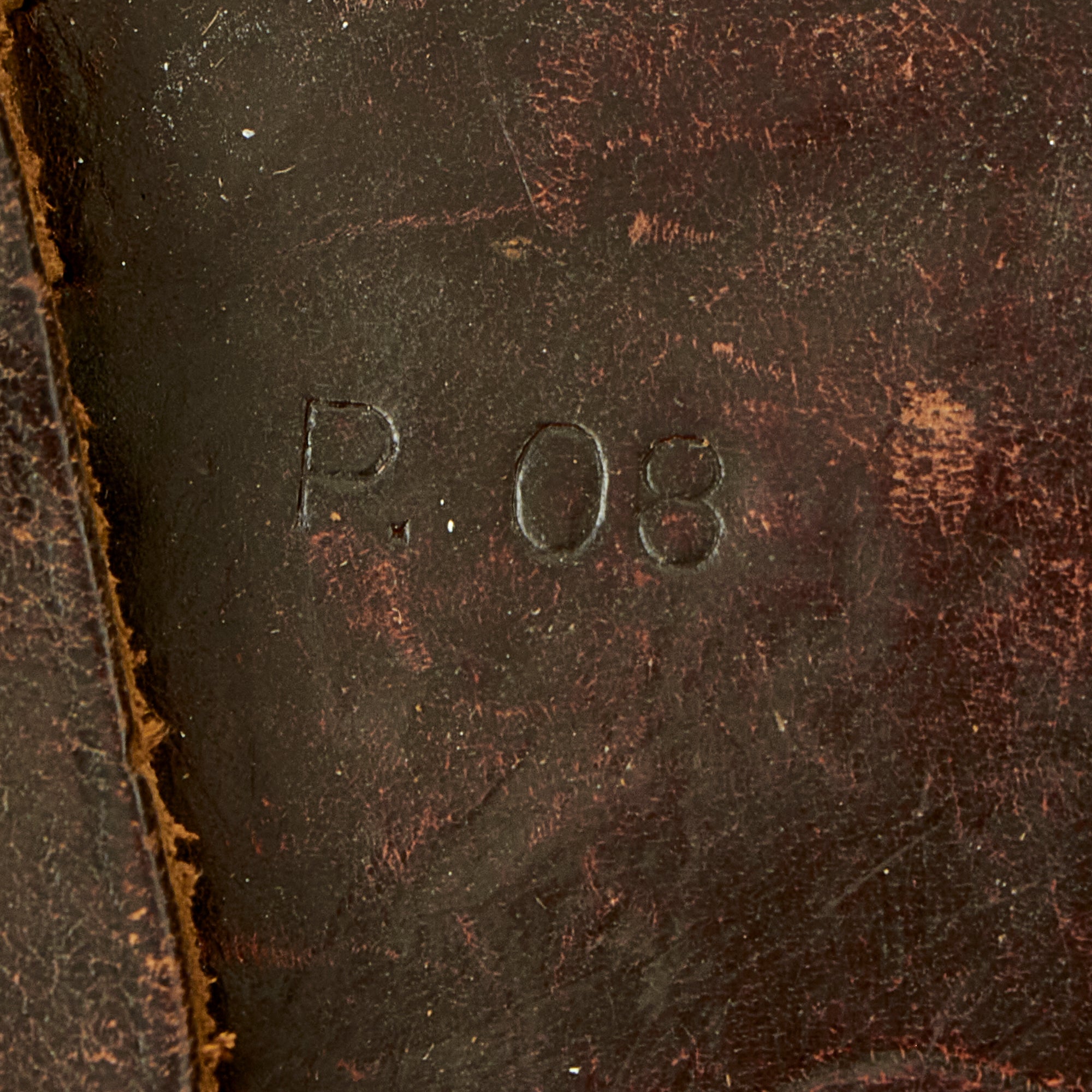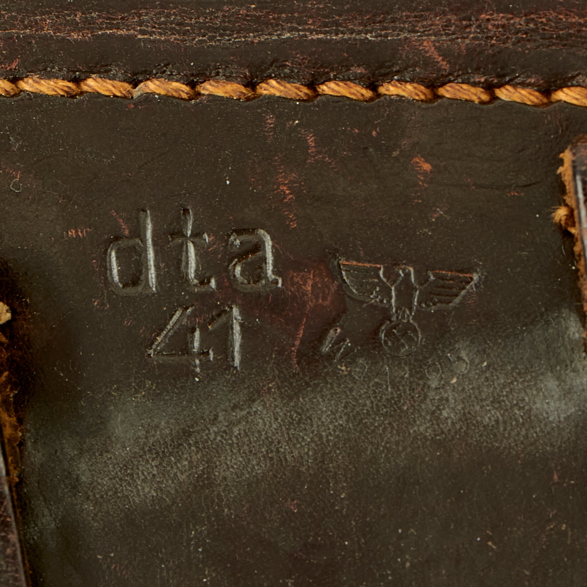The holster is marked on the back with the standard P.08 designation on the upper right, and is also marked and dated with a German three letter code, dta / 41, for 1941 manufacture by A. Waldhausen, located at Inh. M. Bruchmann in Köln (Cologne), Germany. This company manufactured holsters for the P.08 and other service pistols, as well as other leather wares, according to GERMAN MILITARY LETTER CODES 1939-1945 by John Walter. It is also marked with a Waffenamt WaA195 proof between the two belt loops, which research shows is the correct inspector for this maker.
