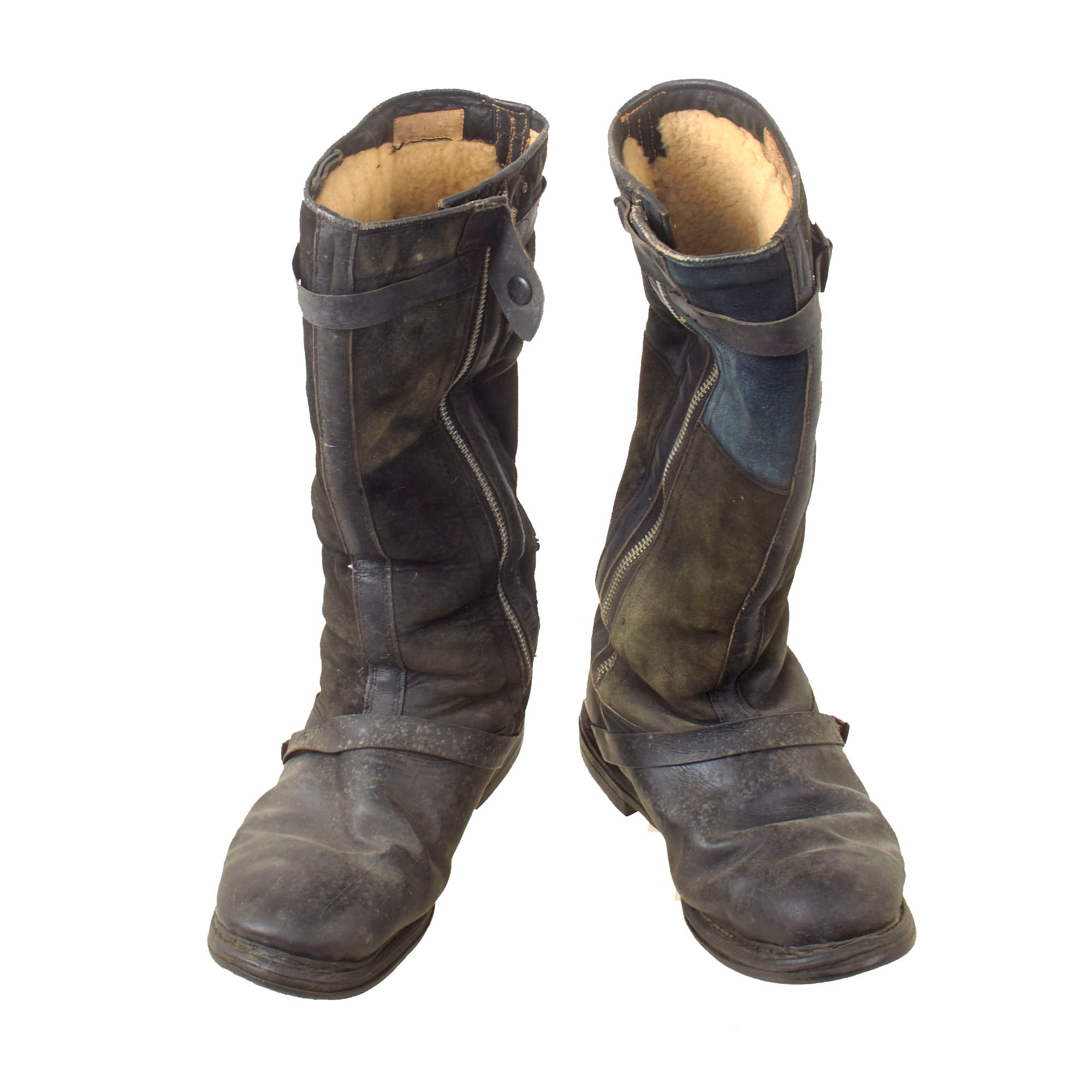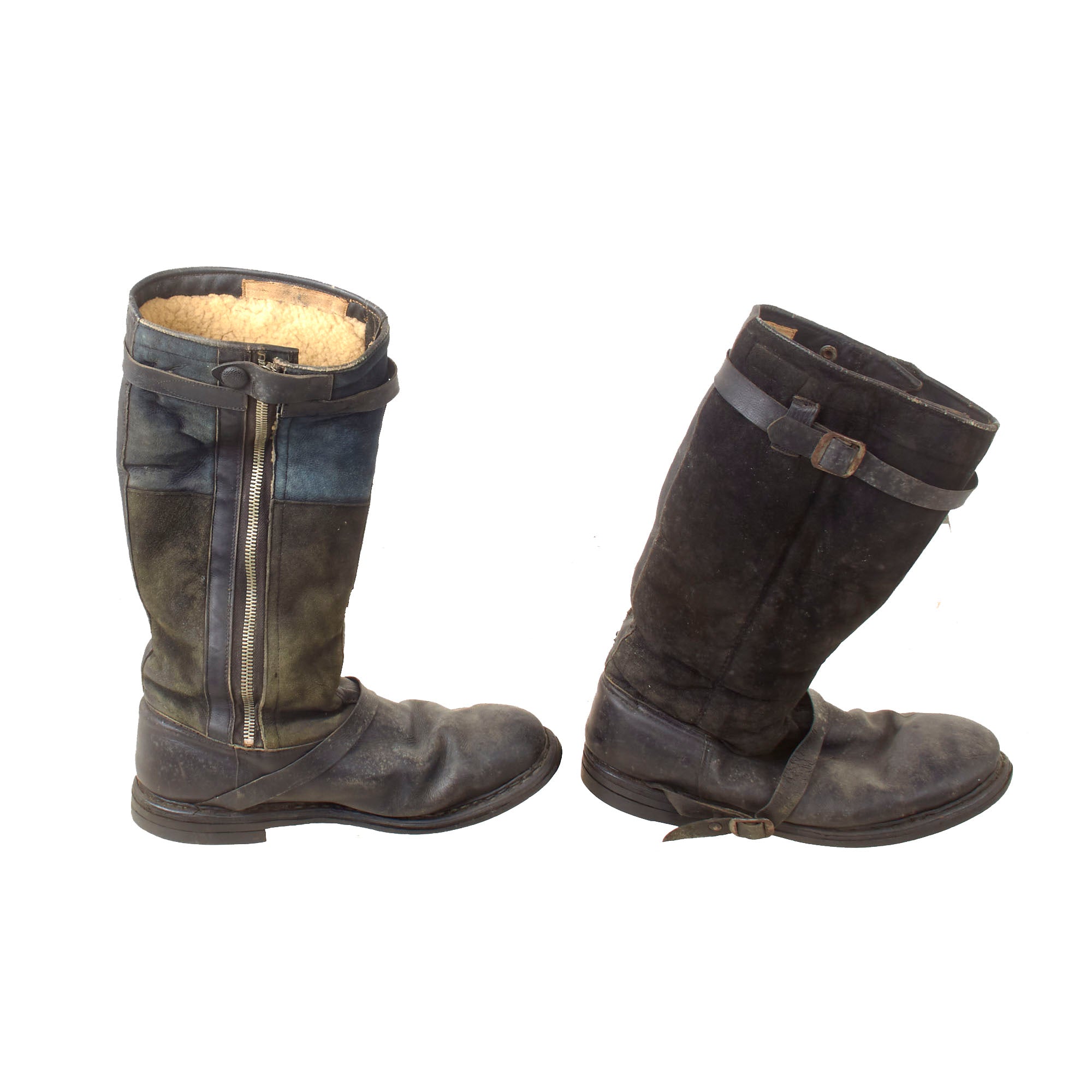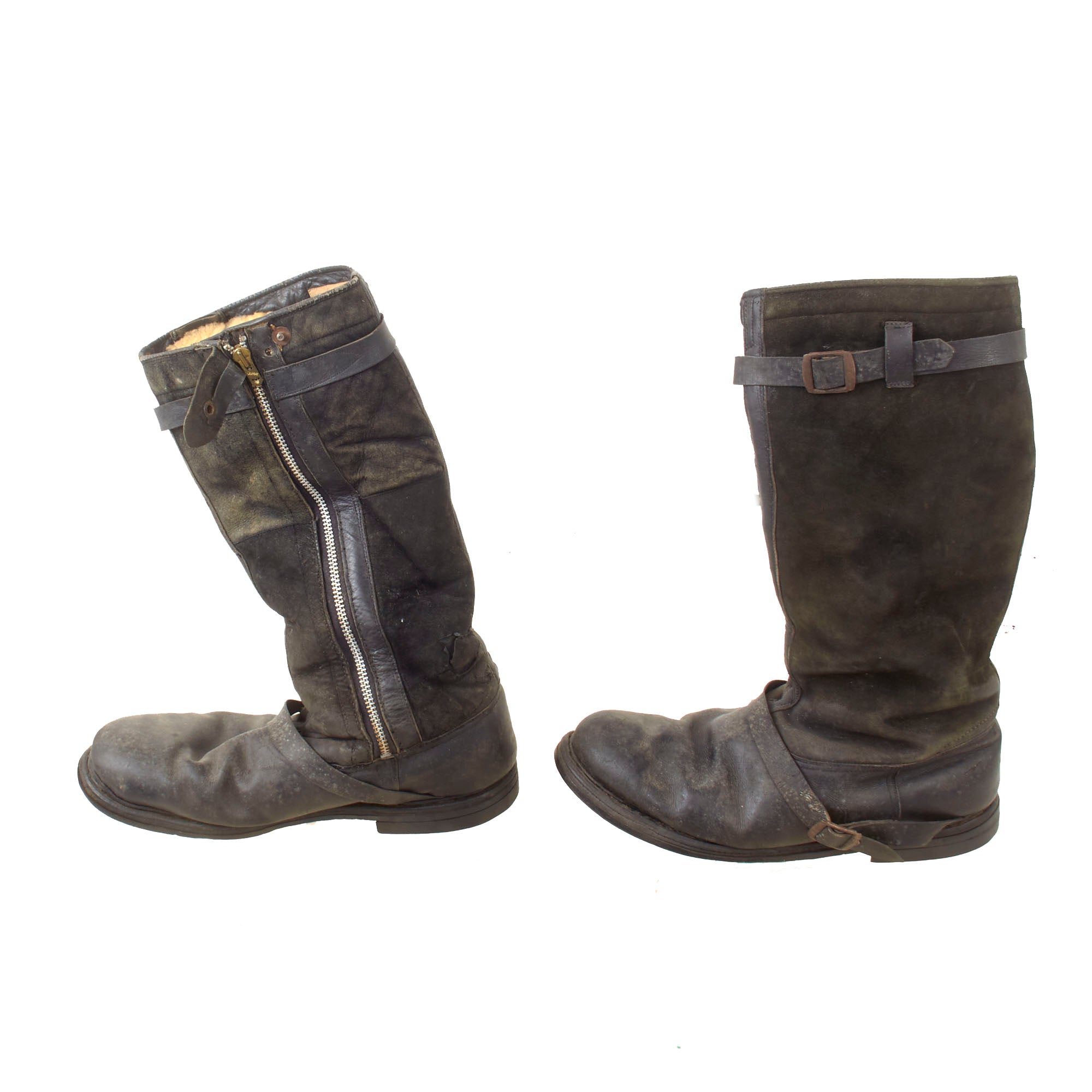 These 24 volt electrically heated boots are the same pattern as the standard single zip flying boot but feature a heating element in the foot section. These are of early-war type construction, the suede upper panels being of generally even color and the buckles and zips zinc plated steel. Later issued boots would feature an increased number of panels and plastic zips.