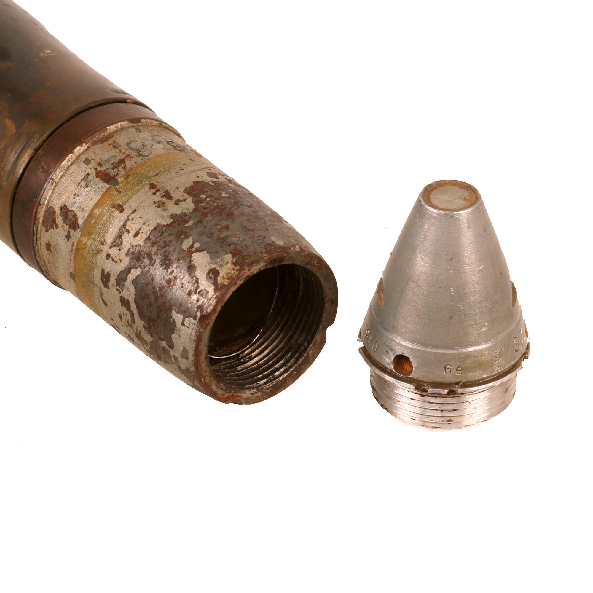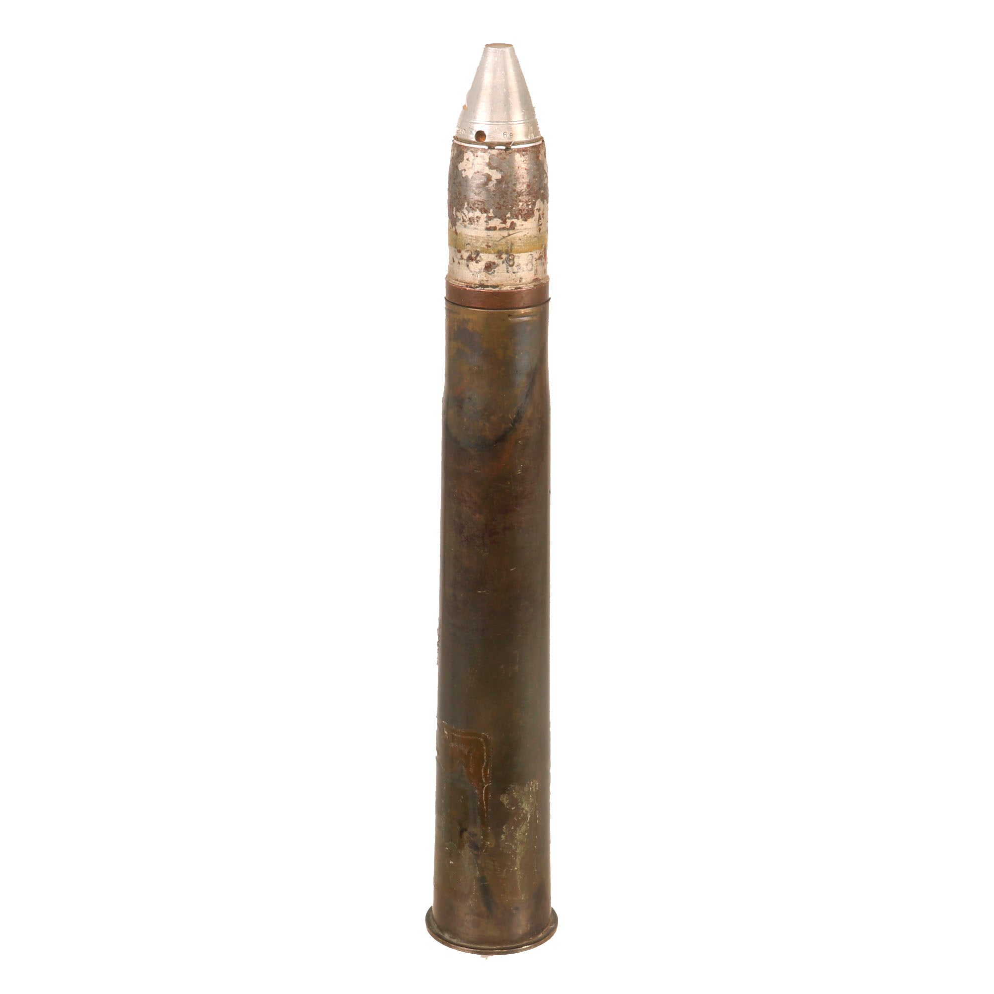 Original Item: Only One Available. This is a very good condition, totally inert -BATF compliant, PAK 36 37mm High Explosive round in its original shell casing. Offered in very good condition with partial German wartime markings on the base of the shell, which read:25P B6331 (WAFFENAMT EAGLE) WaA7563313.7cm PakThe fuze is marked 6e (WAFFENAMT) WaA259 3,7 cm KpfZ ZerlPv Rh S 195 1940.The shell measures approximately 13 ½ inches long, and the round is not currently removable from the casing. Ready to display!Not Available For ExportThe Pak 36 (Panzerabwehrkanone 36) is a 3.7 cm caliber German anti-tank gun used during the Second World War. It was the main anti-tank weapon of Wehrmacht Panzerjäger units until 1942. Developed by Rheinmetall in 1933, it was first issued to the German Army in 1936, with 9,120 being available by the beginning of the war in September 1939 and a further 5,339 produced during the war. As the predominant anti-tank gun design in the world during the late 1930s, demand was high for the Pak 36, with another 6,000 examples produced for export and the design being copied by the Soviet Union as the 45 mm anti-tank gun M1932 (19-K) and by other nations such as Japan.It first saw service during the Spanish Civil War in 1936, where it performed well against the light tanks of the conflict. It was first used during the Second World War against Poland in 1939 and had little difficulty with any of the Polish tanks. The Battle of France in 1940 revealed its inadequate penetration capability against French and British heavier tanks, particularly the Char B1, and especially the Matilda II, receiving the derisive nicknames "Heeresanklopfgerät" from its crews, but it sufficed to defeat the bulk of the Allied armor in the campaign. The invasion of the Soviet Union brought the Pak 36 face to face with large numbers of T-34 and KV-1 tanks, which were invulnerable to its fire. However, 91% of the Soviet tank forces in 1941 consisted of lighter types that lacked sufficient armor to defeat the gun, and the Pak 36 knocked out thousands of such tanks.The Pak 36 was replaced from late 1940 onward by the 5 cm Pak 38 anti-tank gun and from November 1941 by the 7.5 cm Pak 40. This process was accelerated by the engagements with the modern Soviet tanks, and Pak 36 production ceased entirely in early 1942. The introduction in 1943 of the Stielgranate 41 shaped charge gave it the ability to punch through the armor of any Allied tank, but the ammunition's short range made the Pak 36 crews vulnerable to enemy fire and could not solve the gun's basic obsolescence. German paratroopers employed the gun due to its low weight and consequent high maneuverability. The Pak 36 was also used by Axis-allied, second-line, garrison and training units until the end of the war.