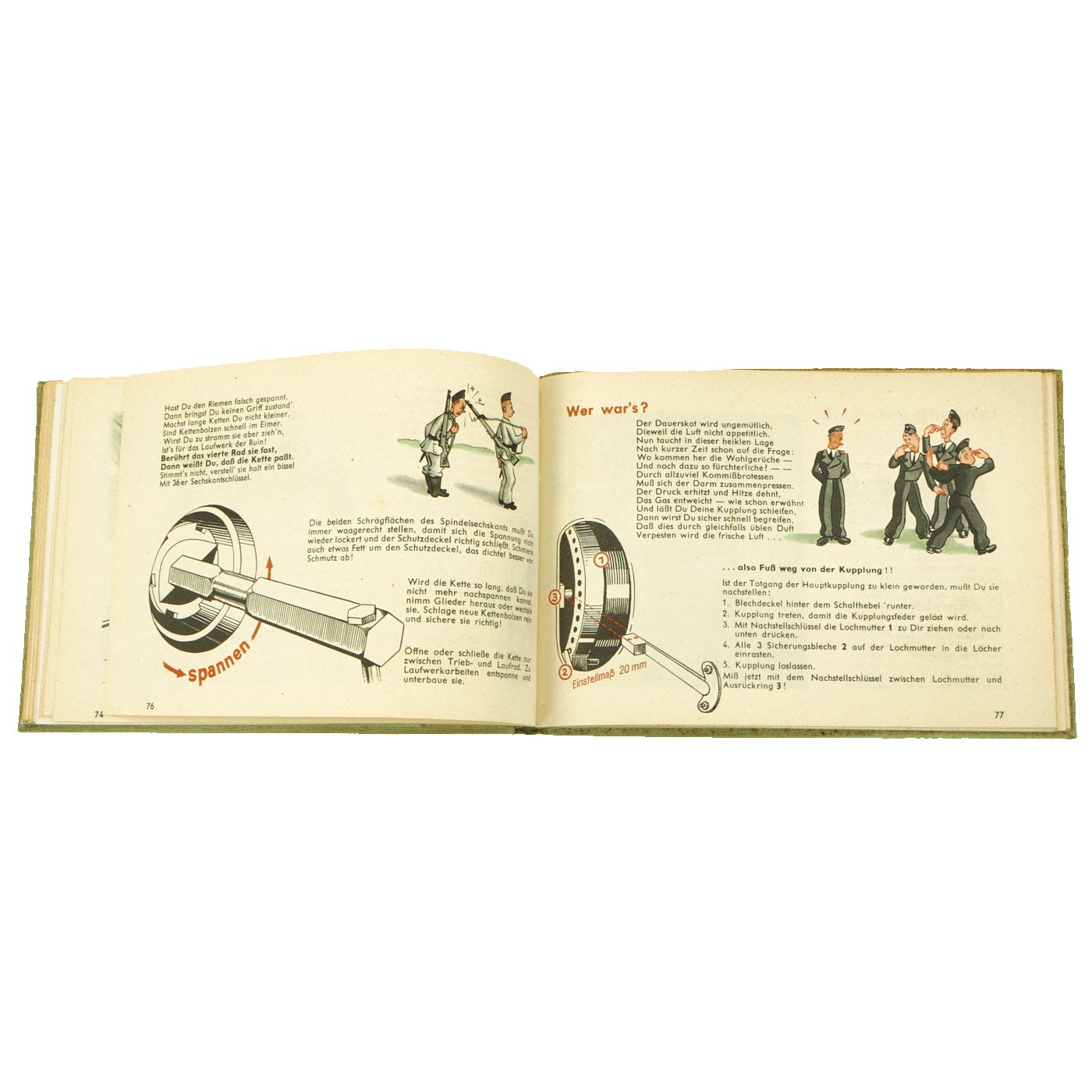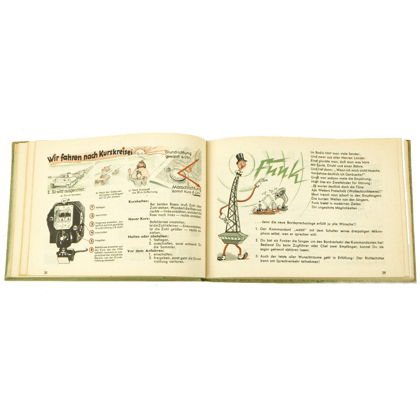 Like other manuals designated as Fibel (basic primer), they were apparently intended to summarise what the crew needed to know for day-to-day use of the tank, and to capture their interest. It is well illustrated in comic-style and much of the text is written as poetry in a humorous manner. The Fibel is remarkably different from the typical tedious style of a German tank manual of that period.