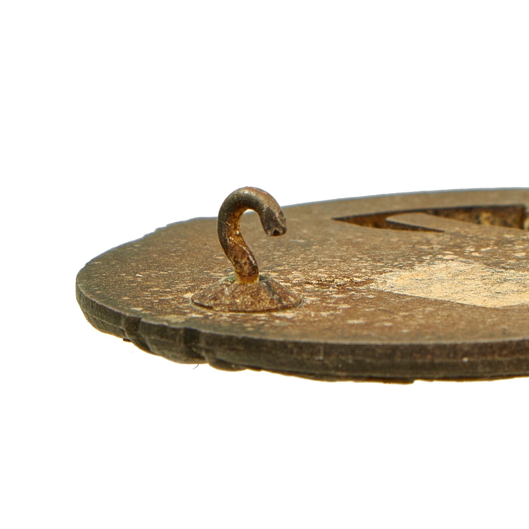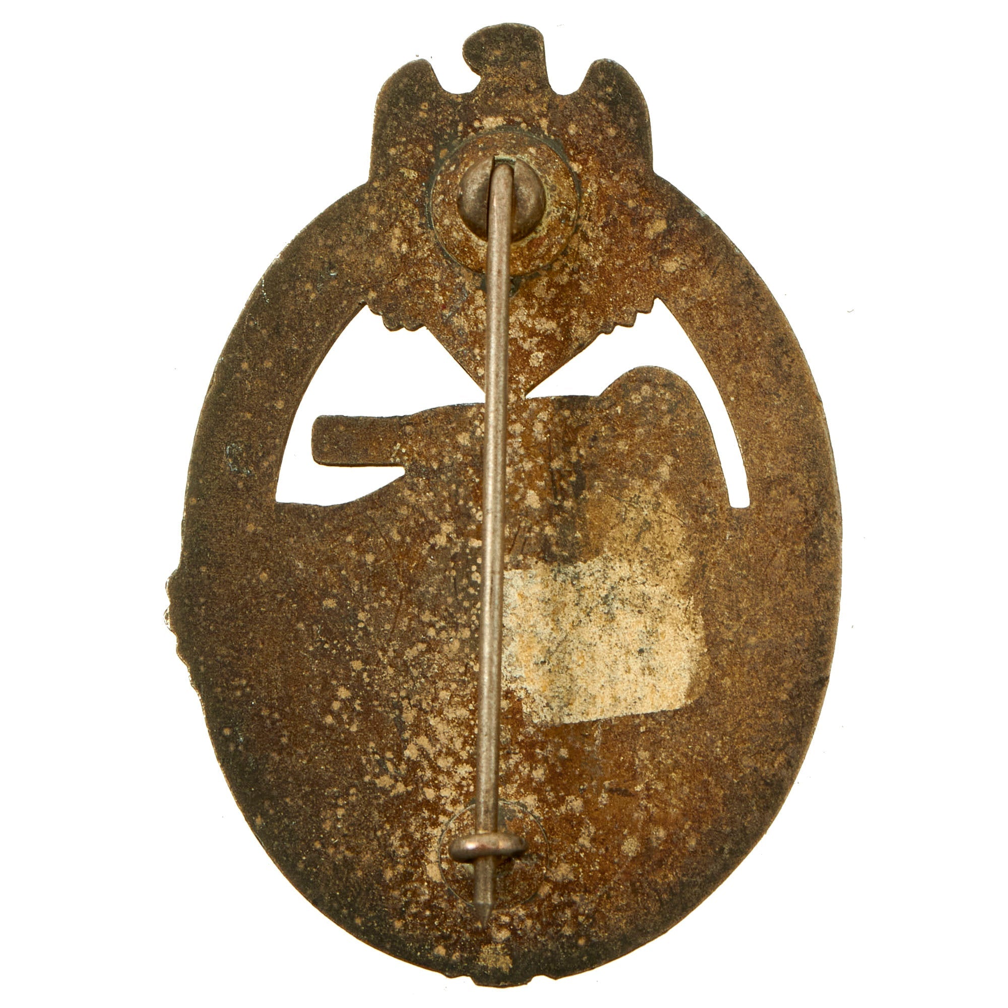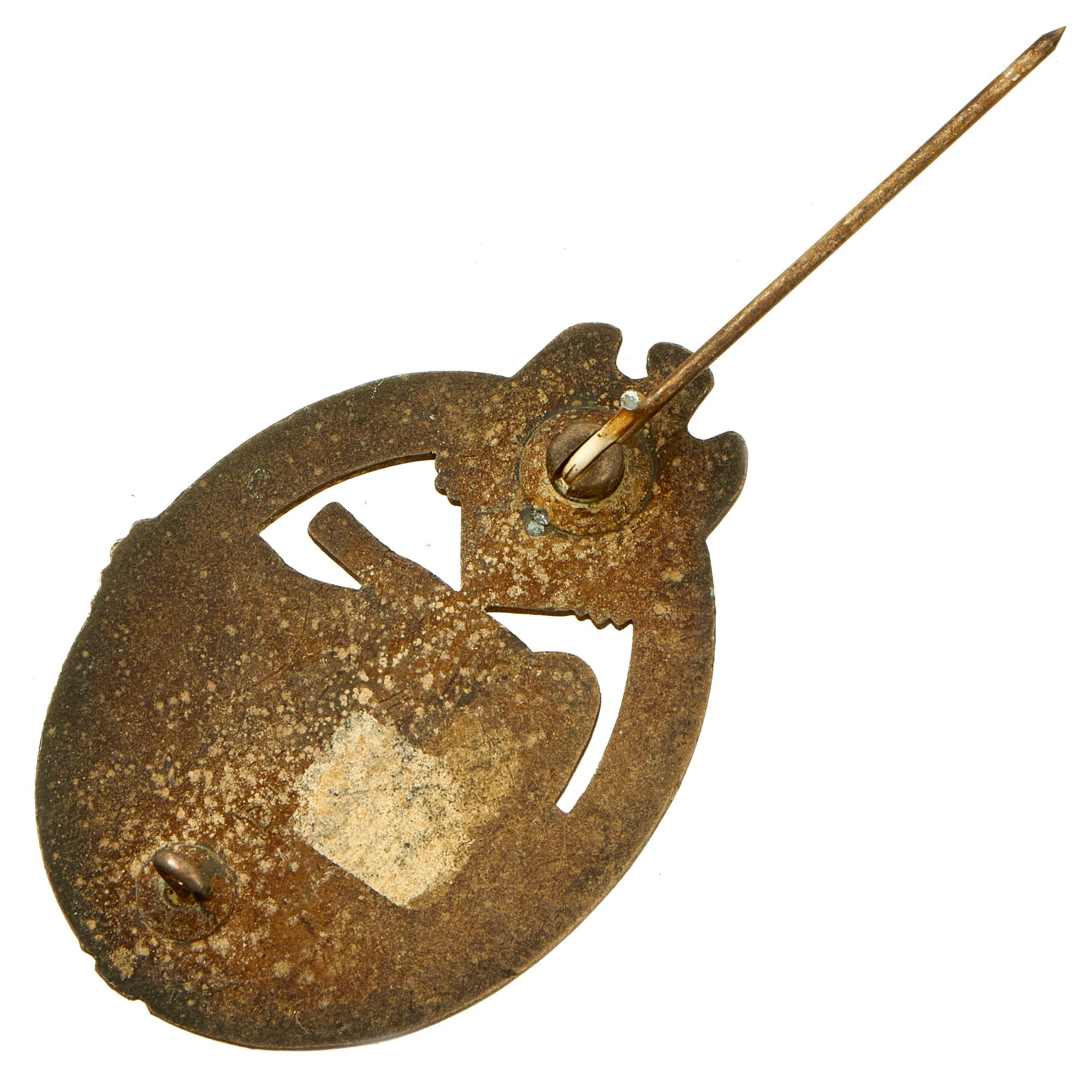 This very nice patinated example in Silver grade is constructed of oval shaped zinc with a silver wash. This example looks to have retained much of the silvering, however it has oxidized and tarnished, giving it a fantastic aged look. The design is iconic, the front has a border of oak leaves tied at the base, a Heer-style national eagle clutching a mobile swas (hook cross) perches at the top of the wreath, a Panzerkampfwagen IV superimposed in the center on grassy ground, with its left tank track extending over the edge of the badge. The reverse plain with a vertical needle style pin, a pressed in round hinge, and a round wire catch with maker mark H / A directly above, which represents Hermann Aurich of Dresden (The "D" shaped letter is actually a Stylized "A"). Measuring 1.64 inches (41.65 mm) W x 2.36 (60.06 mm) H. Offered in overall very good condition, with all the details still present.