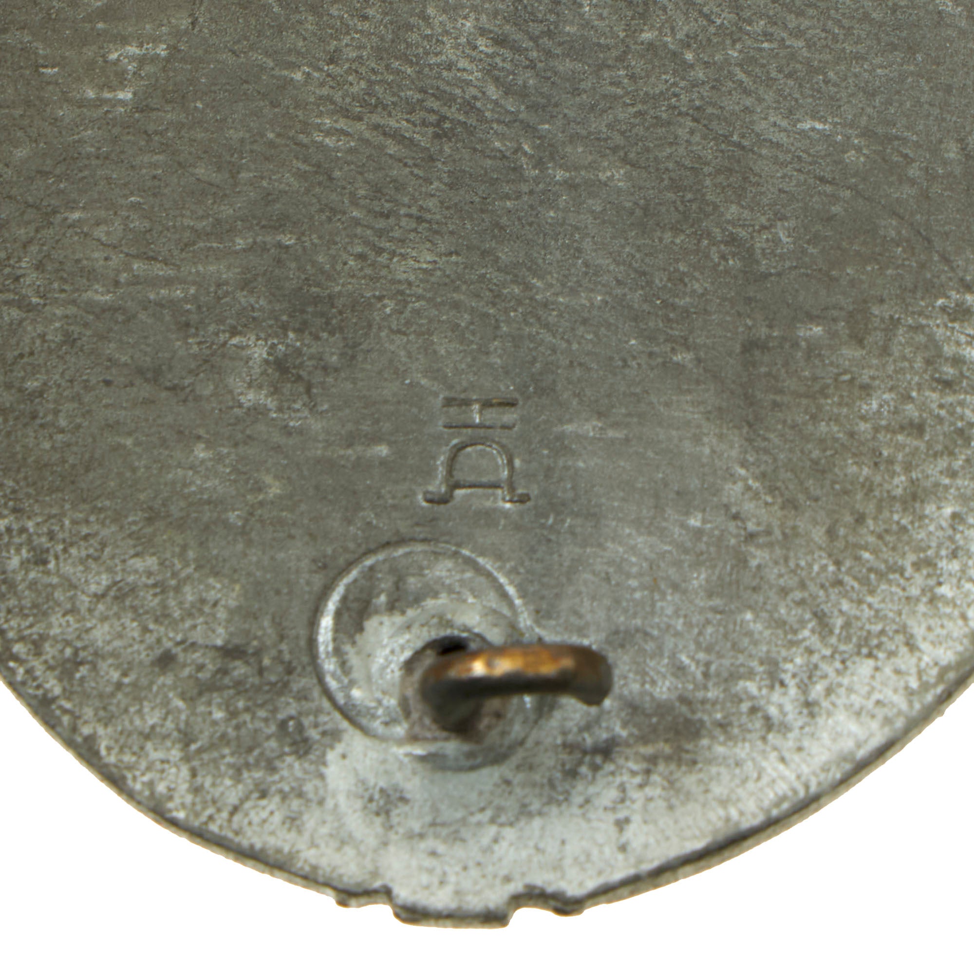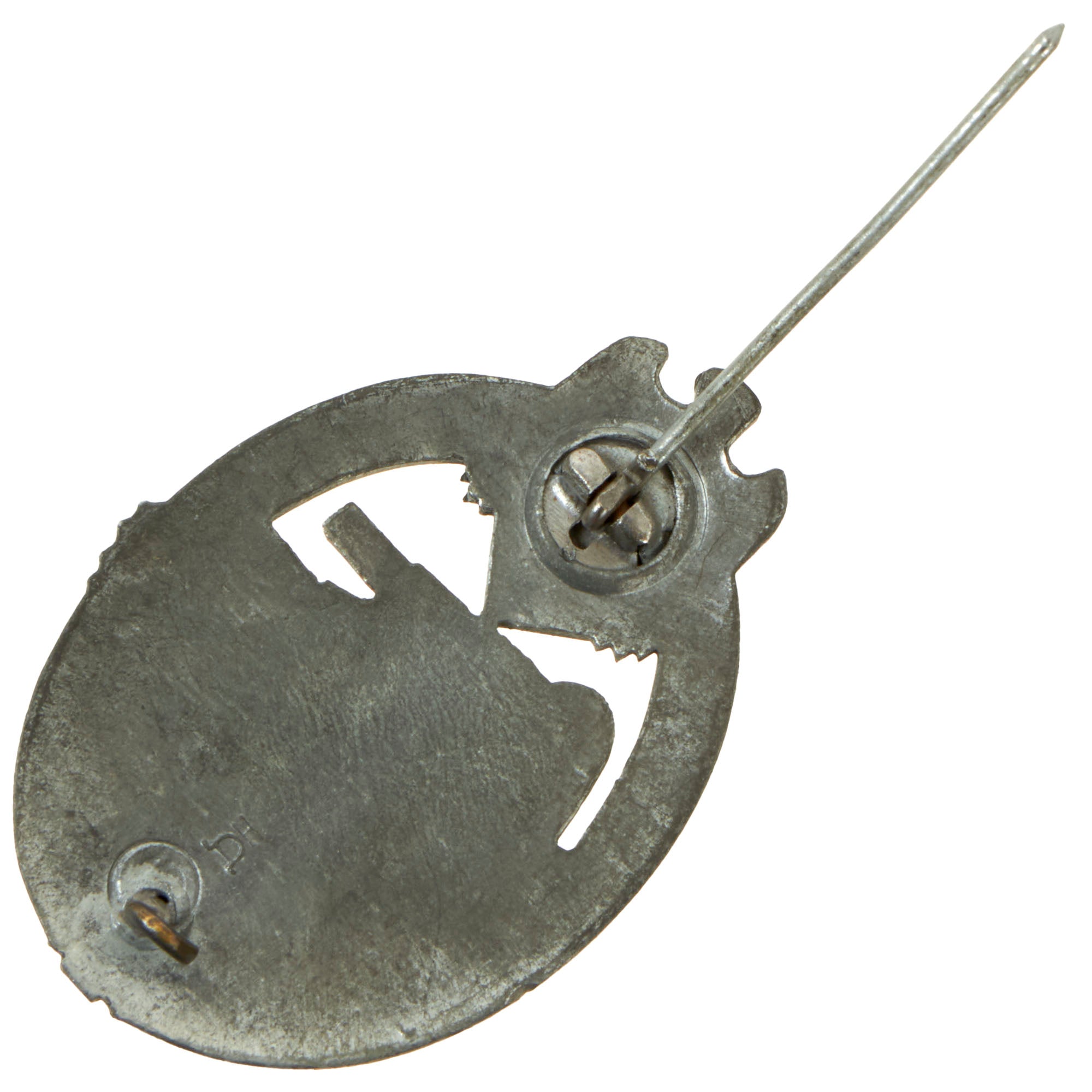 This lovely example in Silver grade is constructed of oval shaped zinc with a silver wash. This example looks to have retained much of the silvering on the front, unlike most that we see, with some fading on the eagle and the reverse. The design is iconic, the front has a border of oak leaves tied at the base, a Heer-style national eagle clutching a mobile swas (hook cross) perches at the top of the wreath, a Panzerkampfwagen IV superimposed in the center on grassy ground, with its left tank track extending over the edge of the badge.