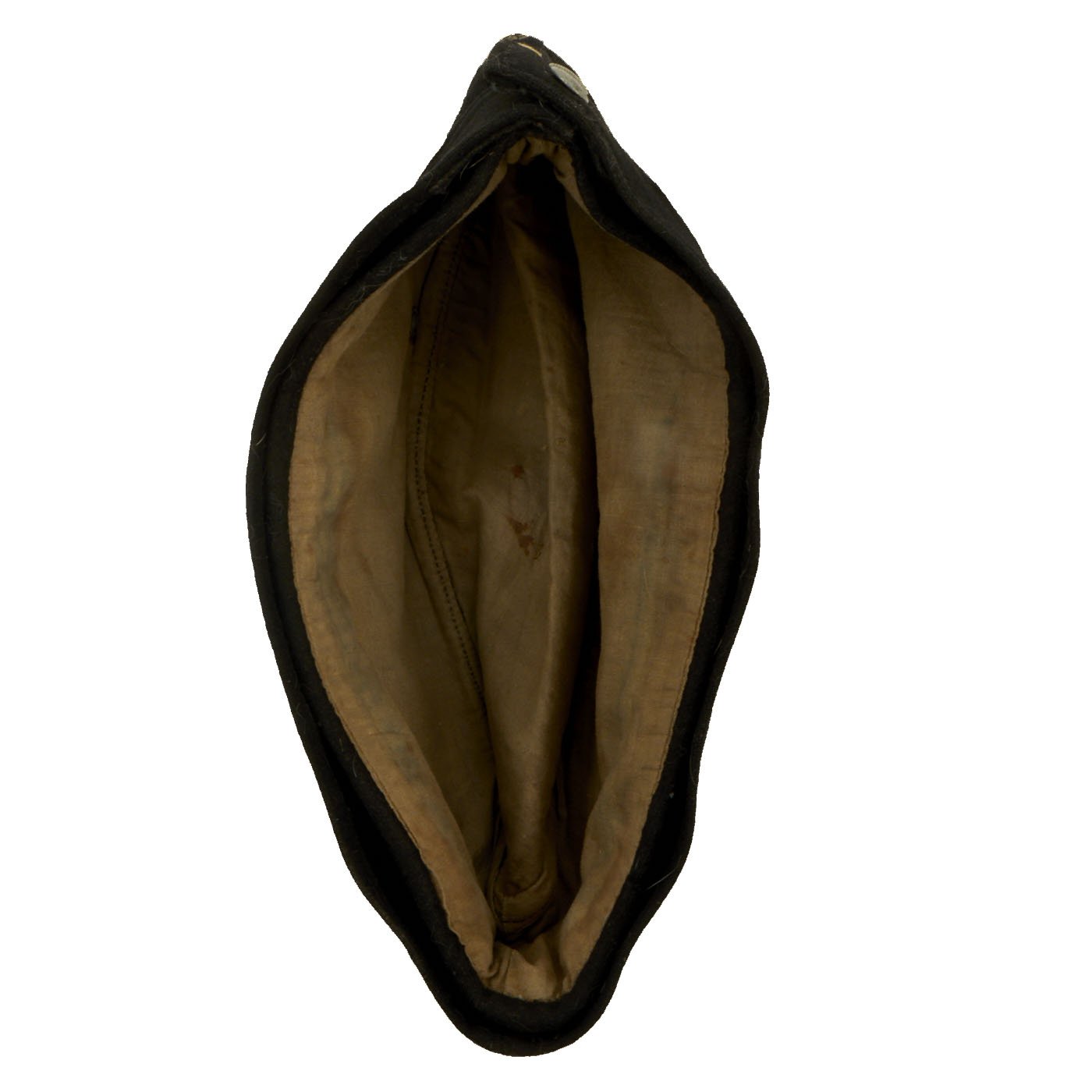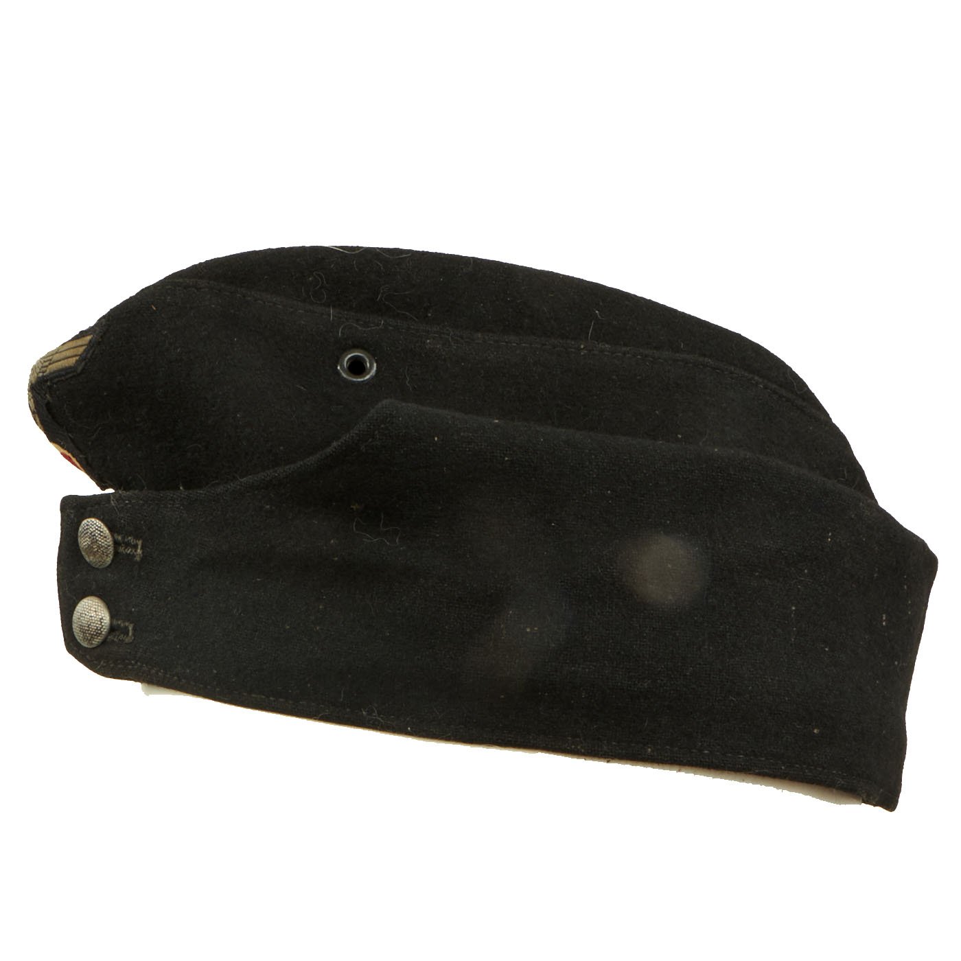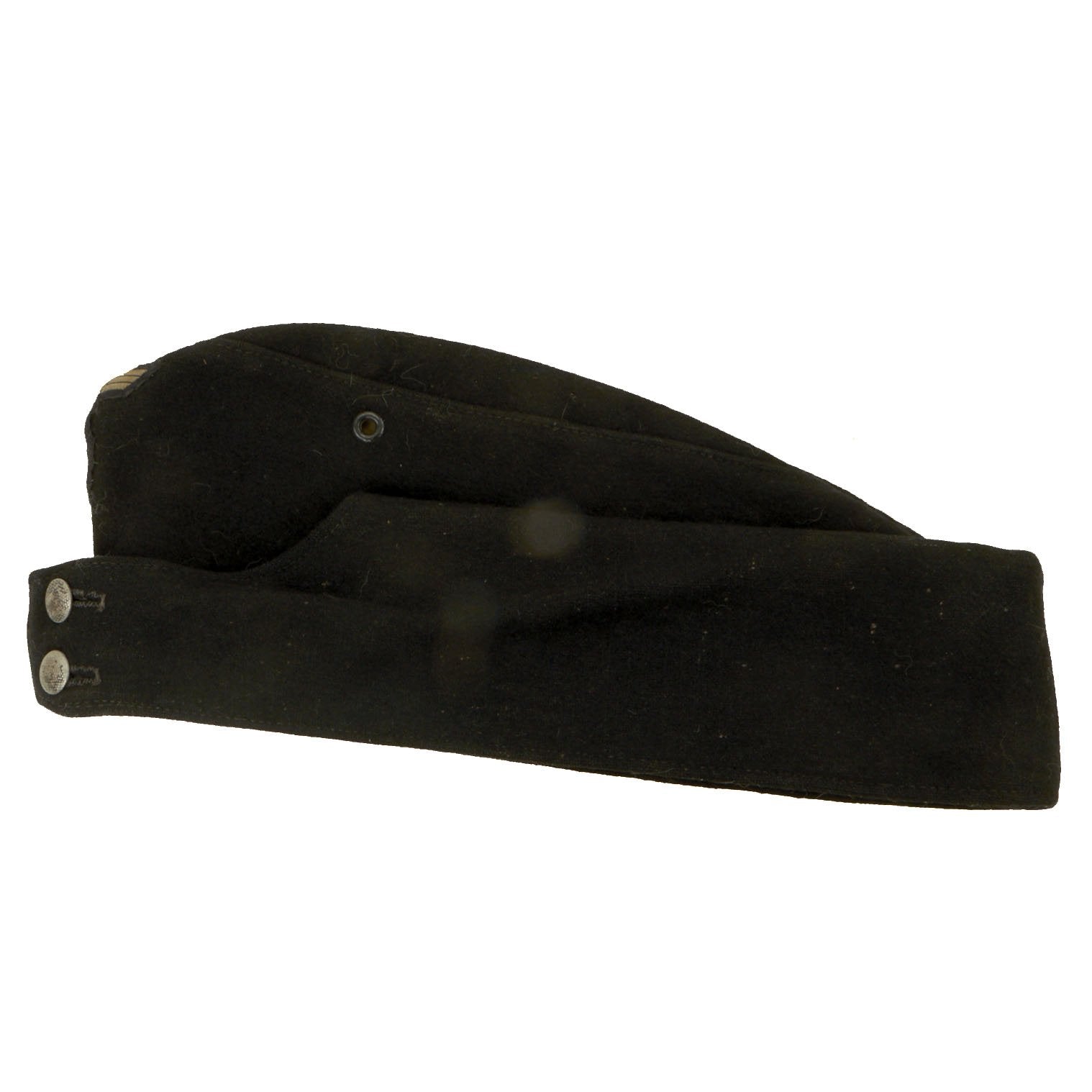 Condition of this cap is very good, with spotted wear to the nap of the outer shell, most likely from use in service. The front buttons are still intact, and the flaps fold down easily. The interior shows moderate service wear, making this a really nice example.