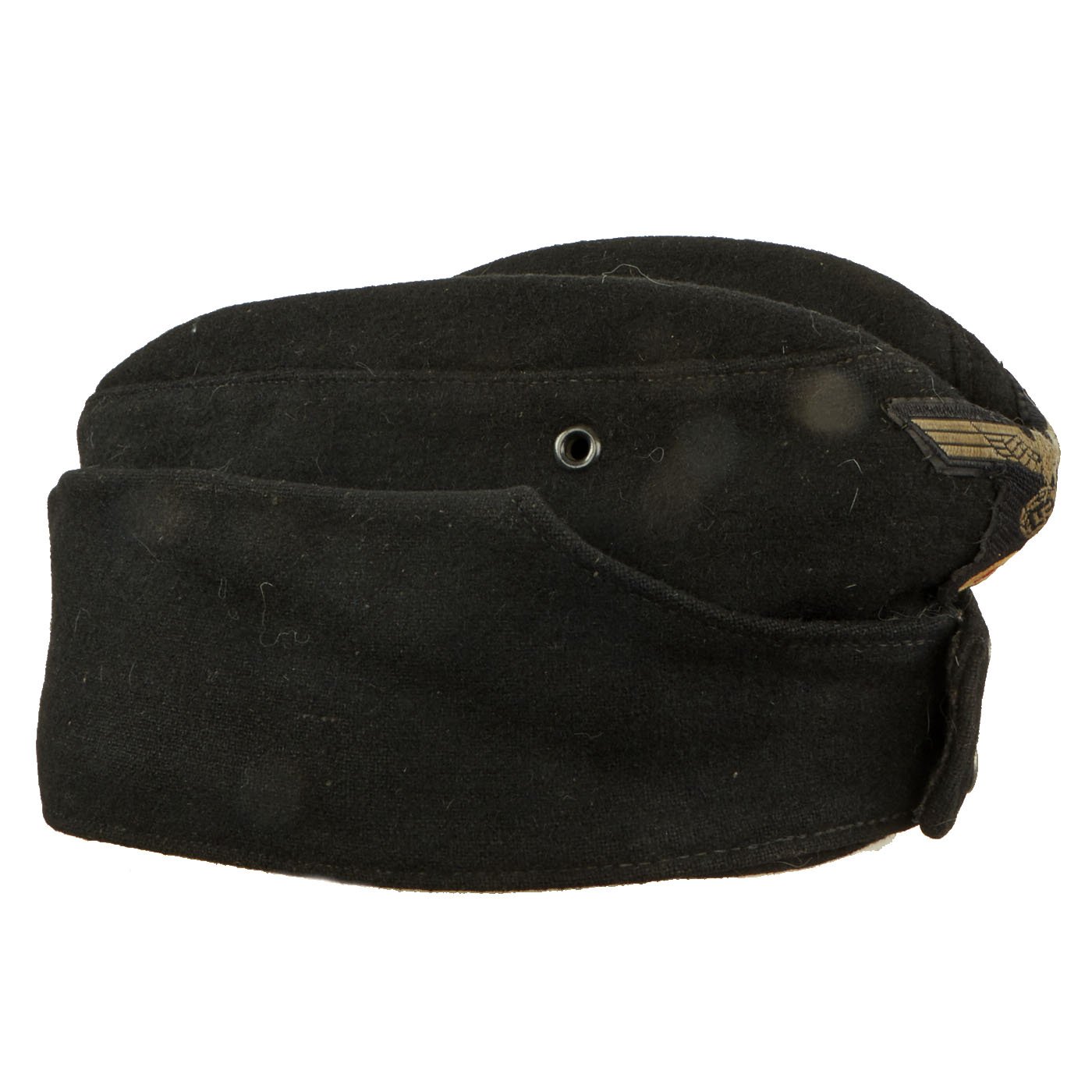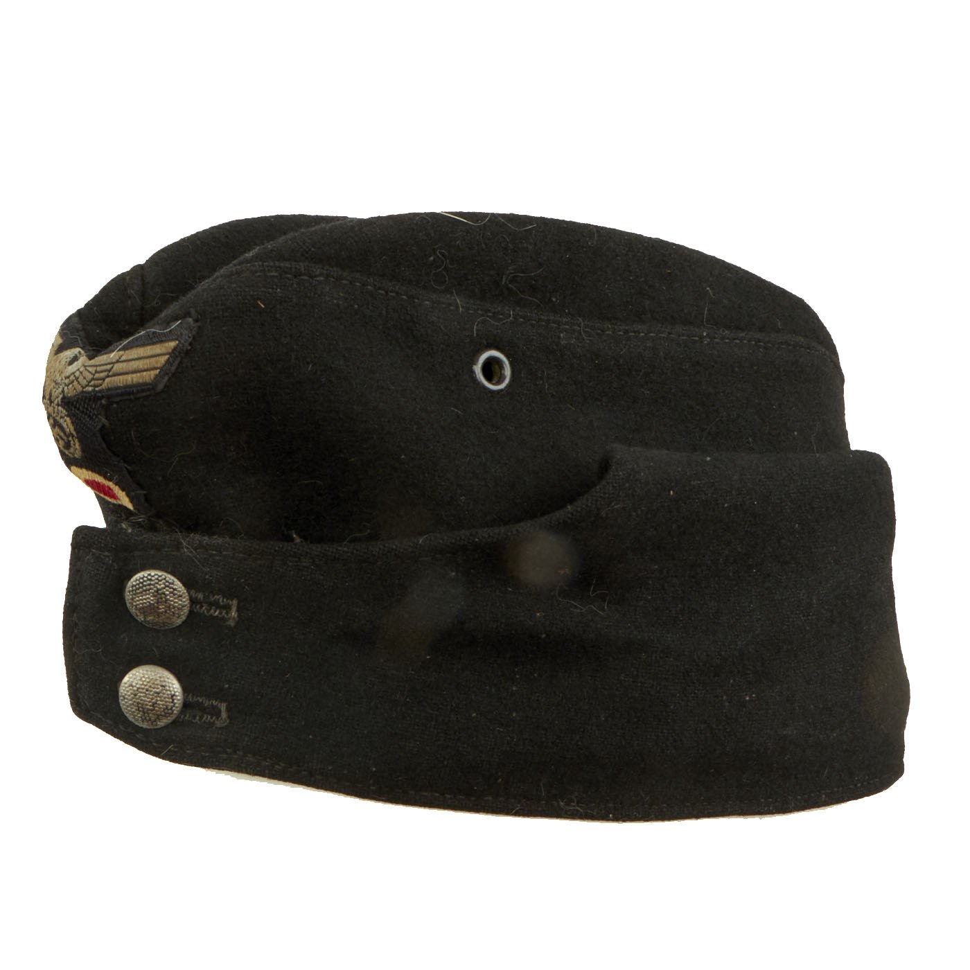 This example is constructed of a black wool exterior for Panzer troops, with a gray cotton lining. It features a fine Panzer BeVo style machine embroidered eagle and tri-color cockade on the same piece of attached fabric, with gray thread on a black green base for the eagle, the standard Panzer Field colors. There is no piping or soutache, so this was for an enlisted man. Size seems to be about a 55-56cm.