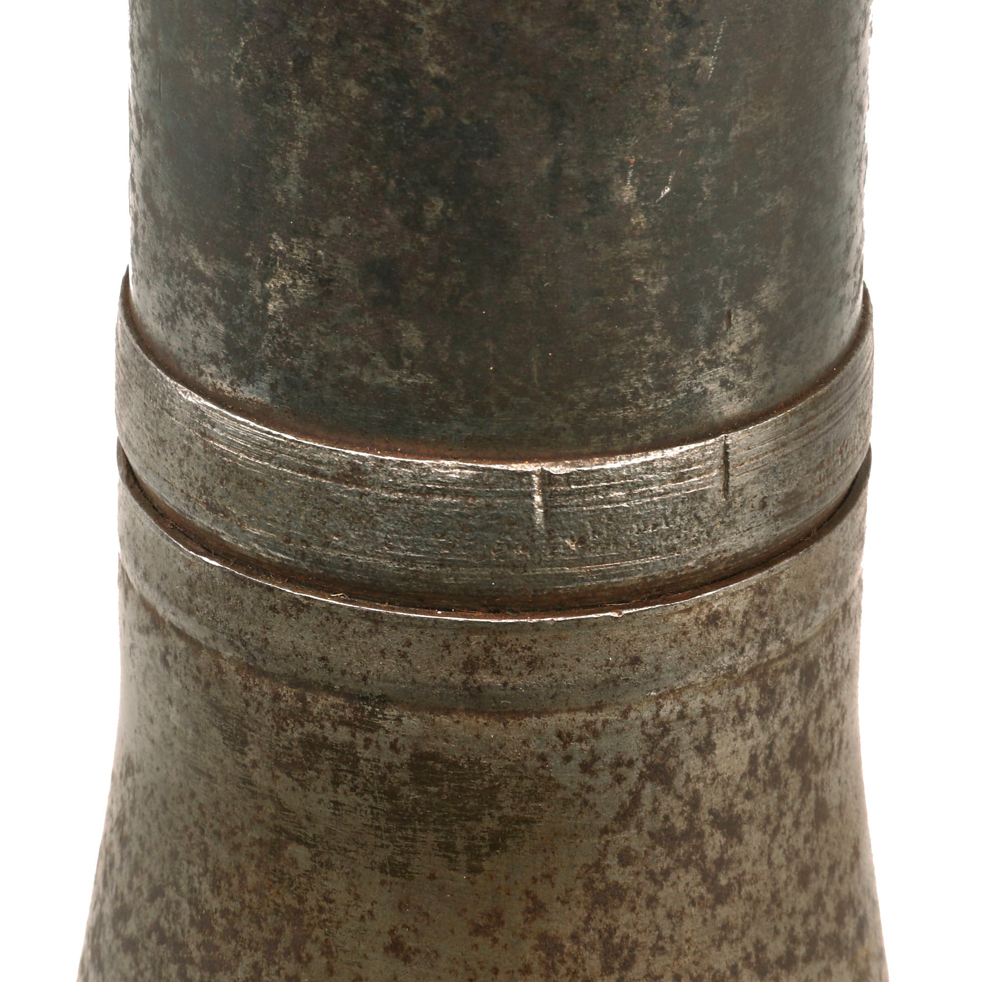 This example measures roughly 29½” and is in fair condition with moderate oxidation across. The fuze does not appear to unscrew, likely requiring some lubricant. The shell casing, originally plated steel, has lost some of the original plating.