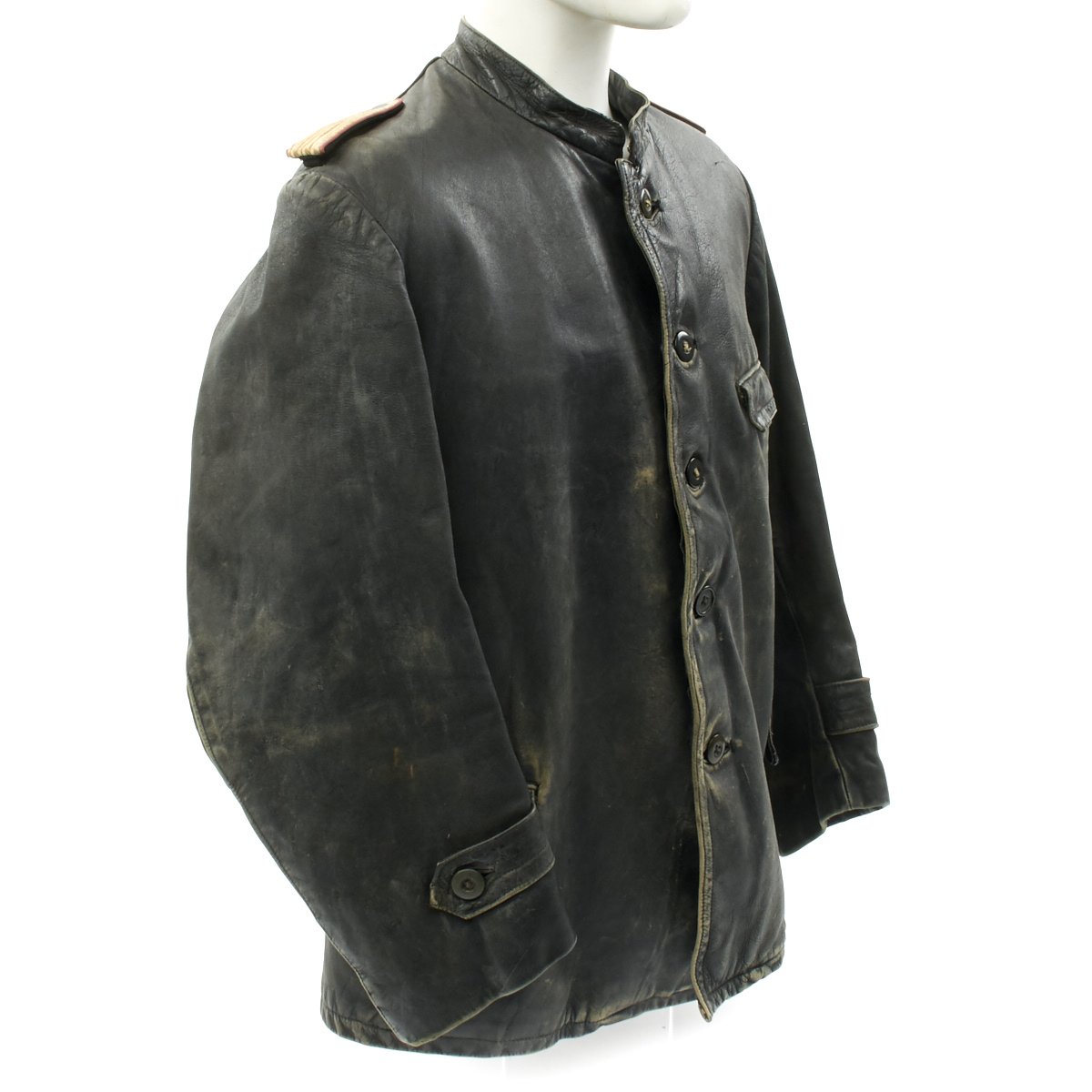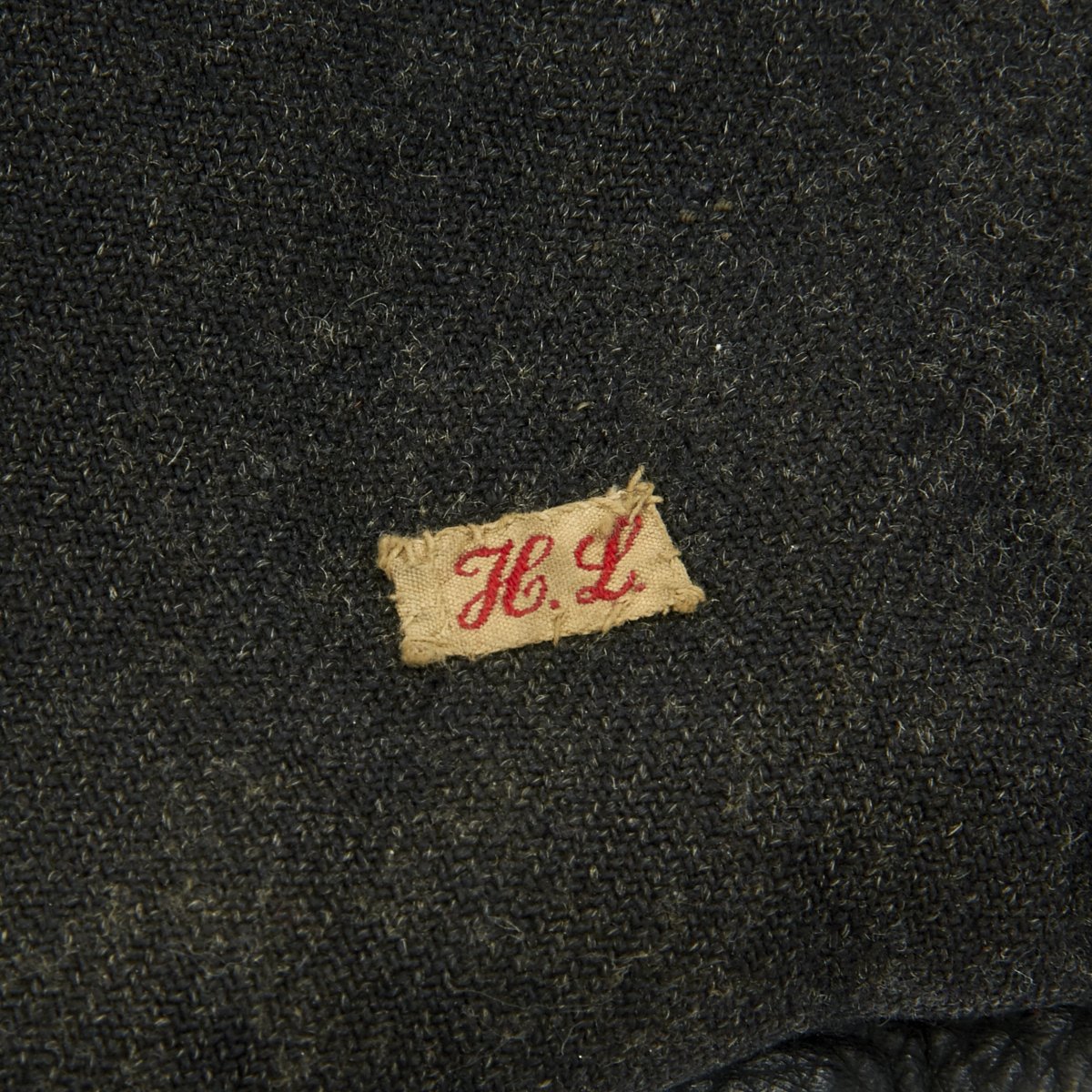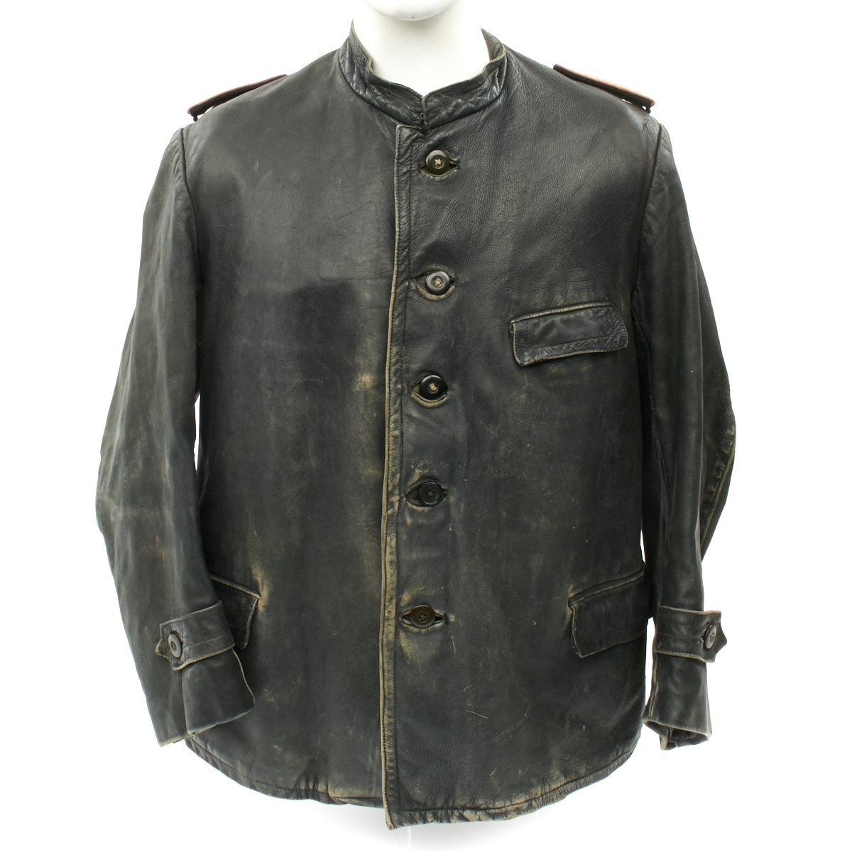 This example is a very high quality, German made private purchase, non-regulation, single breasted, black leather construction fully lined with wool, hip length jacket with ring collar. Has large Bakelite buttons and owner's initials HL stitched to the inner lining. The jacket has one horizontal breast pocket with flap as well as two waist pockets also with flaps. The straight cut sleeves have a single button closure to the cuffs.