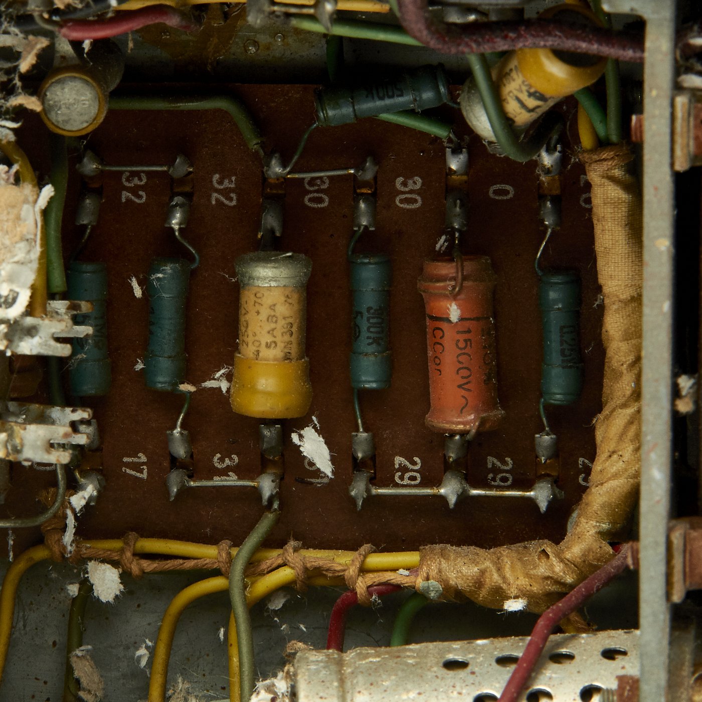This is a heterodyne receiver and a Telefunken product. Receiver chassis is contained in a strong case, and has a cover that clips to the front panel. There are no lugs or projections since mounting hardware is built into tanks. On top of the case are a pair of brass stripes for grounding purposes. Two cables provide the necessary connections between transmitter and receiver - one for side tone, and the other for the antenna.