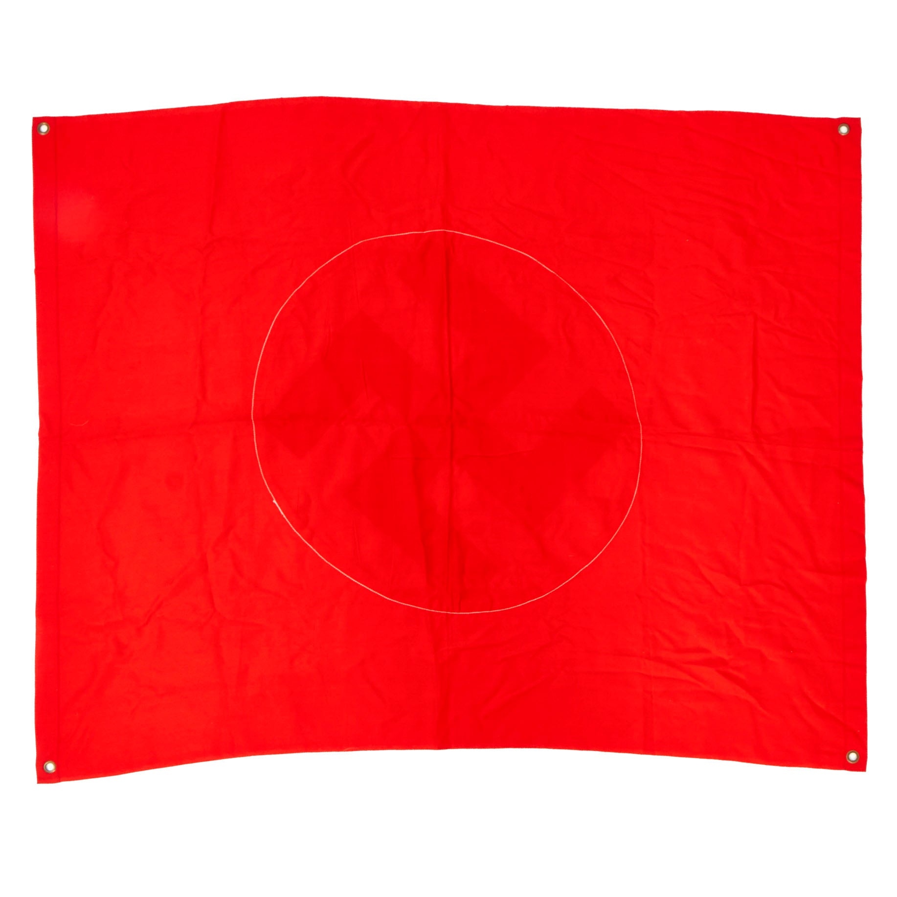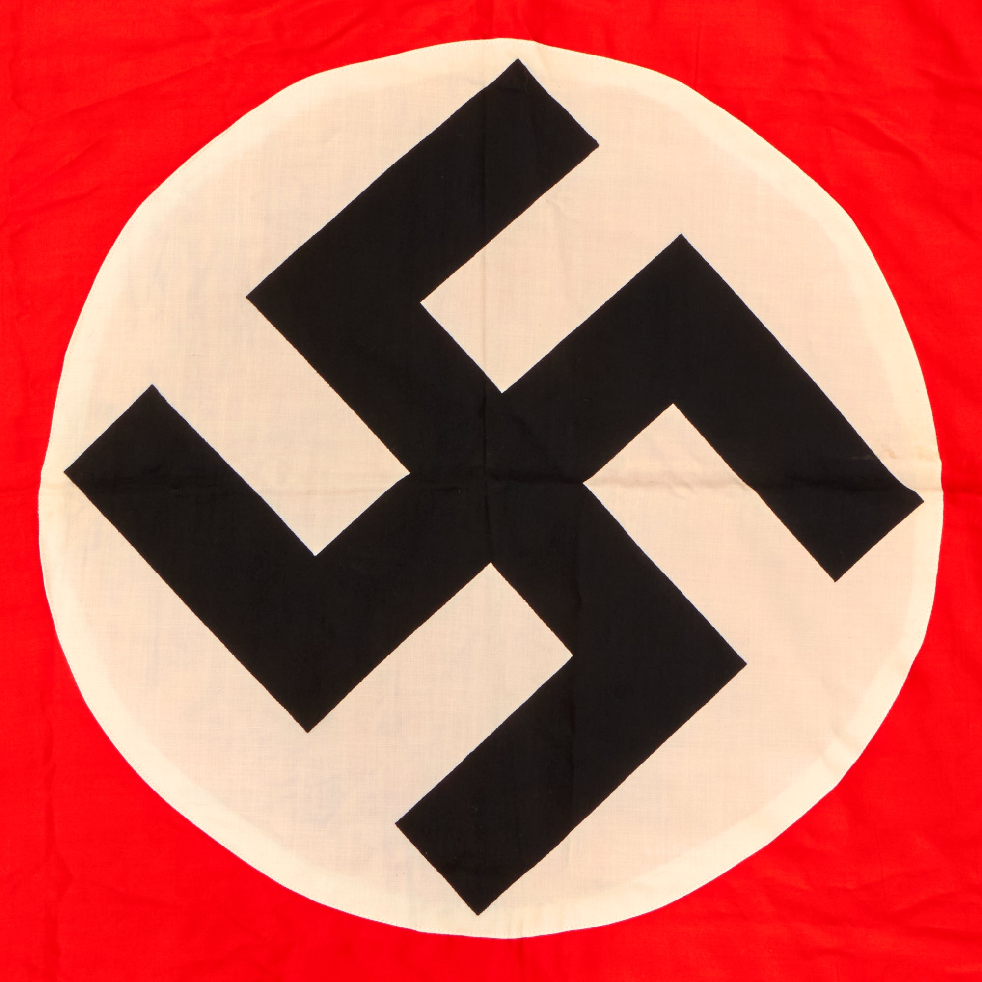 Original Item: Only One Available. This is an excellent unissued condition multi-piece construction German WWII Swas (hook cross) identification flag used for Panzer tanks and other vehicles. It measures approximately 32 x 40 inches and has the standard NSDAP Swas (Hook Cross) dyed onto a circular white field. This was then sewn onto the red cotton body of the flag. It shows no evidence of having been issued in the field, and shows just a bit of light staining from storage in areas. It is really in fantastic condition, and would be very hard to improve upon. There are some small manufacturing errors like the stitching including some fold over of the circle, being such a large style of flag this was common to see.