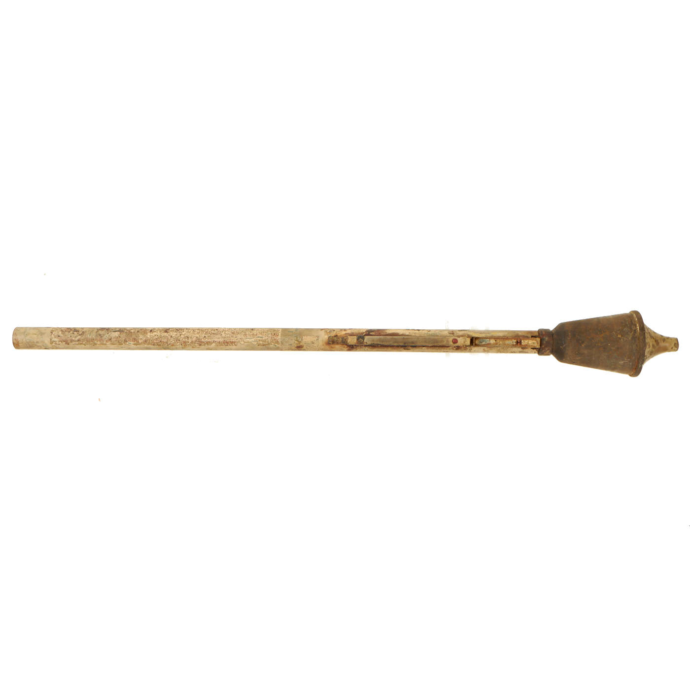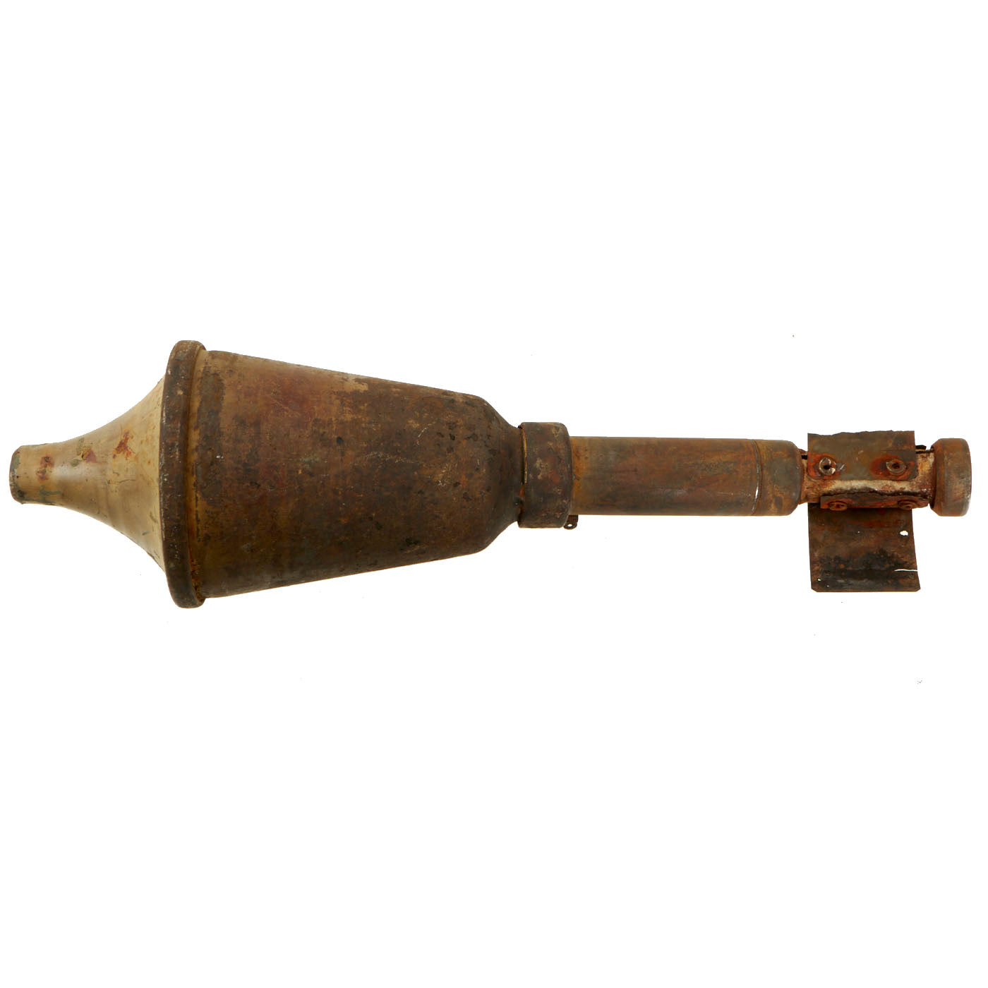 The Panzerfaust and rocket have both been demilitarized according to specifications by the BATF. It still retains some of its original paint, including remnants of the original early style painted rocket label and some of the original red stenciling on the body of the launcher tube.