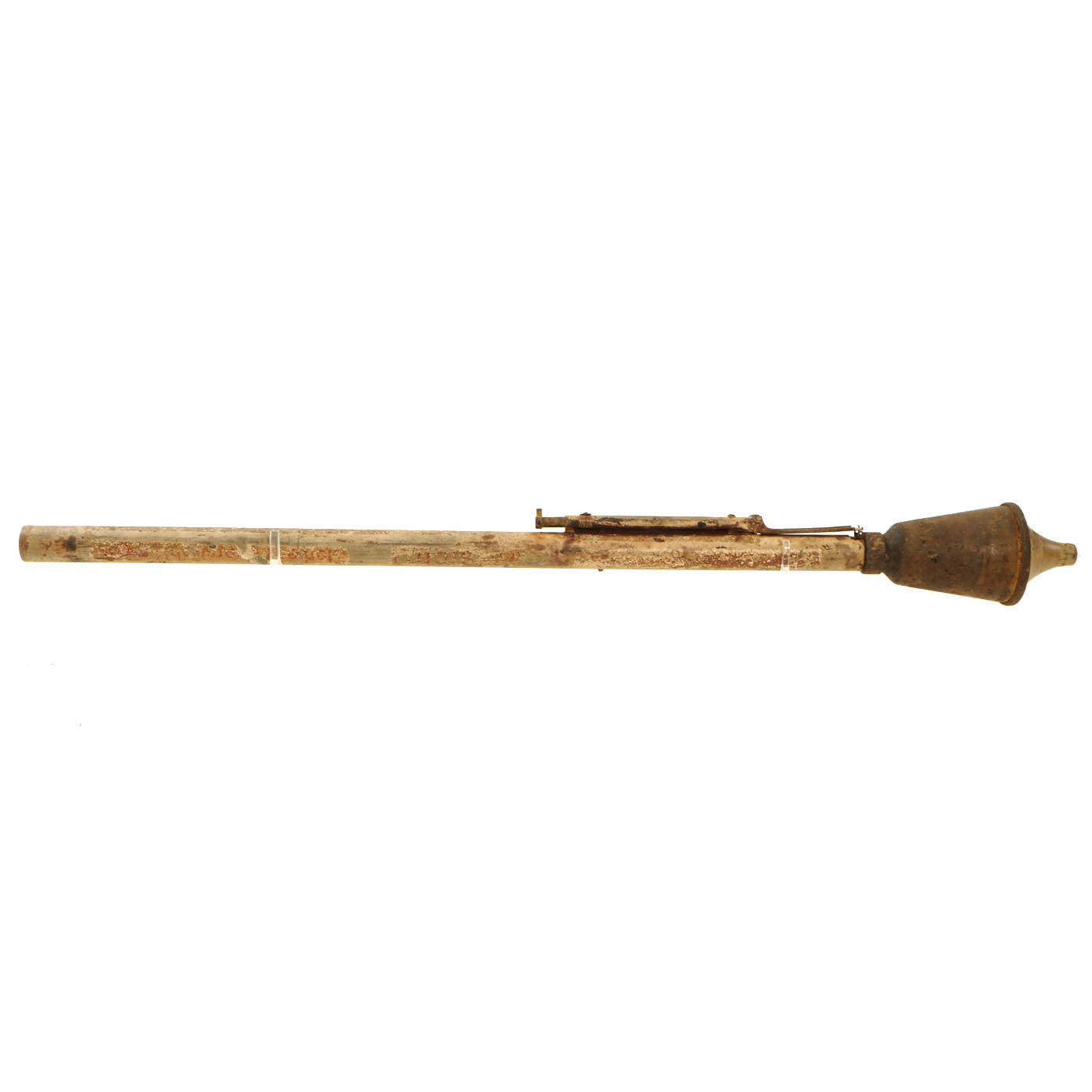 The original leaf sight and plunger trigger assembly are still present. The rocket head has been emptied of explosive and the propellant, as found in the tube, has been discarded. One of the delicate sprung steel fins of the rocket is present and still attached.
