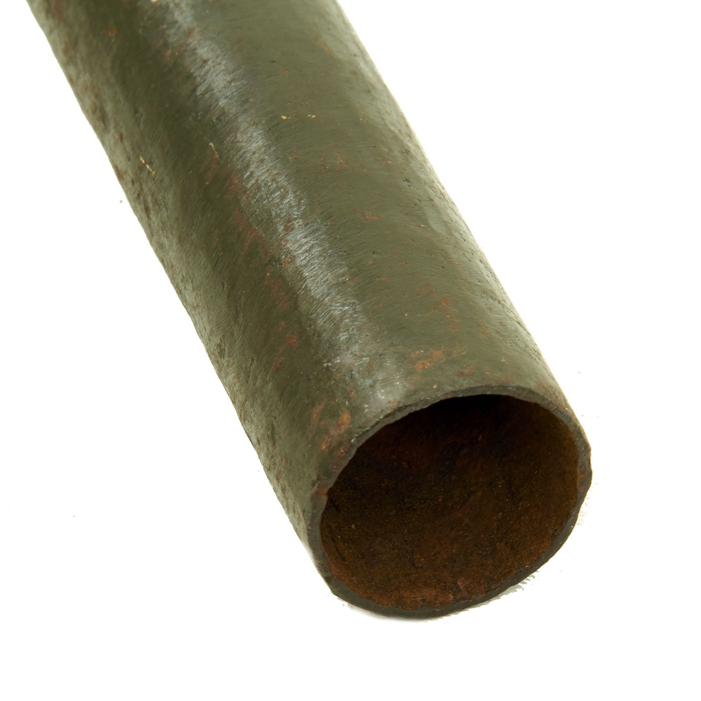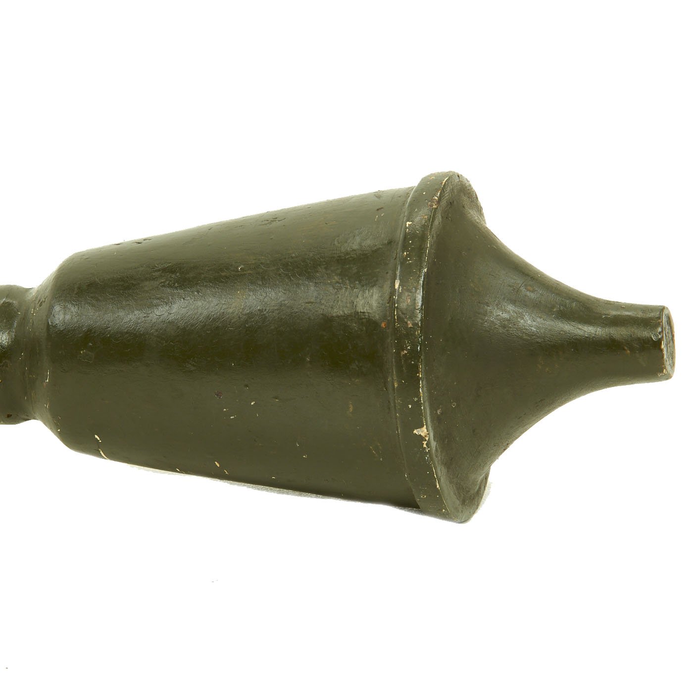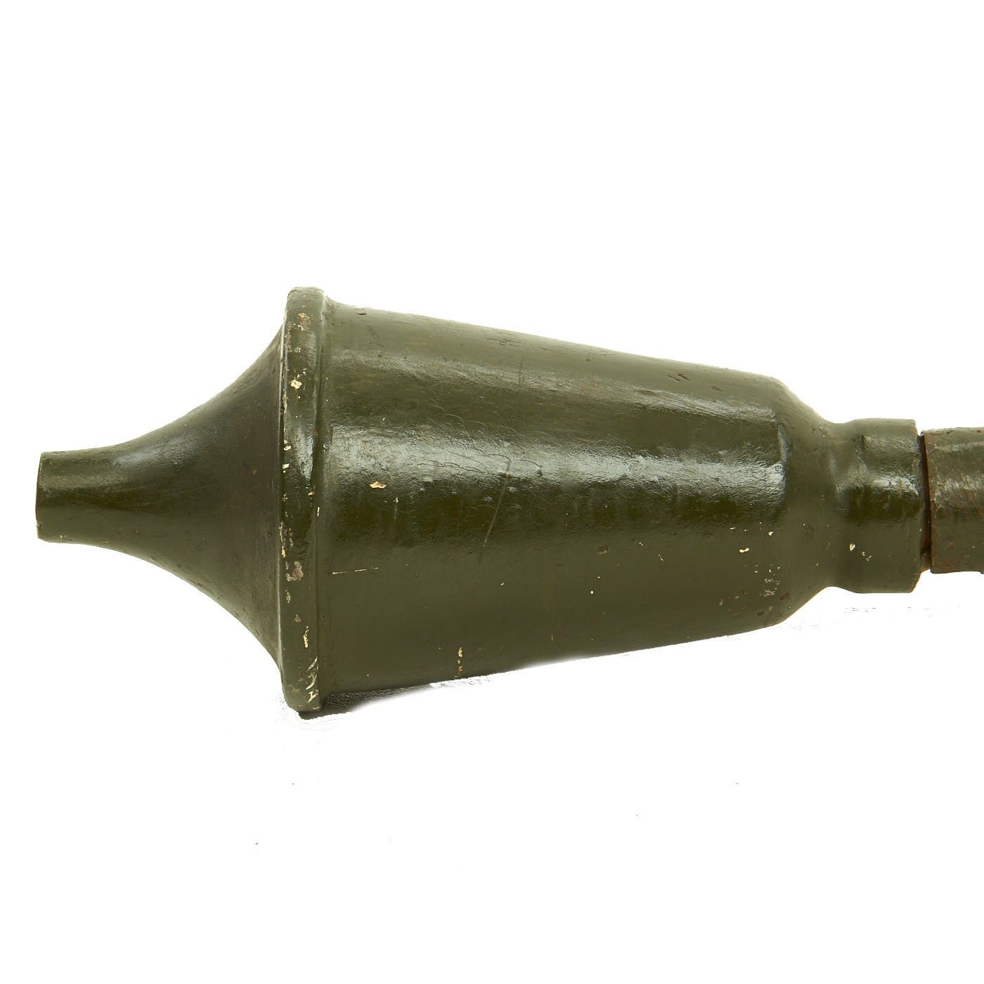 This example, acquired from from a recent auction, has been demilitarized according to specifications by the BATF. From the looks of it, this item was originally a battlefield pickup, and then converted into a movie prop. It was repainted green, and all of the original markings are no longer visible. The rocket is now permanently attached to the launcher.