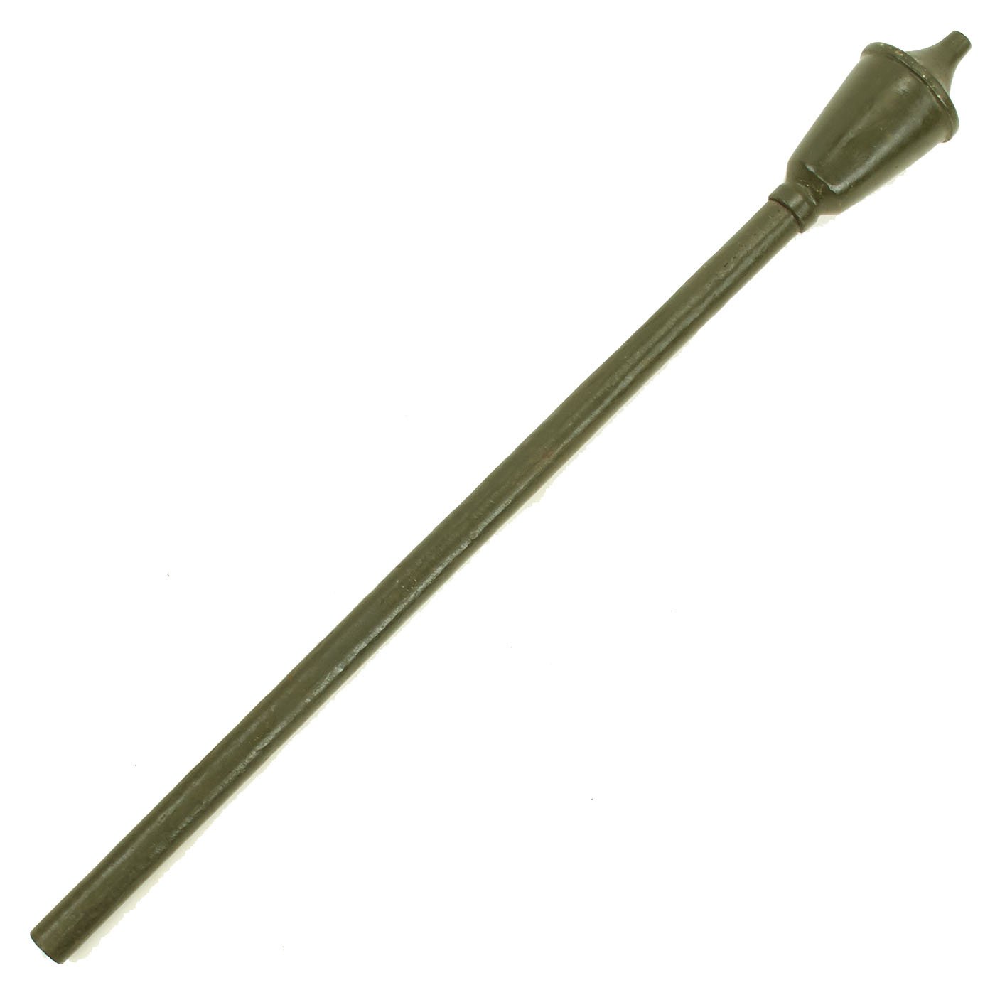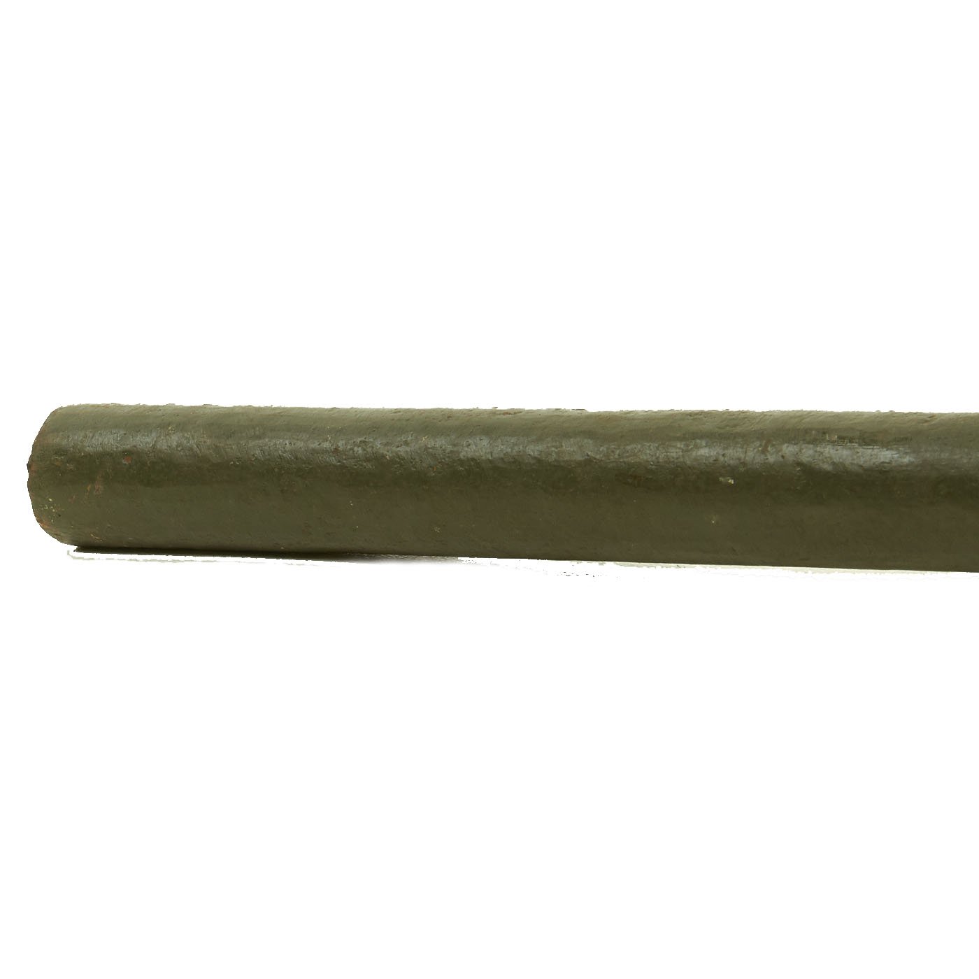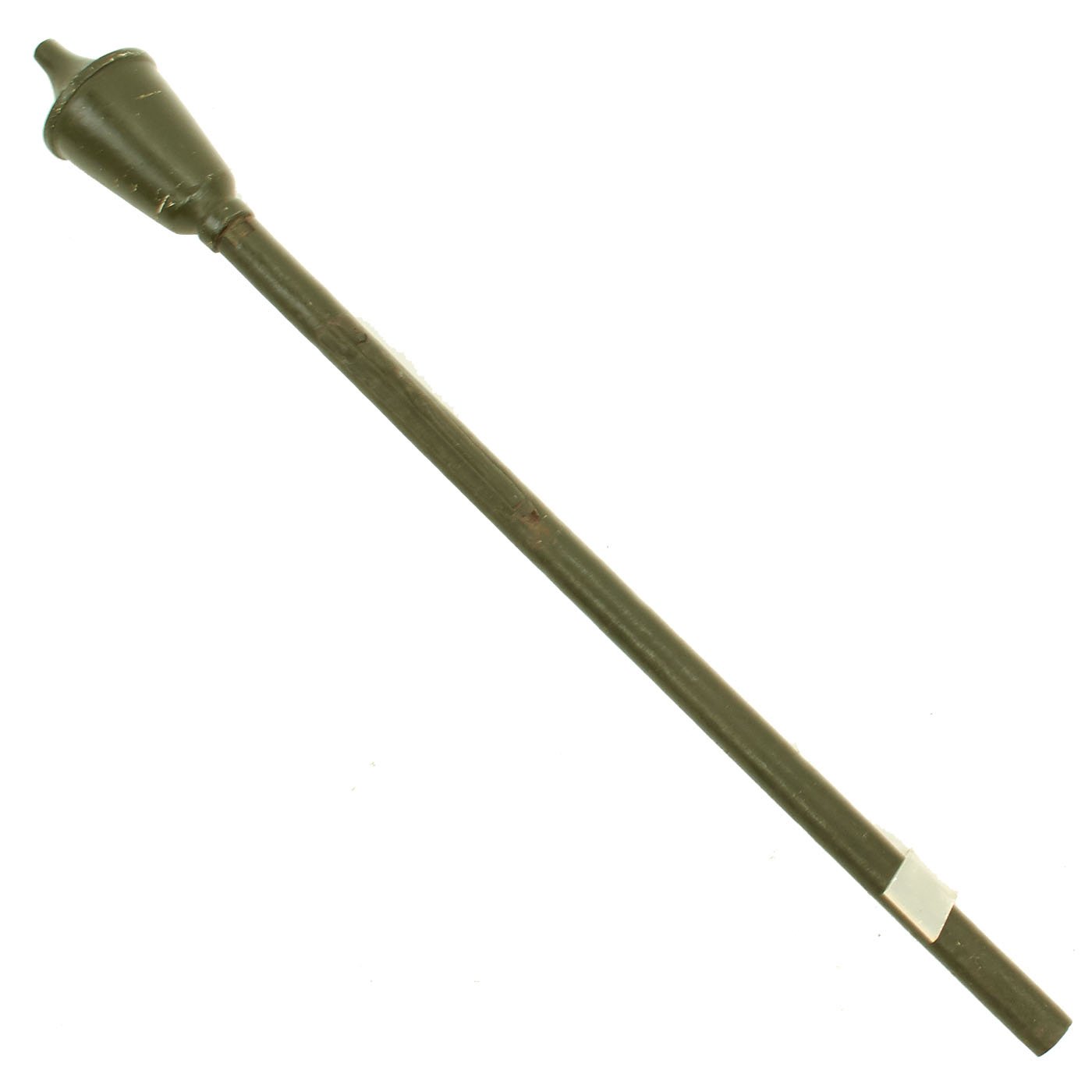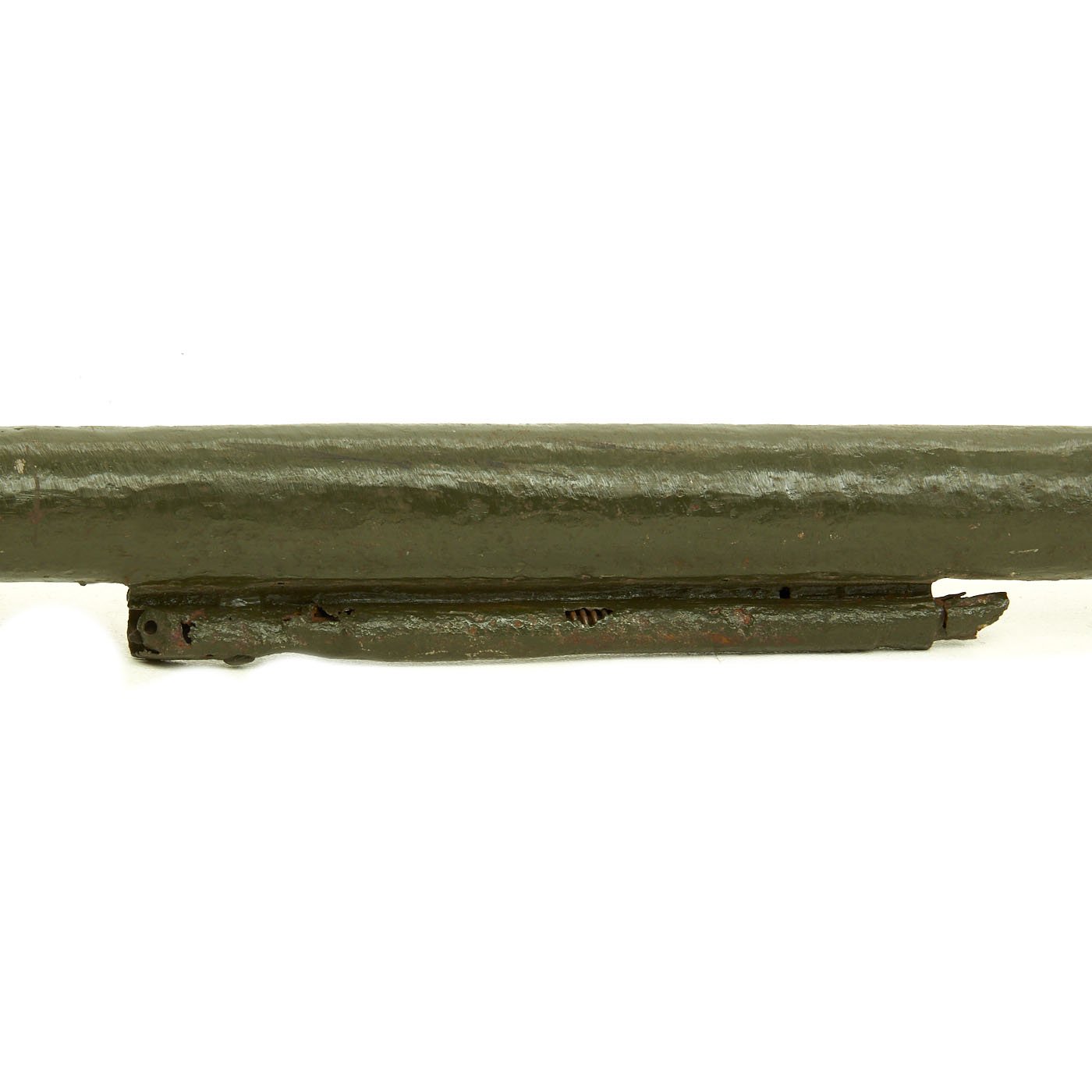 This example, acquired from from a recent auction, has been demilitarized according to specifications by the BATF. From the looks of it, this item was originally a battlefield pickup, and then converted into a movie prop. It was repainted green, and all of the original markings are no longer visible. The rocket is now permanently attached to the launcher.