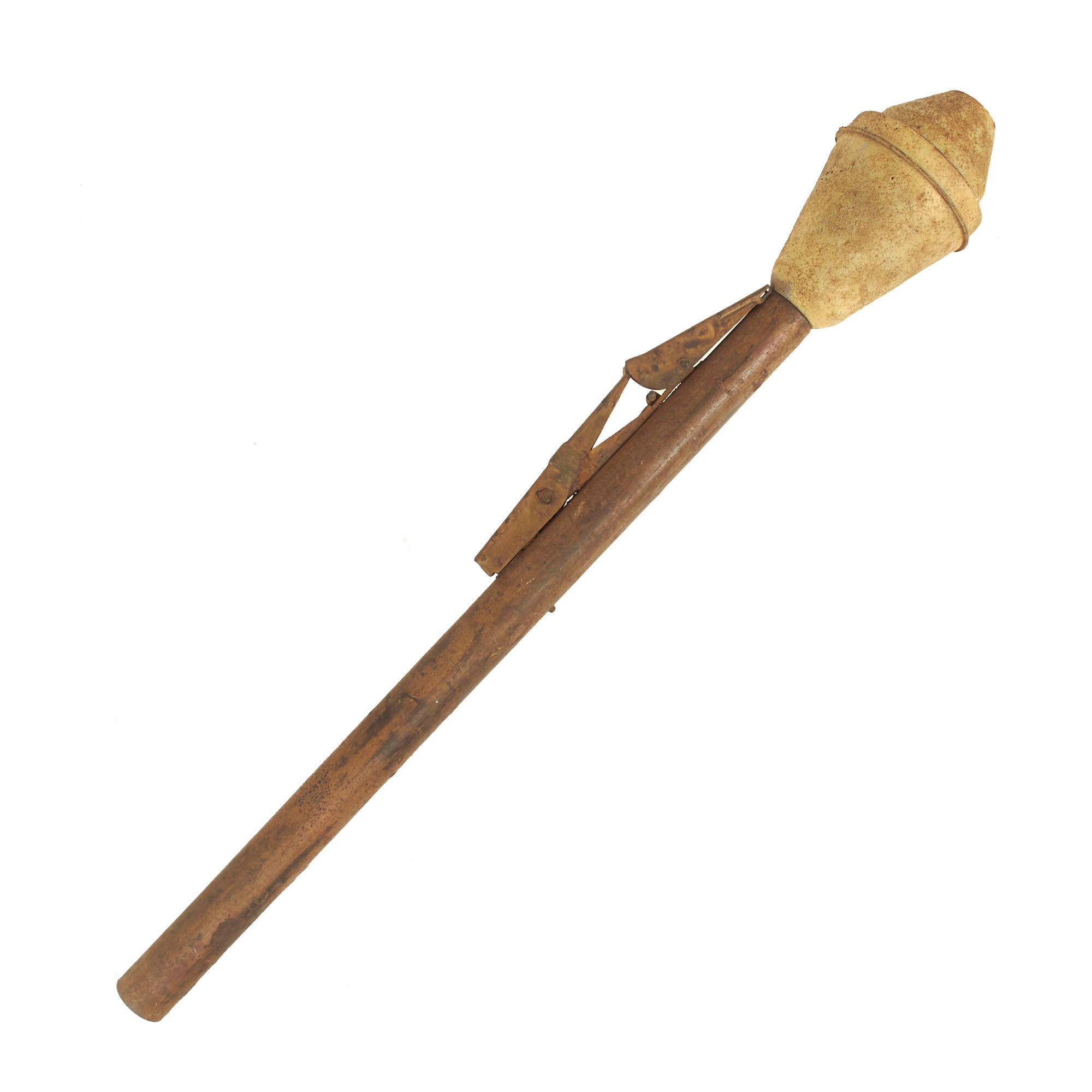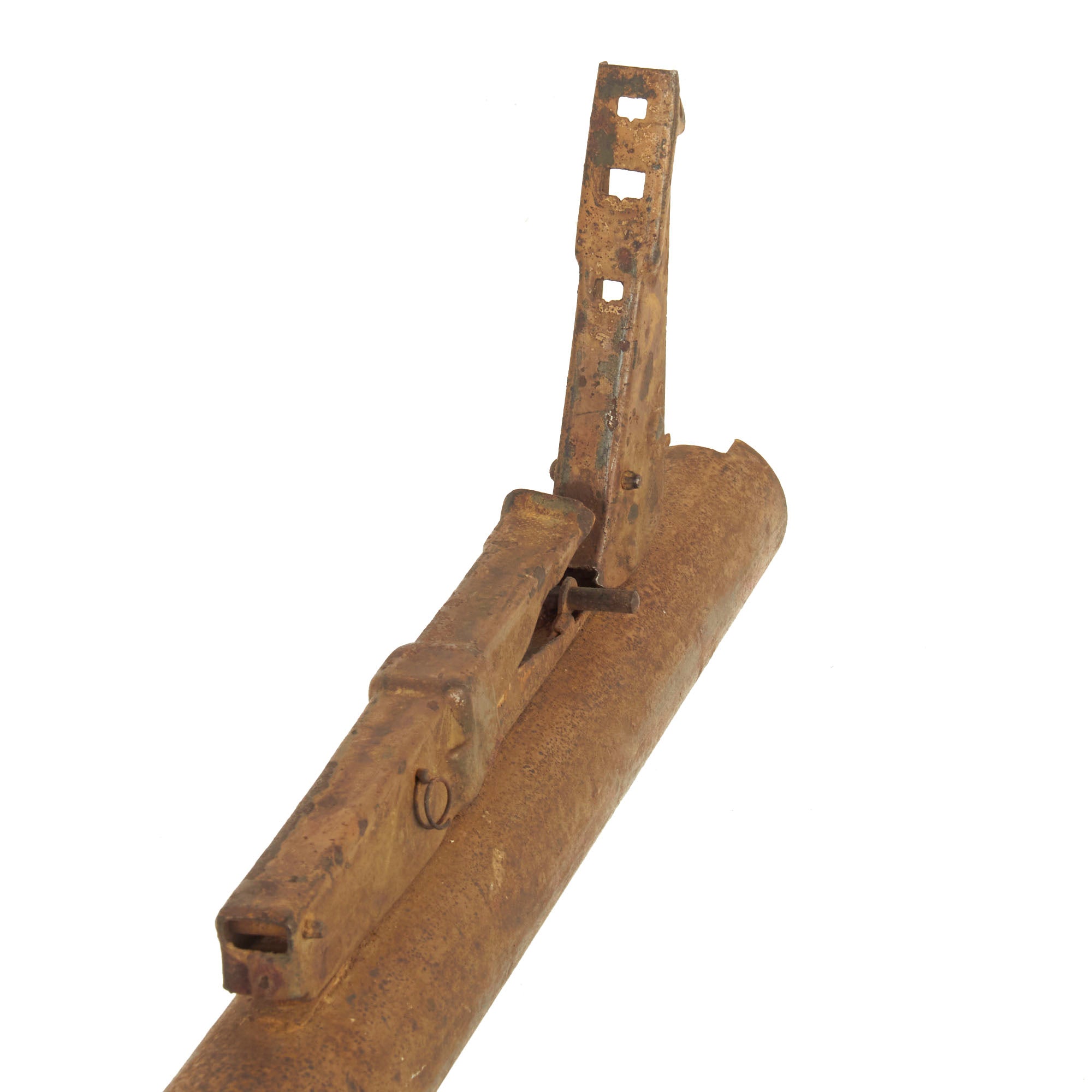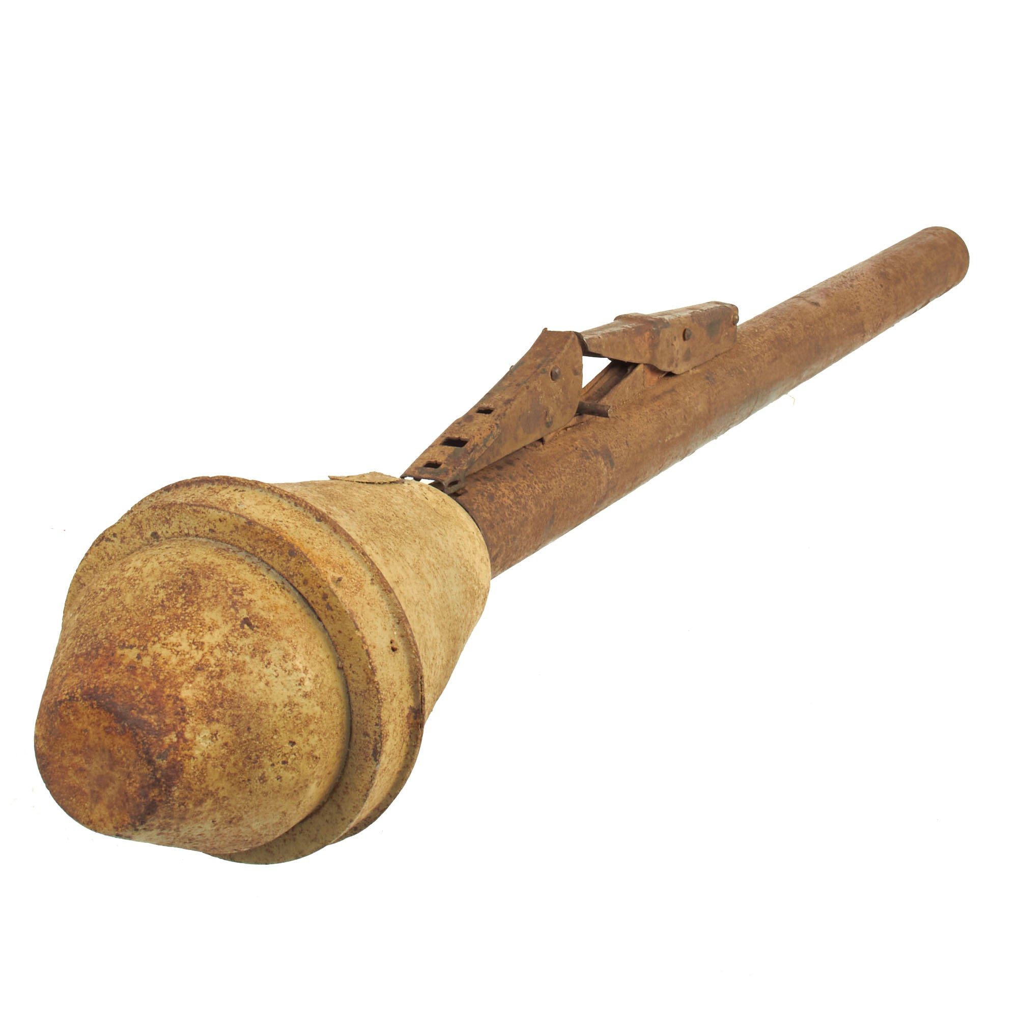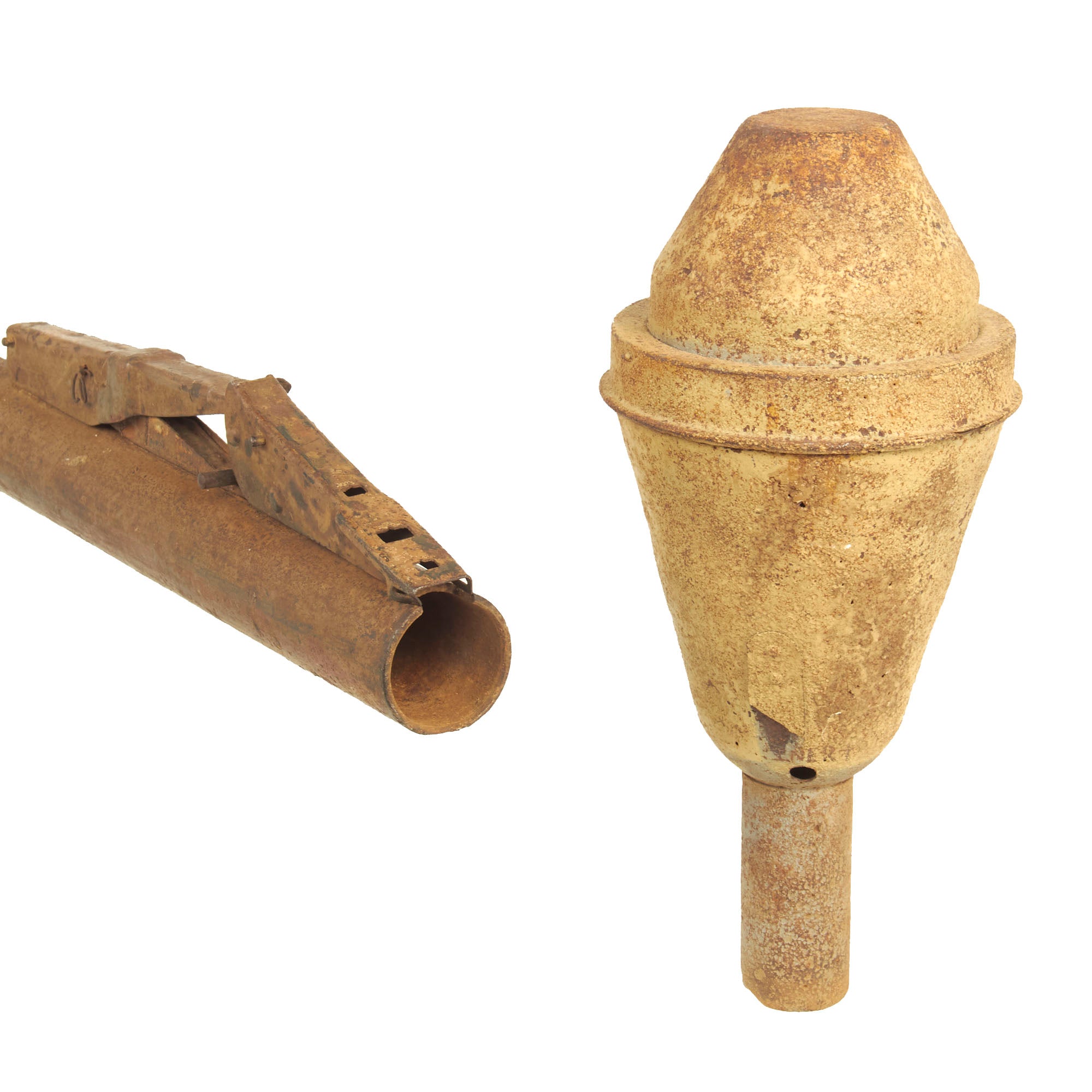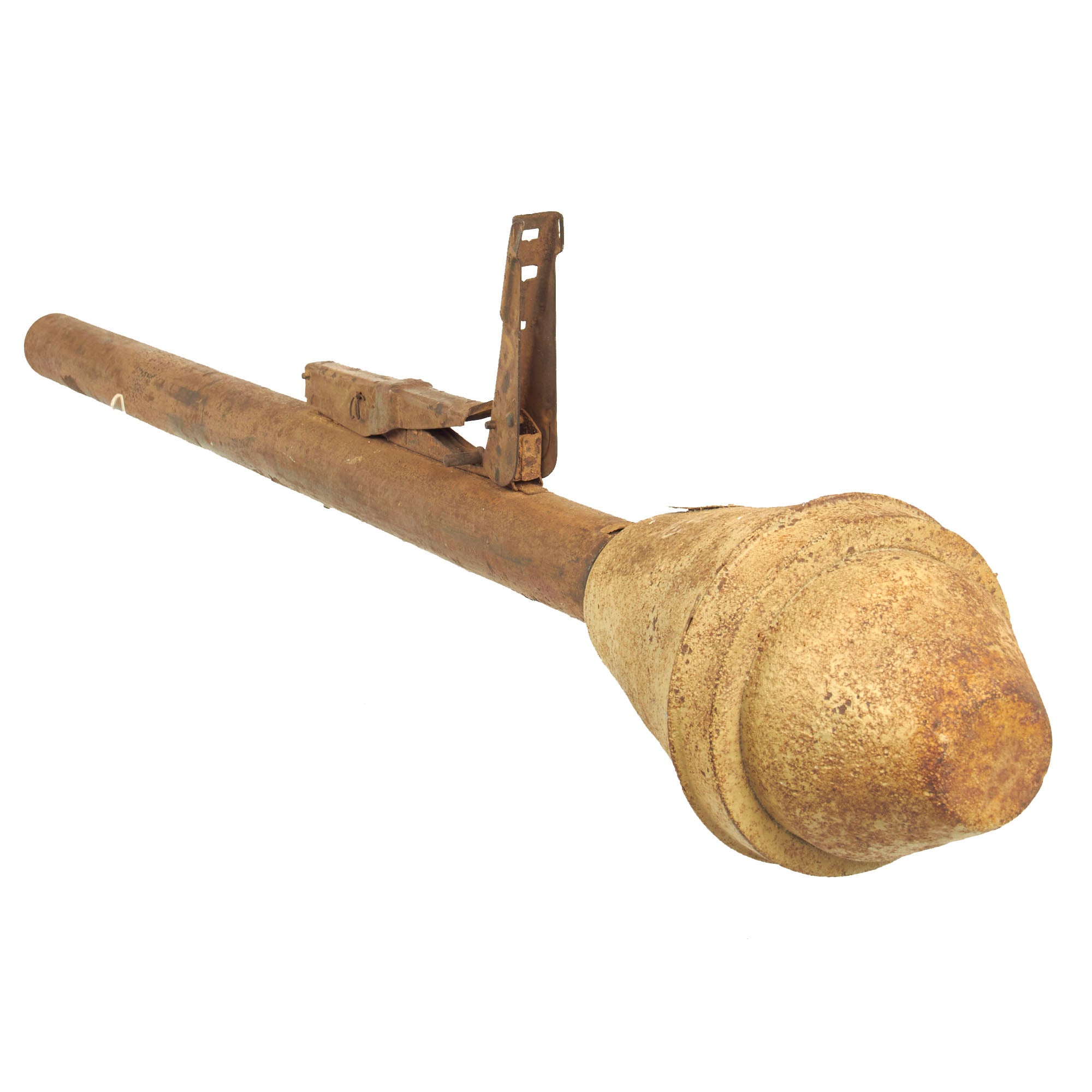 This example has been demilitarized according to specifications by the BATF. It still retains some of the original dunkelgelb (dark yellow) paint with the original red stenciling still faintly visible! Original leaf sight and trigger assembly are also still present. The original rocket is incomplete, missing the wooden tail section and metal fins. The warhead appears to have been recovered from the field and was sandblasted, cleaned and repainted to give it a more appealing appearance.
