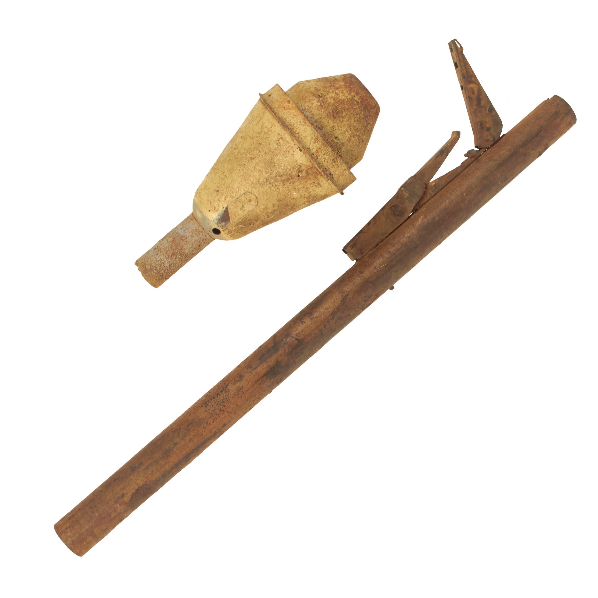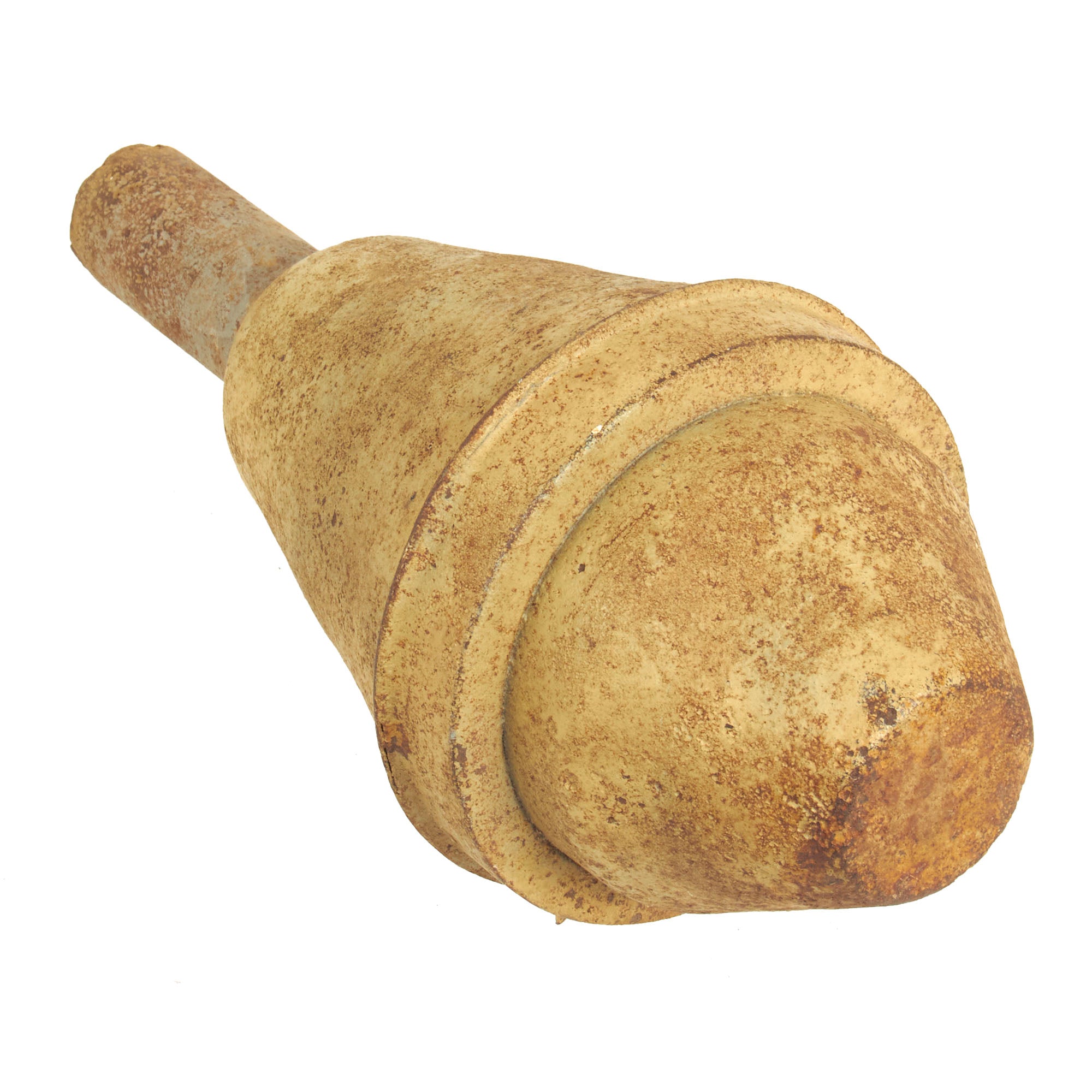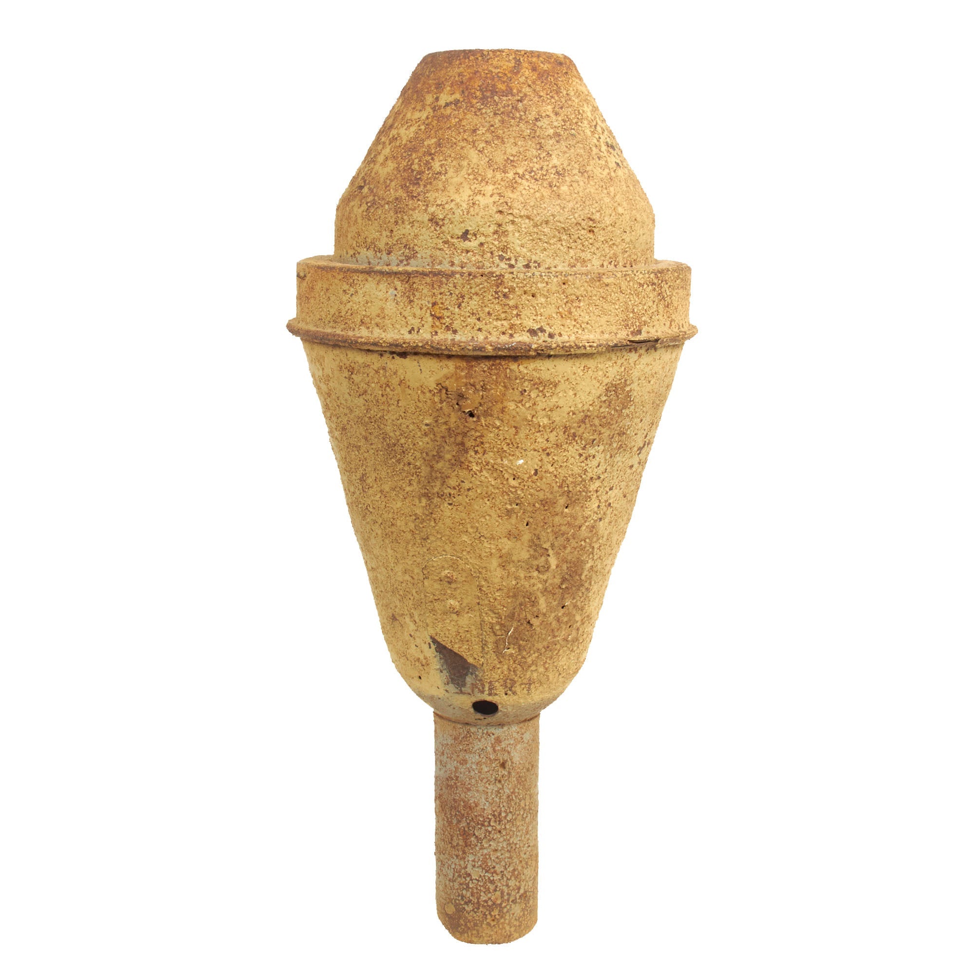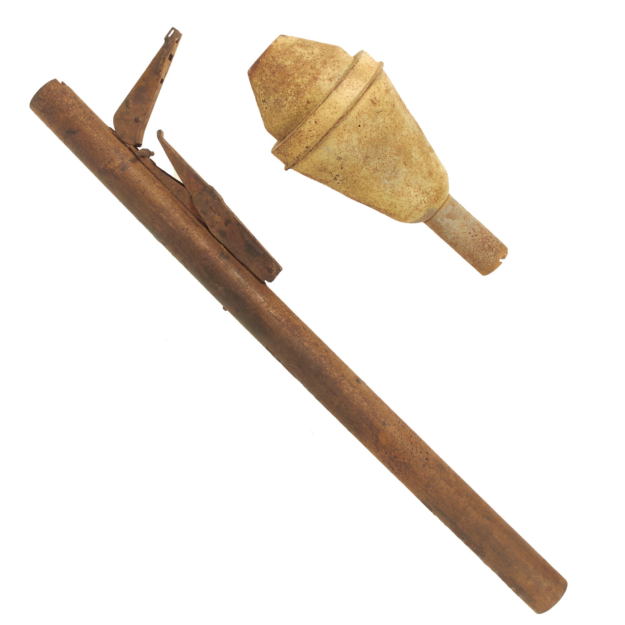 This example has been demilitarized according to specifications by the BATF. It still retains some of the original dunkelgelb (dark yellow) paint with the original red stenciling still faintly visible! Original leaf sight and trigger assembly are also still present. The original rocket is incomplete, missing the wooden tail section and metal fins. The warhead appears to have been recovered from the field and was sandblasted, cleaned and repainted to give it a more appealing appearance.