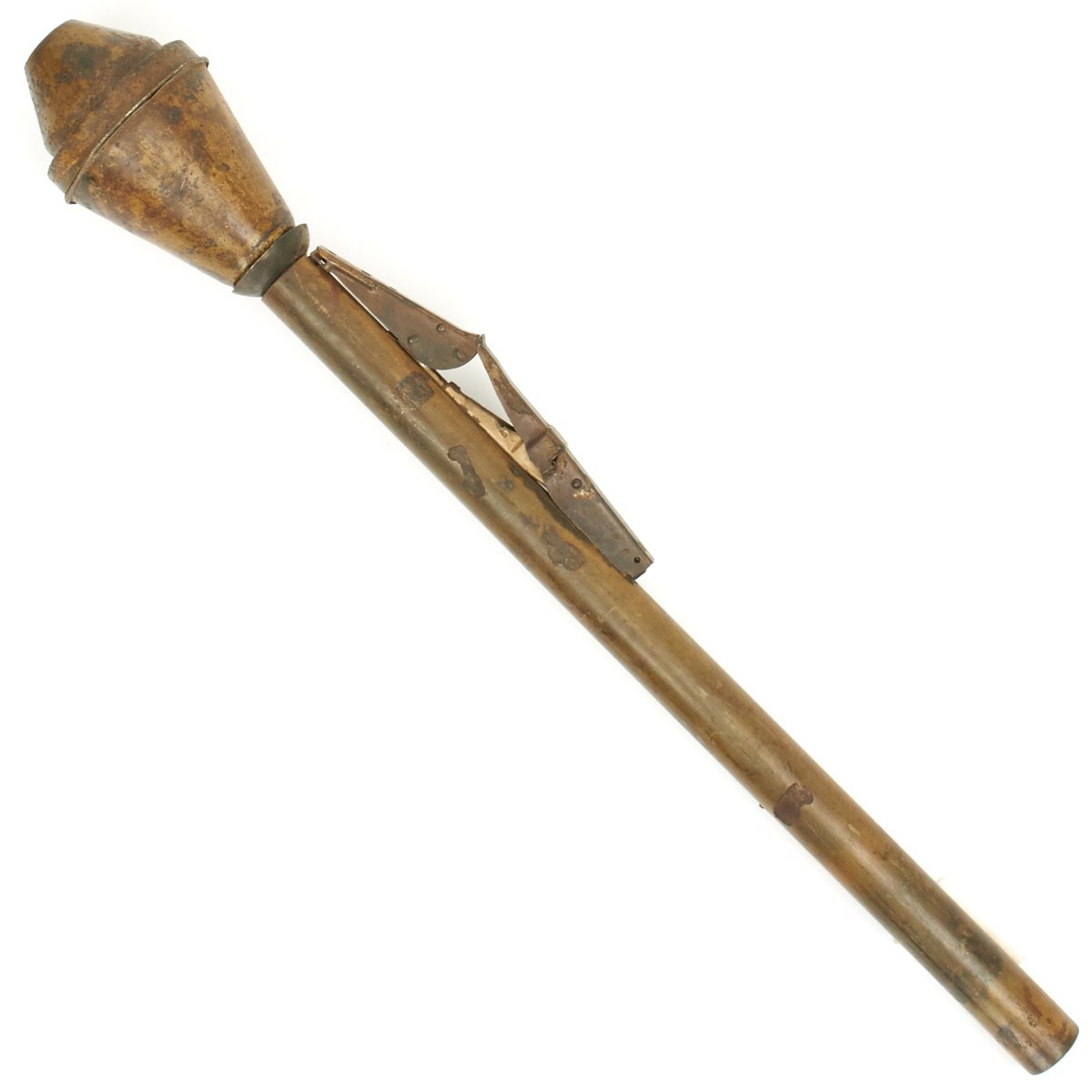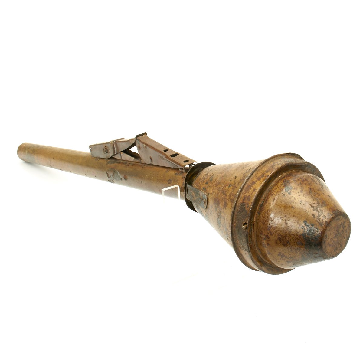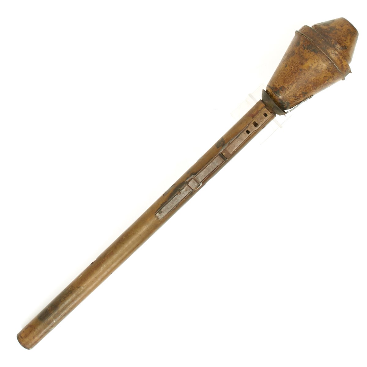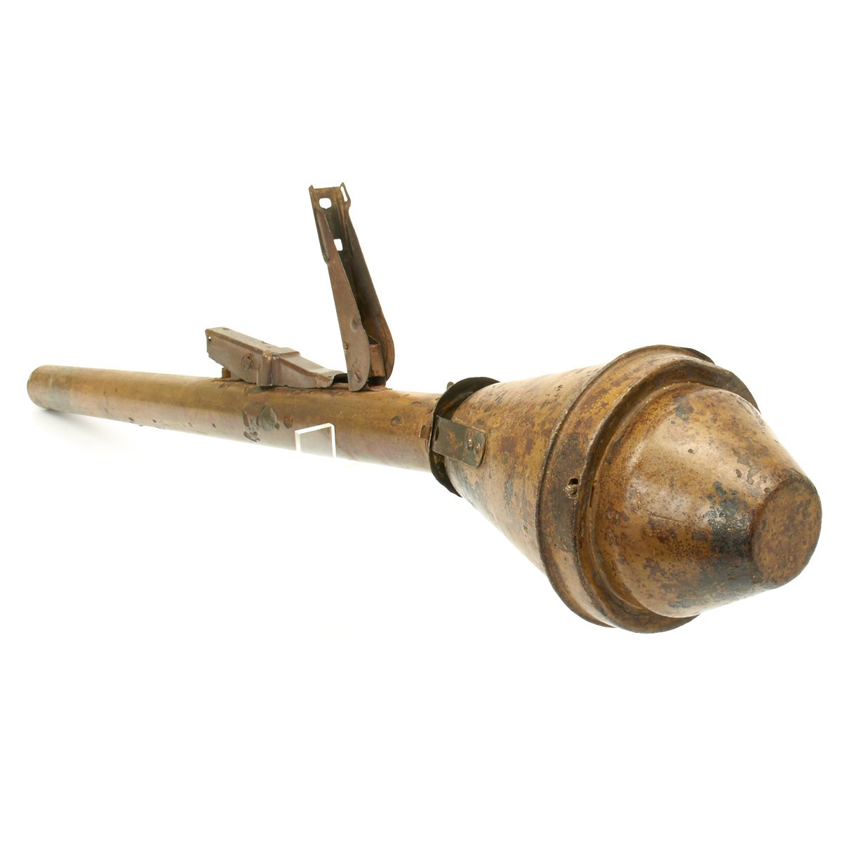 This example, acquired from a WWII veteran's estate, has been demilitarized according to specifications by the BATF. It still retains much of the original dunkelgelb paint with some original red and black stenciling still visible! Original leaf sight and trigger assembly also still present. The original rocket is complete with the wood tail section and one of the three fins still intact (rare!).