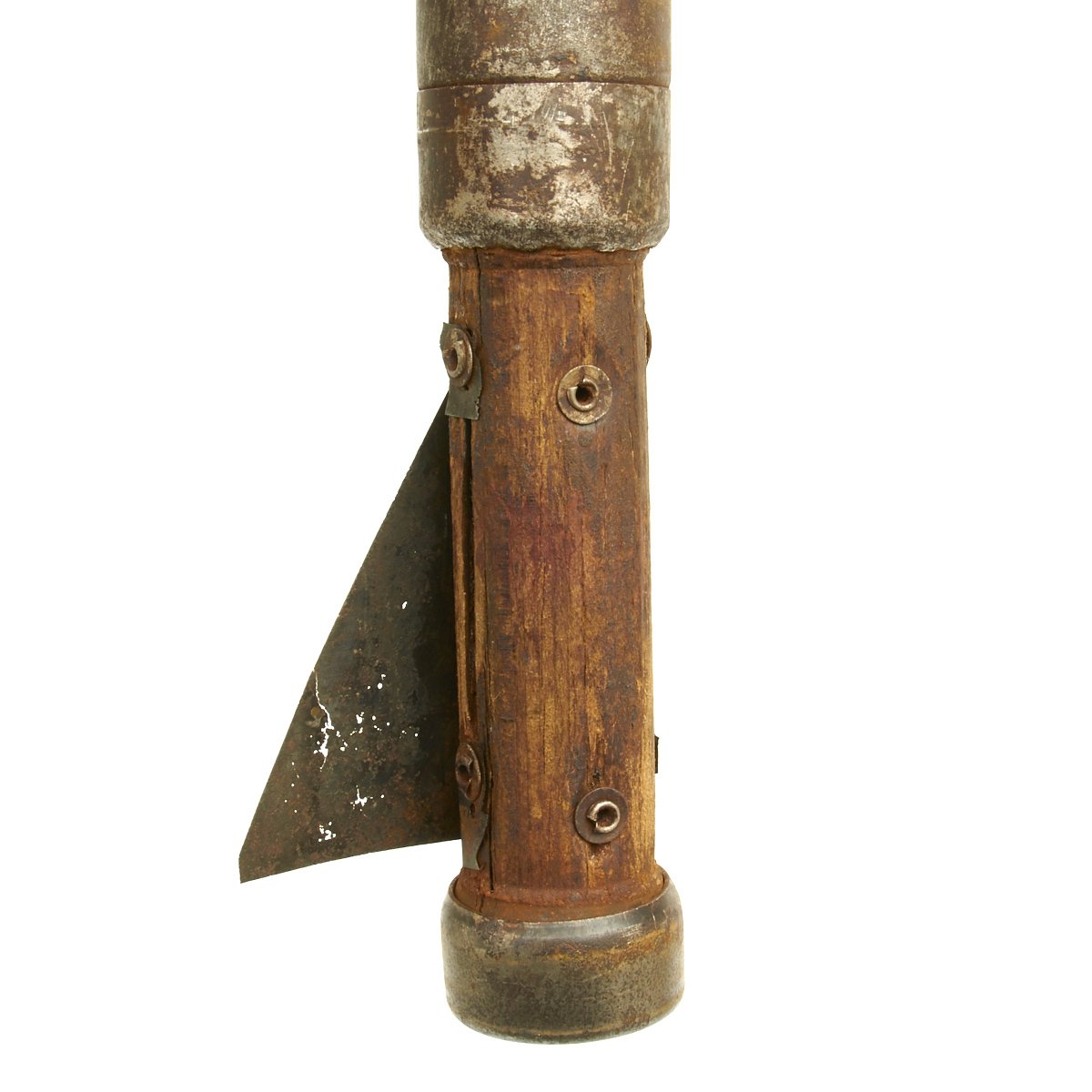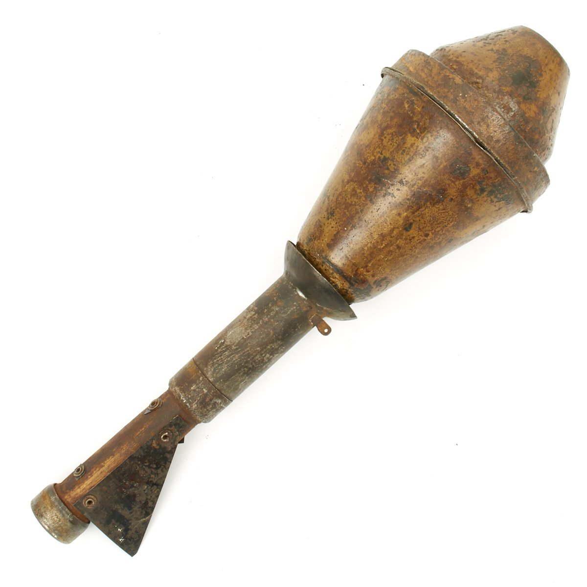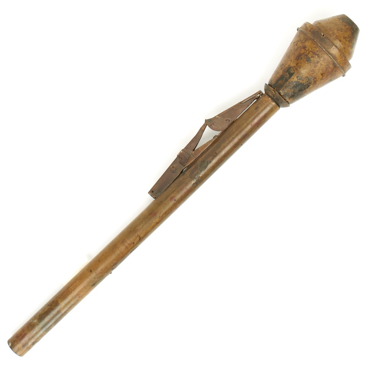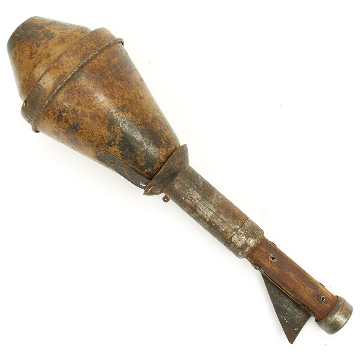 This example, acquired from a WWII veteran's estate, has been demilitarized according to specifications by the BATF. It still retains much of the original dunkelgelb paint with some original red and black stenciling still visible! Original leaf sight and trigger assembly also still present. The original rocket is complete with the wood tail section and one of the three fins still intact (rare!).