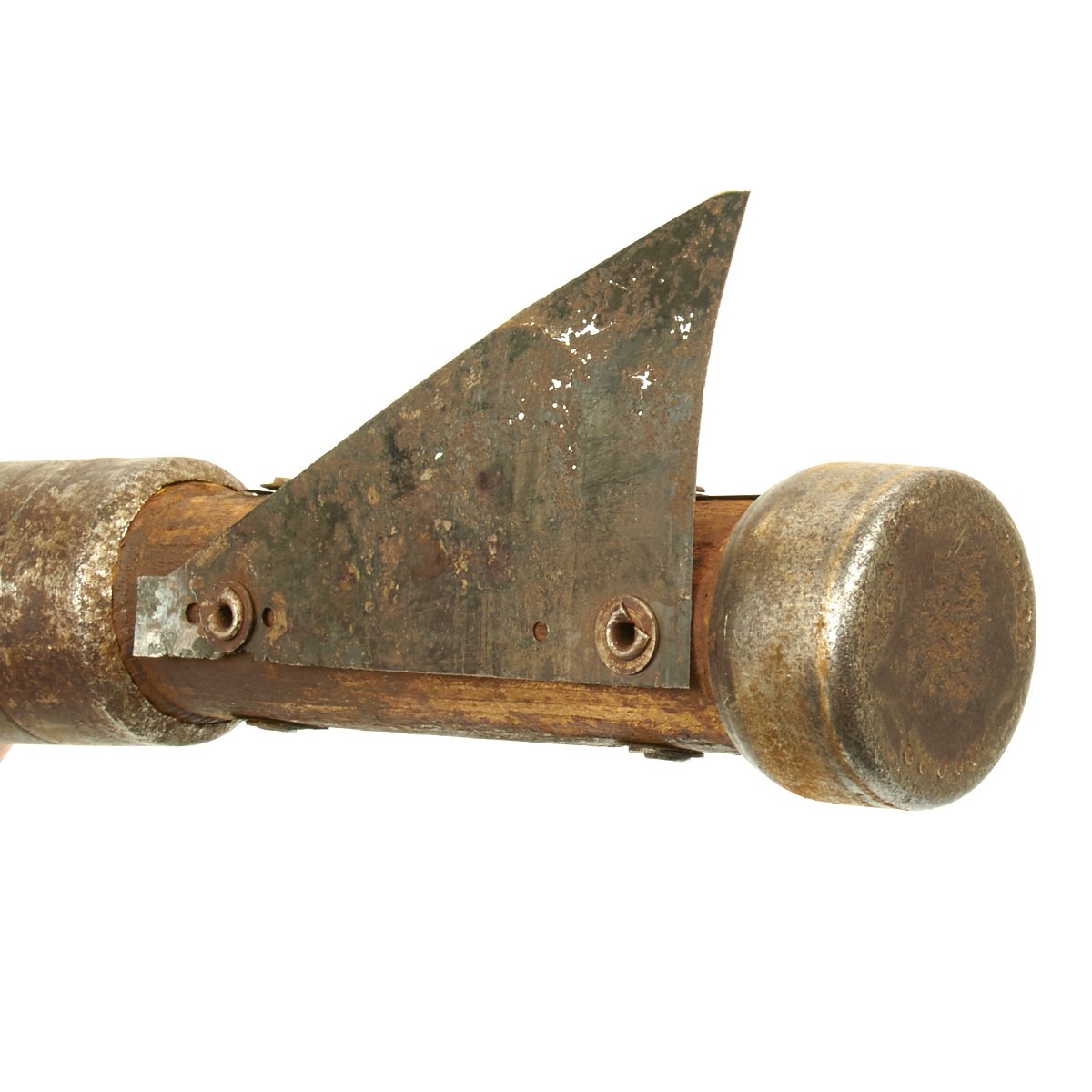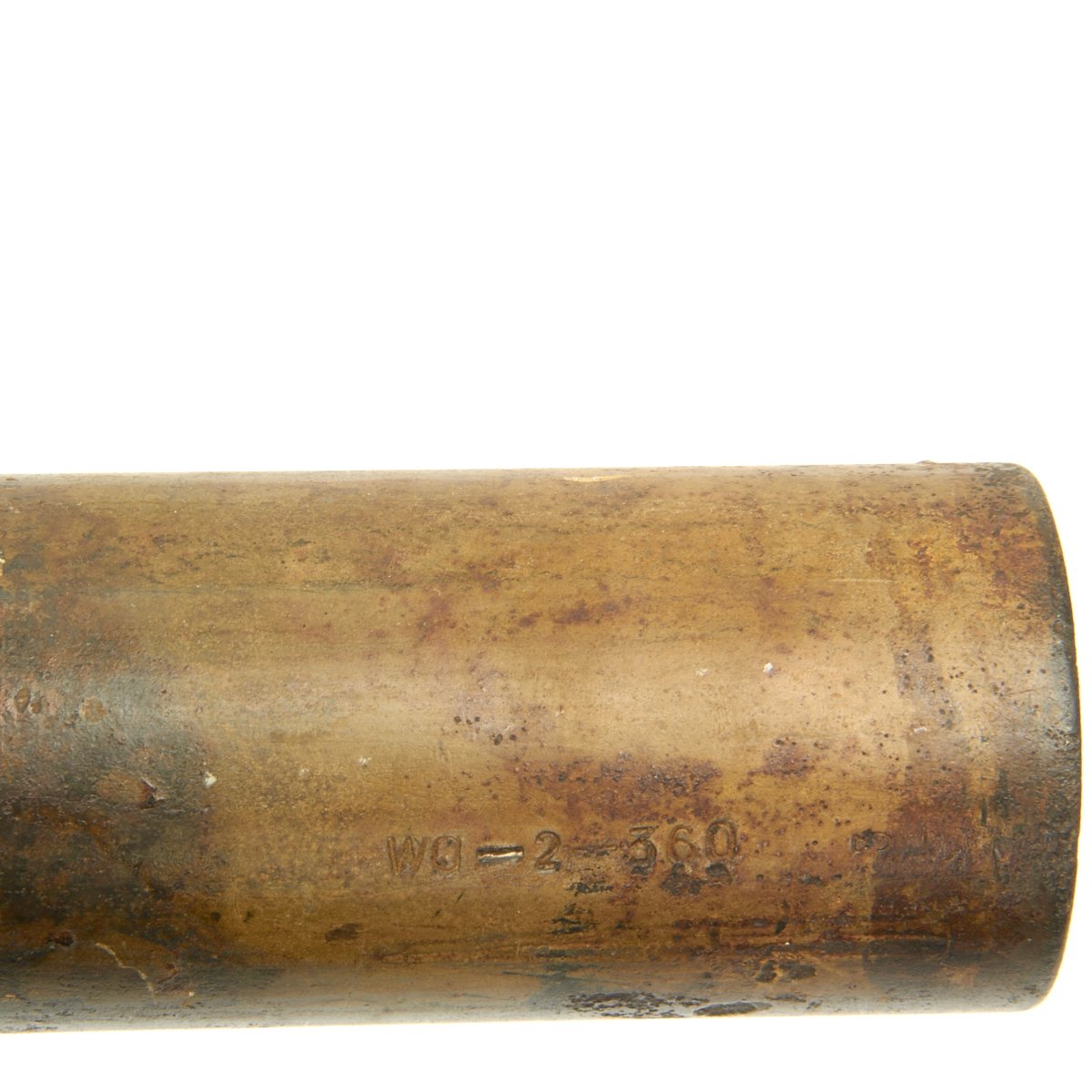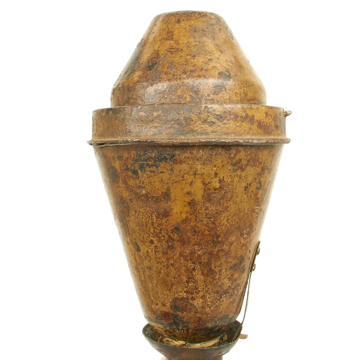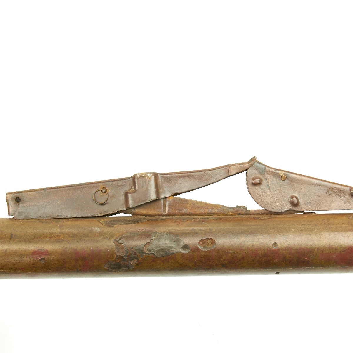 This example, acquired from a WWII veteran's estate, has been demilitarized according to specifications by the BATF. It still retains much of the original dunkelgelb paint with some original red and black stenciling still visible! Original leaf sight and trigger assembly also still present. The original rocket is complete with the wood tail section and one of the three fins still intact (rare!).