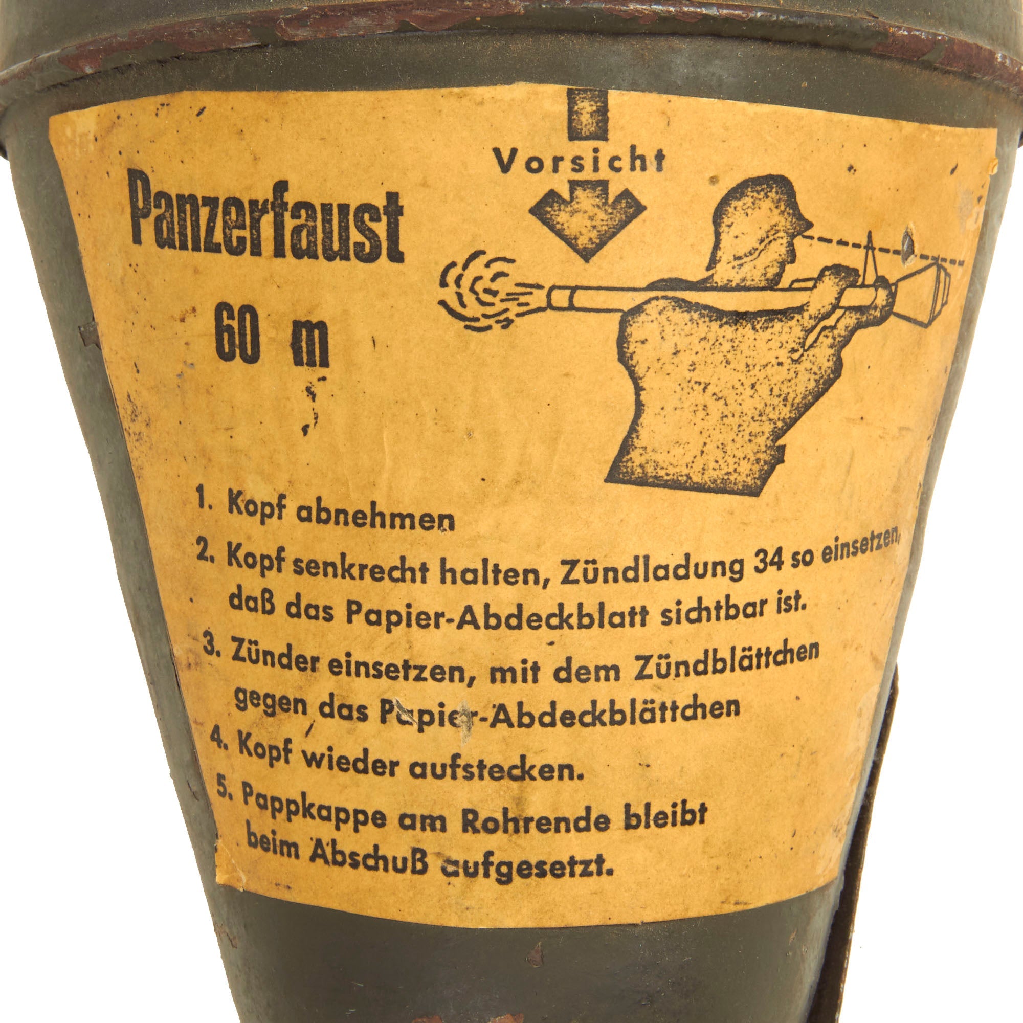 Original Item: Only One Available. The Panzerfaust 60m Gross ("large") or Faustpatrone (Translated literally to mean: Tank Fist Large) was the third version of the Panzerfaust. This was the most common version, with production starting in September 1944. It had a much more practical range of 60 m (66 yd), although with a muzzle velocity of only 45 m (148 ft) per second it would take 1.3 seconds for the warhead to reach a tank at that range. To achieve the higher velocity, the tube diameter was increased to 5 cm (2.0 in) and 134 g (4.7 oz) of propellant used. It also had an improved flip-up rear sight and trigger mechanism. The weapon now weighed 6.1 kg (13 lb). It could defeat 200 mm (7.9 in) of armor.