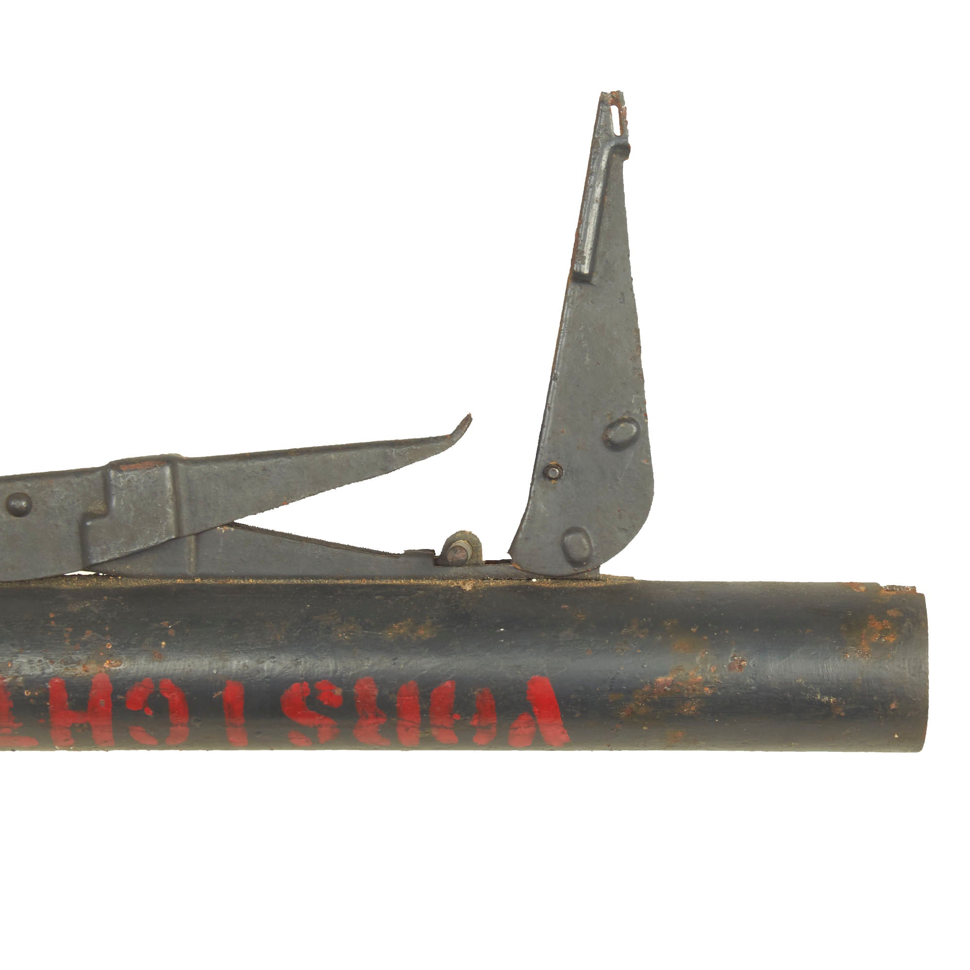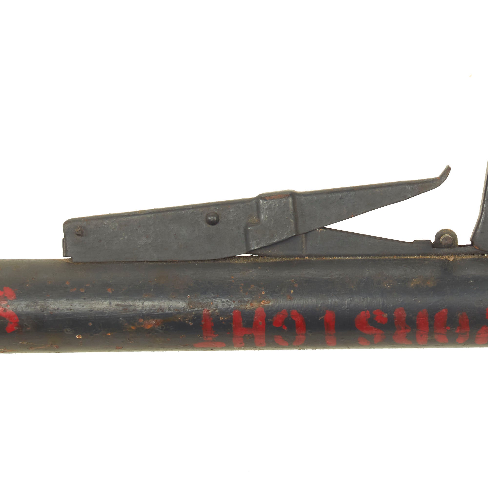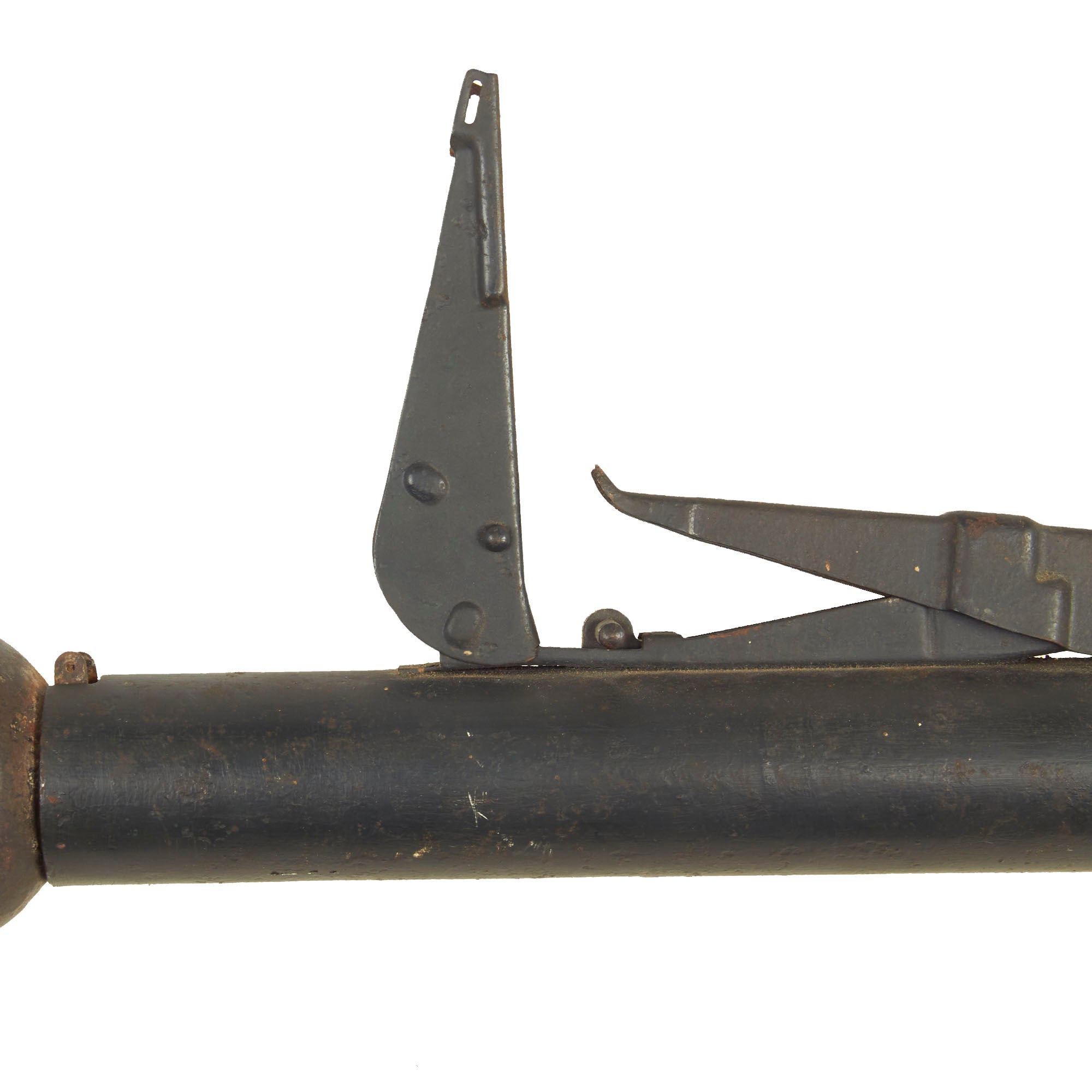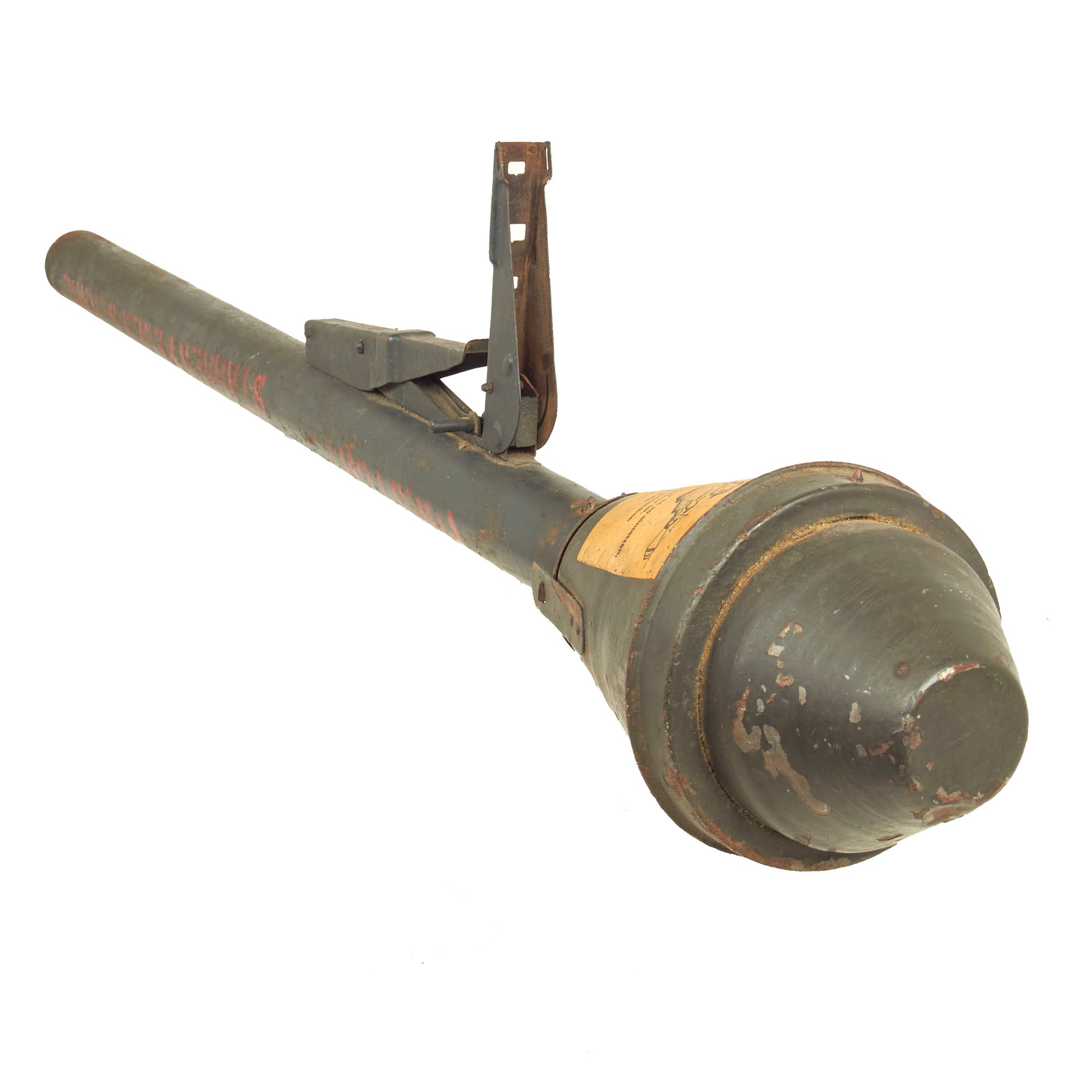 This example has been demilitarized according to specifications by the BATF. It was then repainted and has been re-stenciled and even the warhead label replicated and replaced. The original leaf sight and trigger assembly is also still present. The original rocket is complete including the wooden tail section, though unfortunately the metal fins rusted away long ago, and only pieces are still attached.
