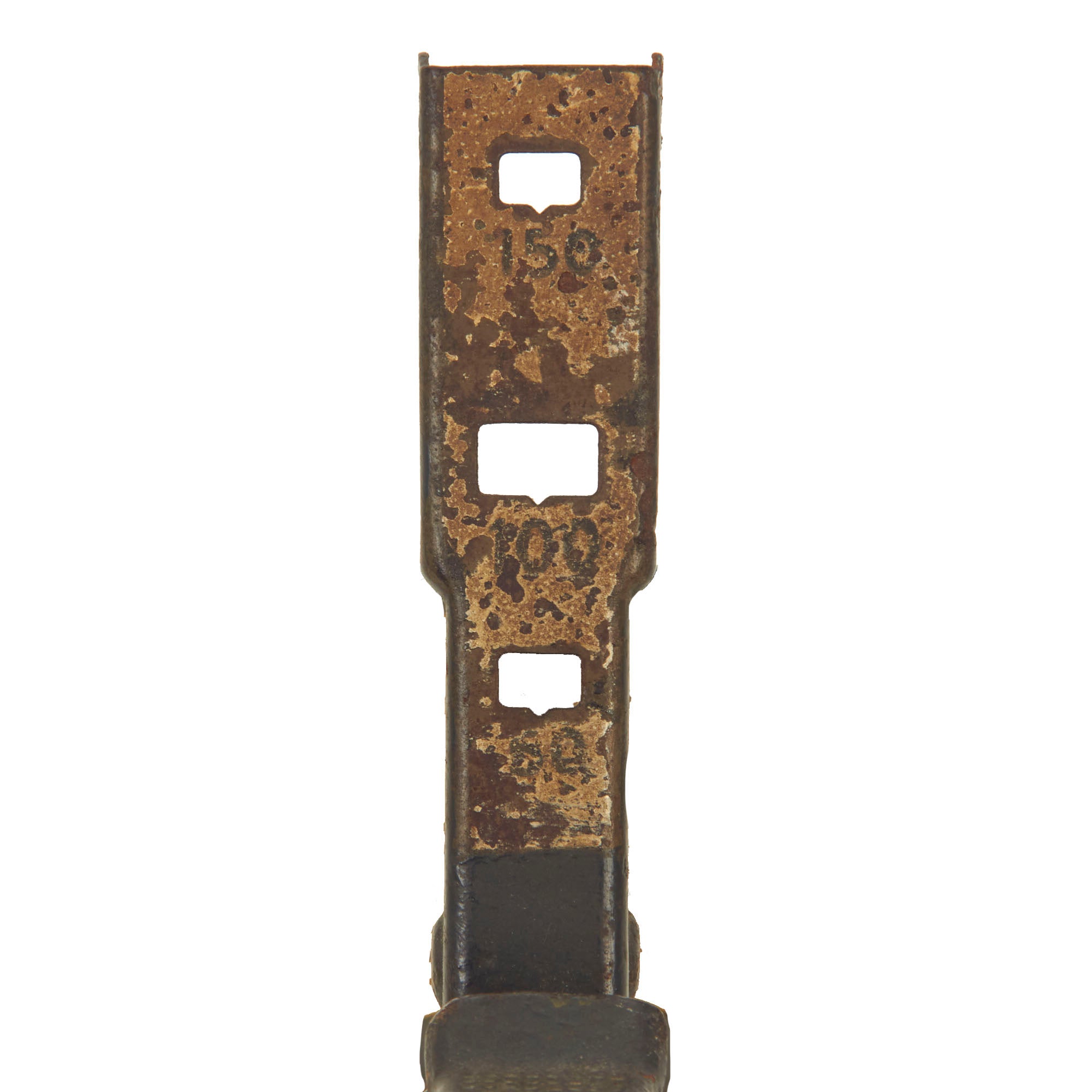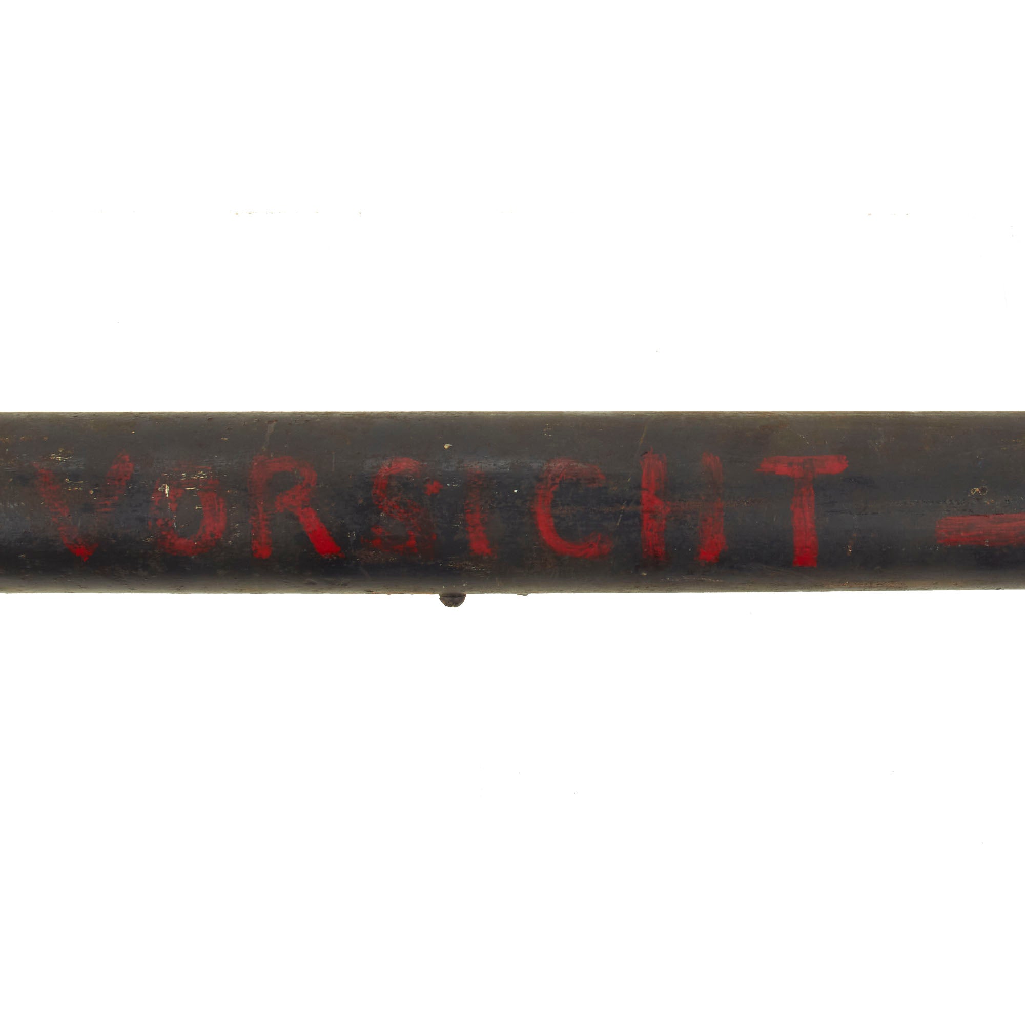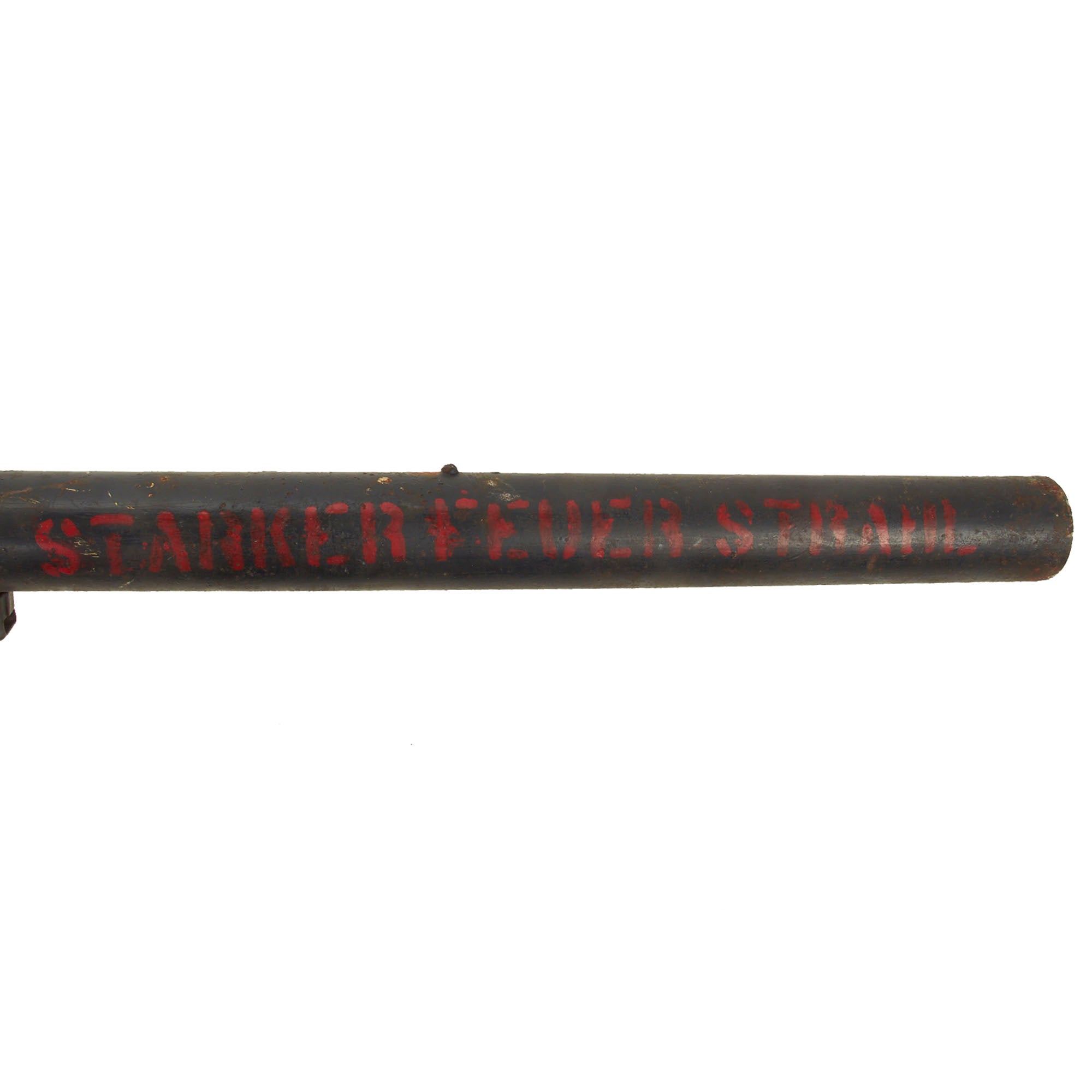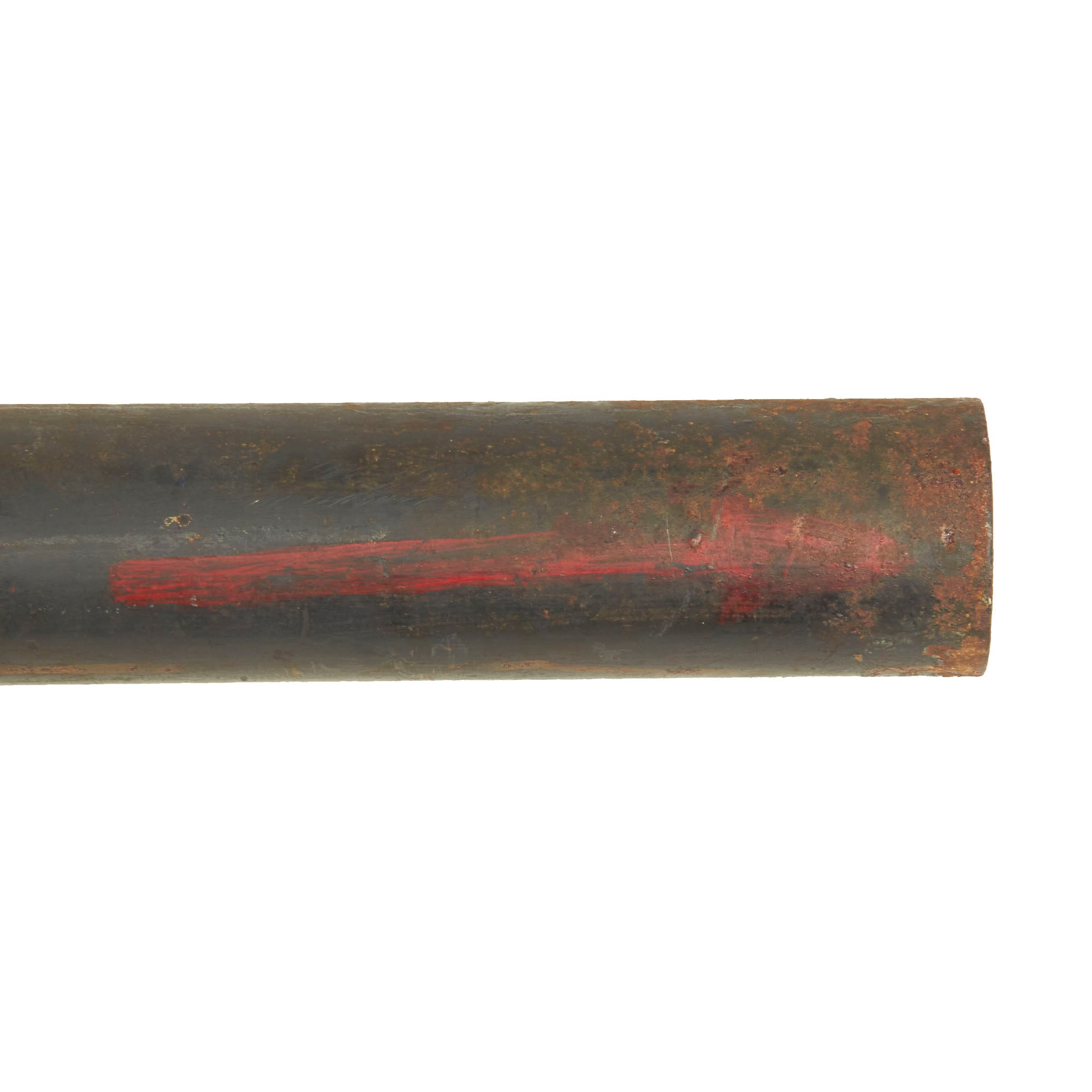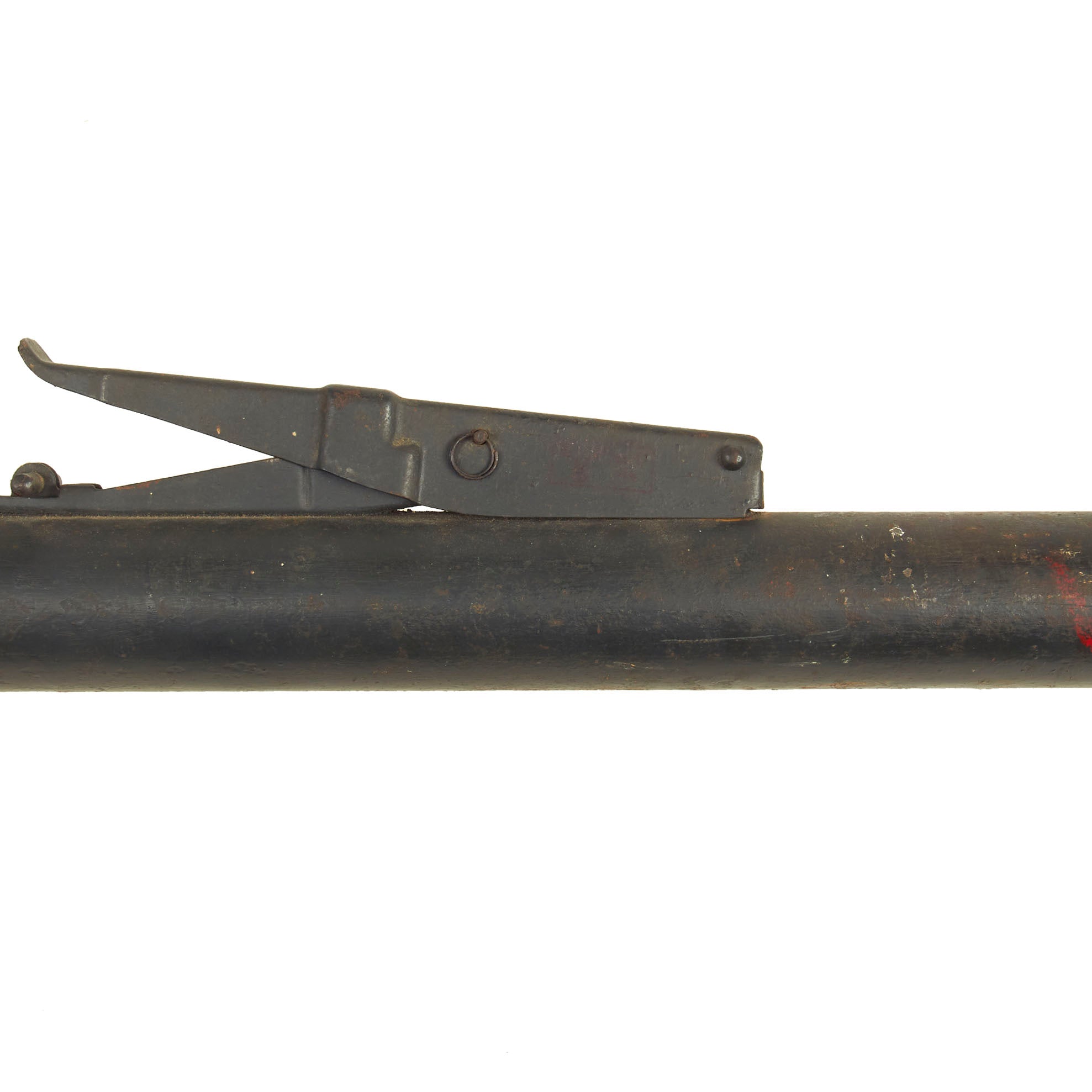 This example has been demilitarized according to specifications by the BATF. It was then repainted and has been re-stenciled and even the warhead label replicated and replaced. The original leaf sight and trigger assembly is also still present. The original rocket is complete including the wooden tail section, though unfortunately the metal fins rusted away long ago, and only pieces are still attached.