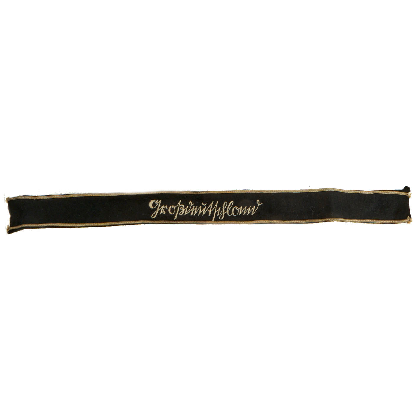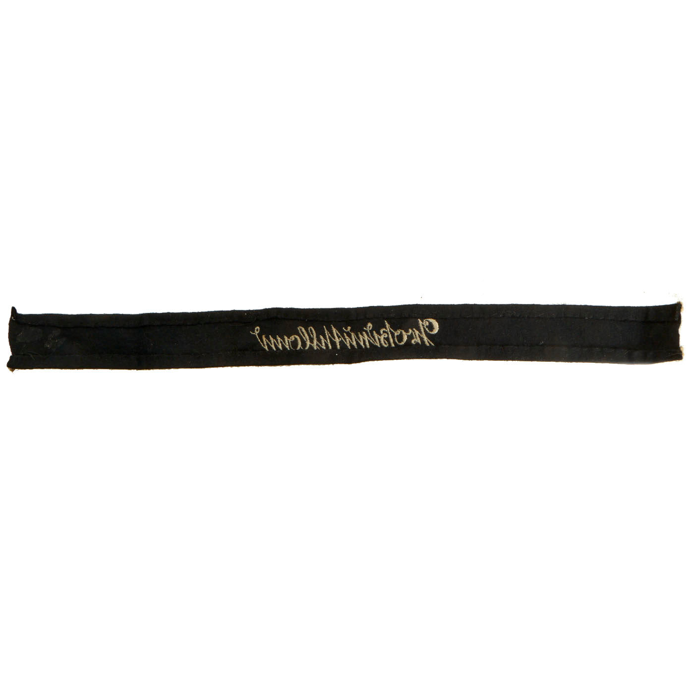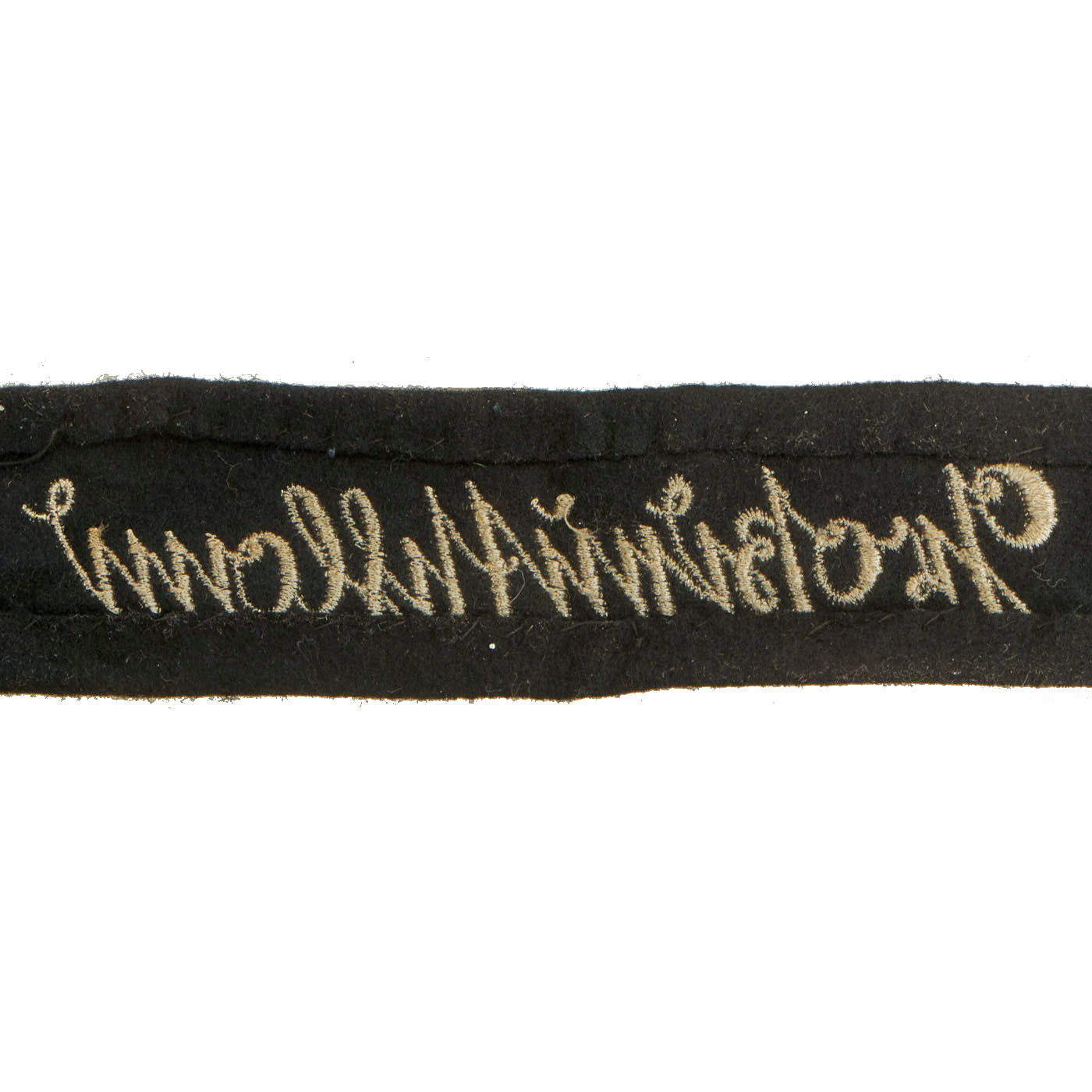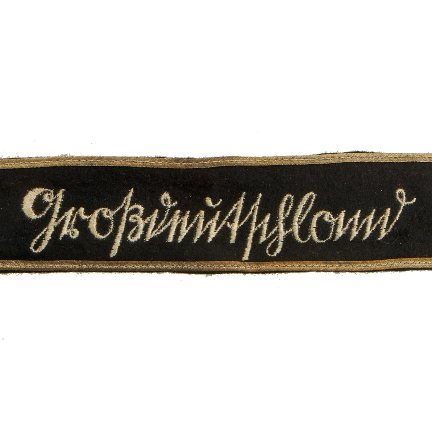 This example is the mid 1944, third pattern cuff title with machine embroidered Sütterlin style script. Although the earlier pattern cuff titles with the hand embroidered script are often referred to as Officer’s types there was no difference between the Officer and EM/NCO’s cuff titles. It measures approximately 18" x 1 1/2".