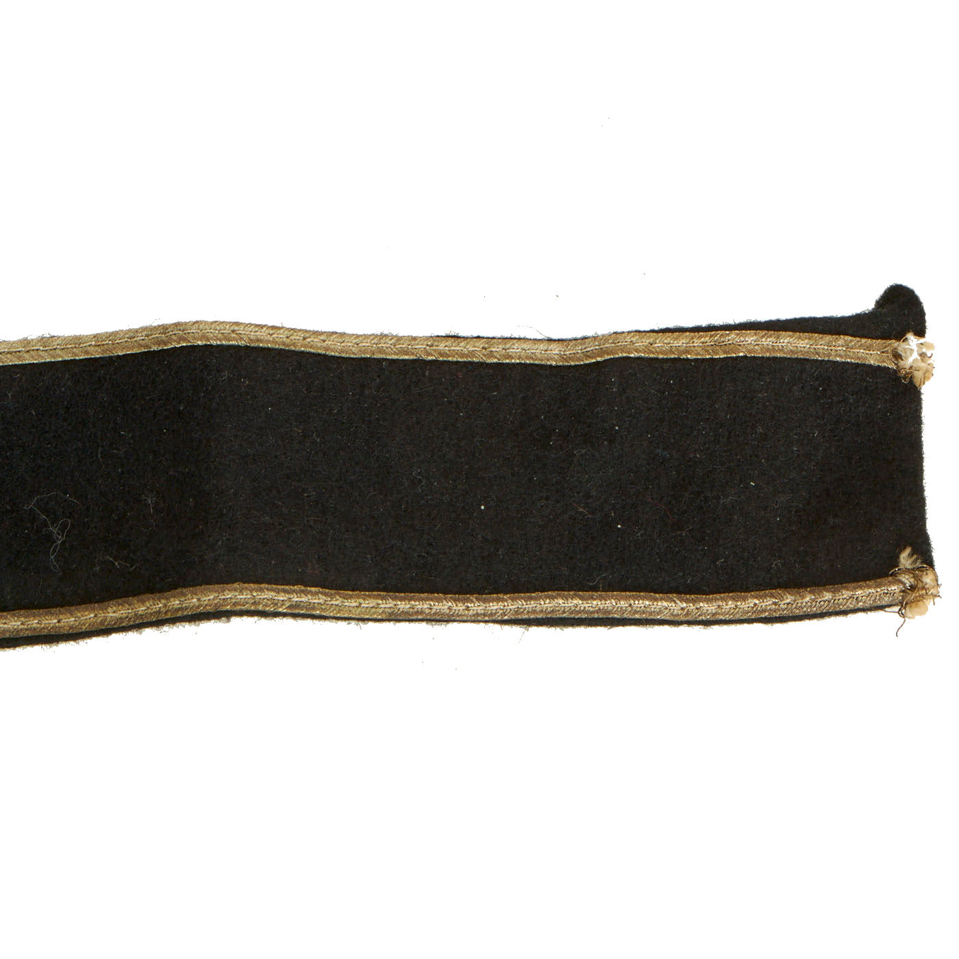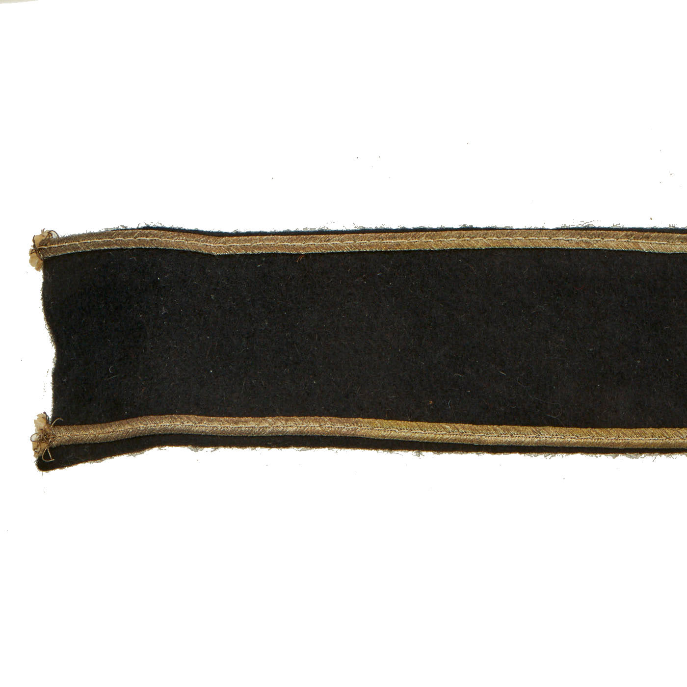 The cuff title is constructed of very nice black wool and appears to be without damage. The “Russian braid” silver thread borders the length of the title on both the top and bottom. The thread seems to be complete and without significant damage, but it has a slight color loss to it with minor staining. The white cotton thread used for the Sütterlin script is nice, clean and without damage. The stitching on the back used to secure the folds appears complete and still holds the flaps down nicely.