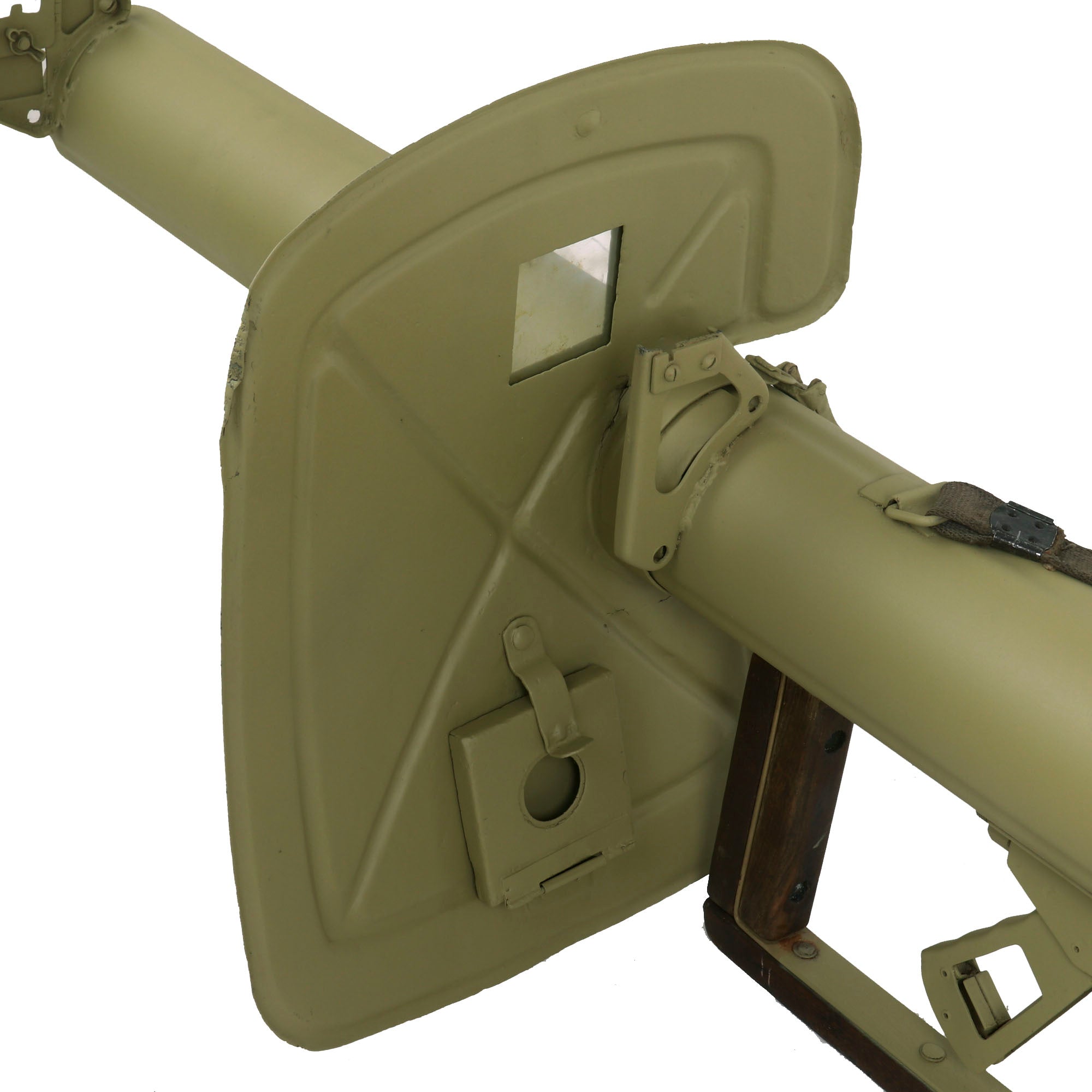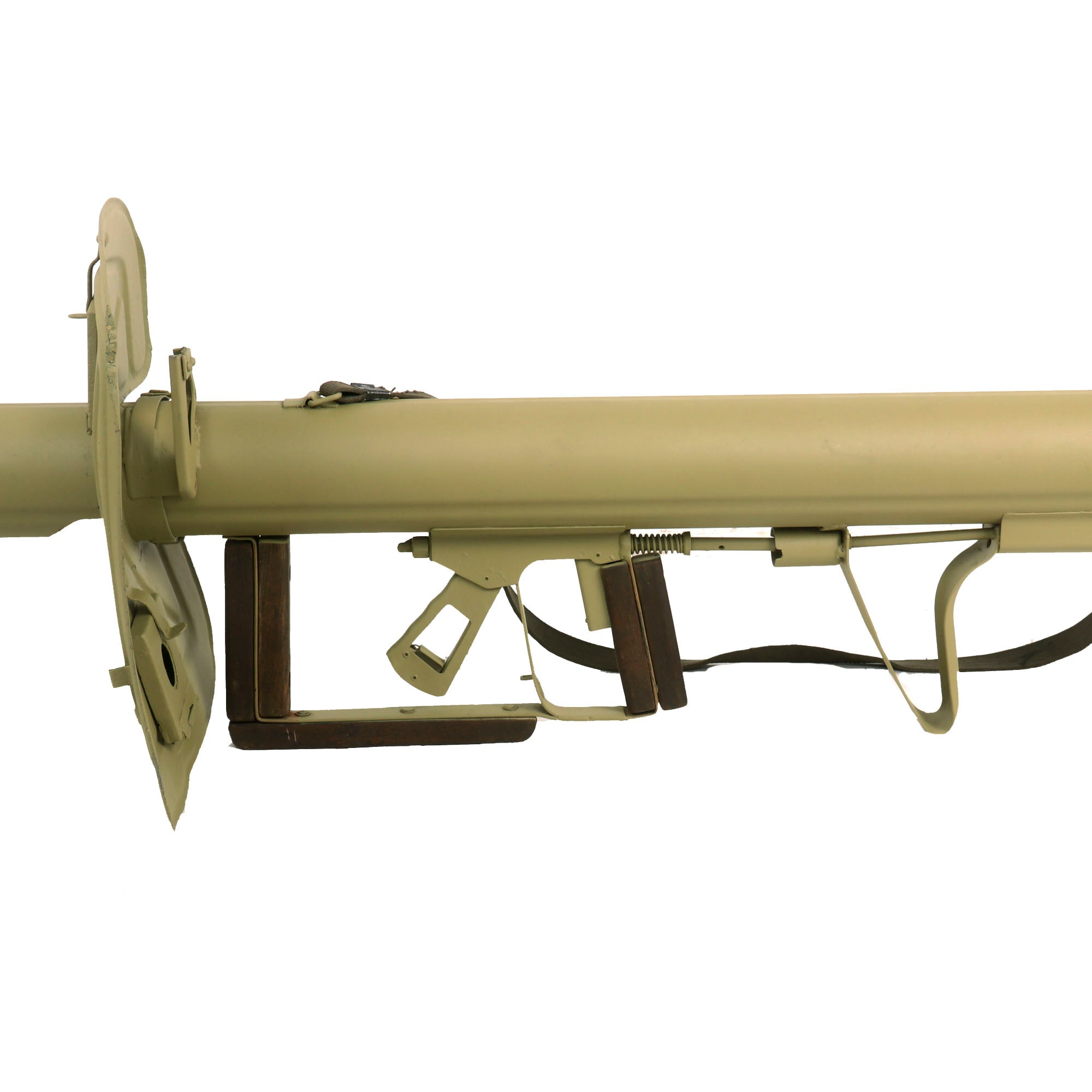 Our example is in excellent condition, all parts are present. It features an original "fluted" RPzB 54 barrel tube to increase strength, a complete original shield, complete original sights, original trigger assembly, original ignition system and has been deactivated to BATF specifications. The firing mechanism can still be cocked with the front lever, and released with the rear trigger, though it is a bit out of alignment so the cocking lever must be pulled back HARD. It has the original thick glass viewing window, though the spare glass is missing. There is even still an original fabric sling still installed on the top, though it is unmarked and may be post war.