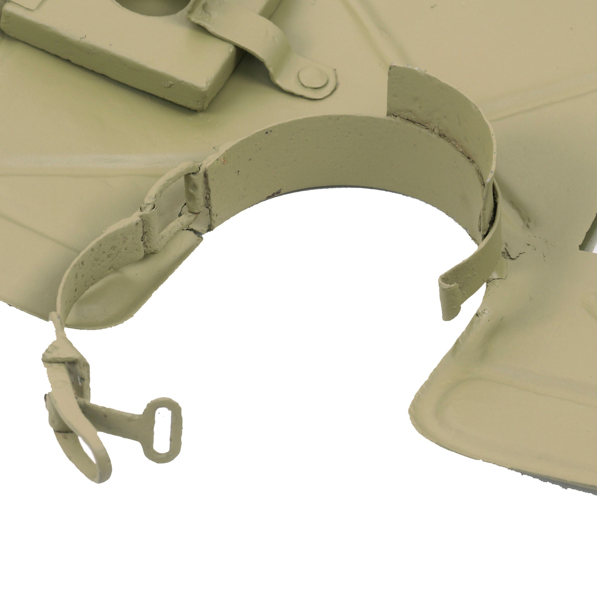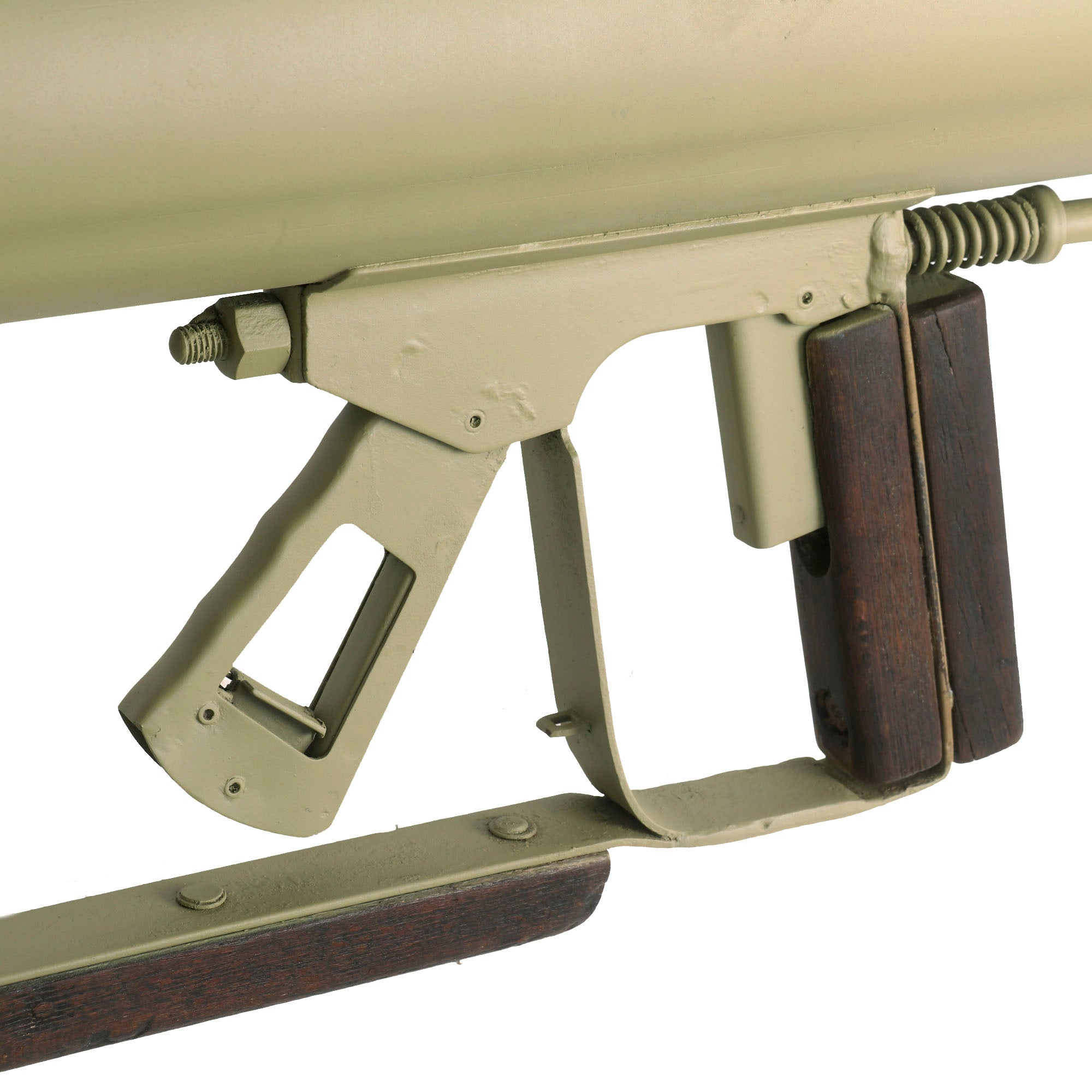 This fine example is also nicely marked on the underside of the trigger guard with serial number 11202 and very faint manufacturer code nbe, for HASAG, Eisen- u. Metallwerke GmbH, Werk Tschenstochau in Occupied Poland. This is a known manufacturer of the Panzerschreck, located in Częstochowa. As with other examples by this maker, the second "1" in the serial number is stamped upside down, and may be part of a different marking. The area where the markings are does look to have suffered some oxidation in the past, which given how faintly the maker markings are stamped, makes them very hard to read if you don't know what you are looking for.