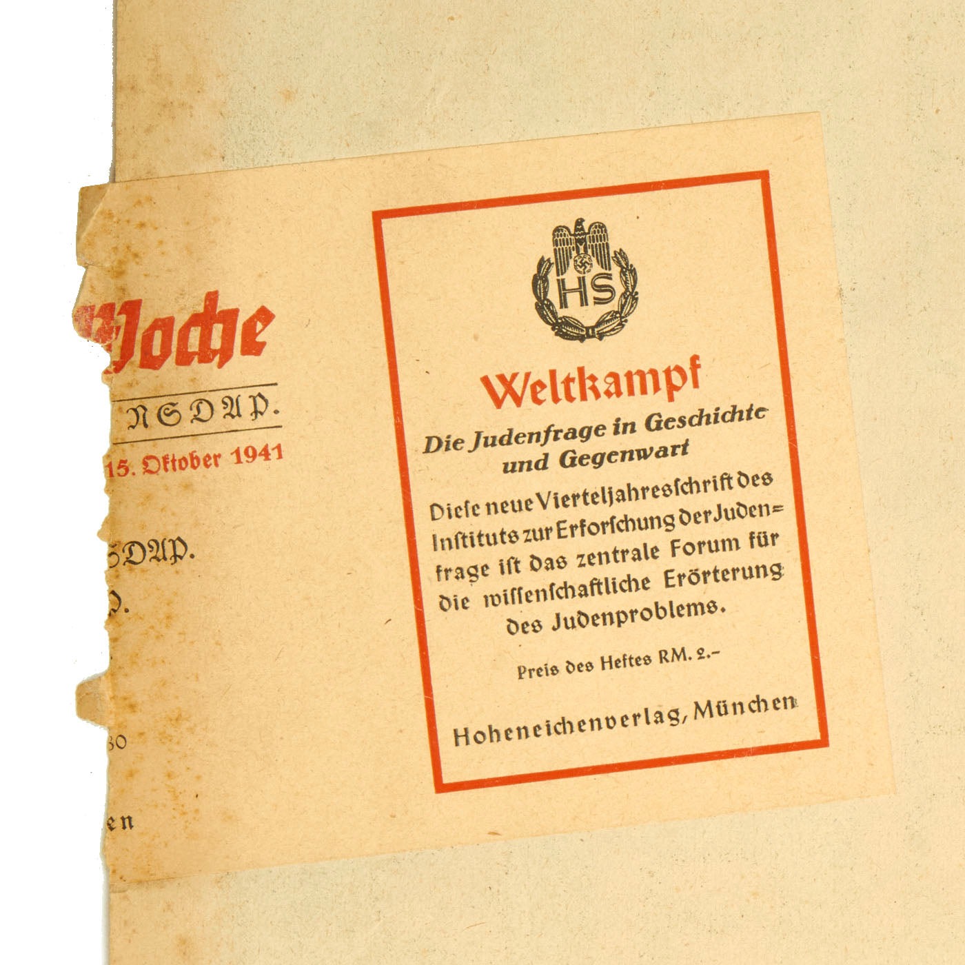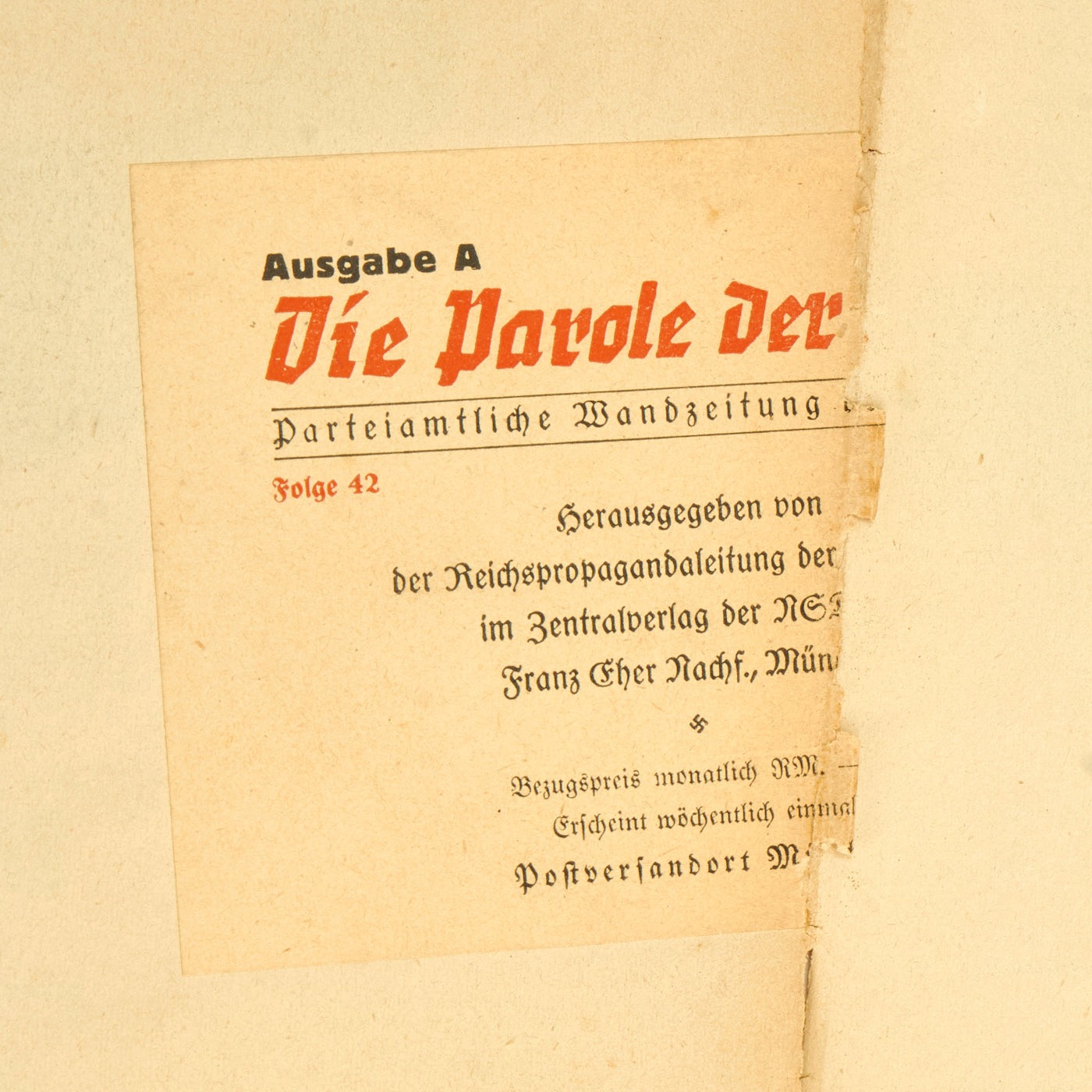 Original Item: Only One Available. Parole der Woche ("Slogan of the Week" or "Word of the Week") was a wall newspaper published by the Reichspropagandaleitung der NSDAP [de] (propaganda department of the NSDAP Party) from 1937 to 1943. Historian Jeffrey Herf describes Parole der Woche as "the most ubiquitous and intrusive aspect of NSDAPism’s visual offensive ... no form of NSDAP visual propaganda made such a crucial contribution to the regime’s presentation of ongoing events".