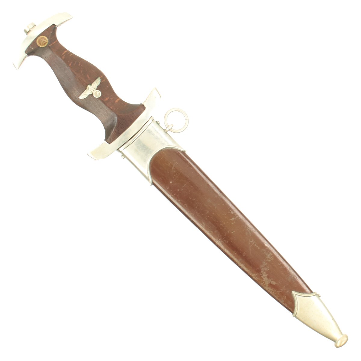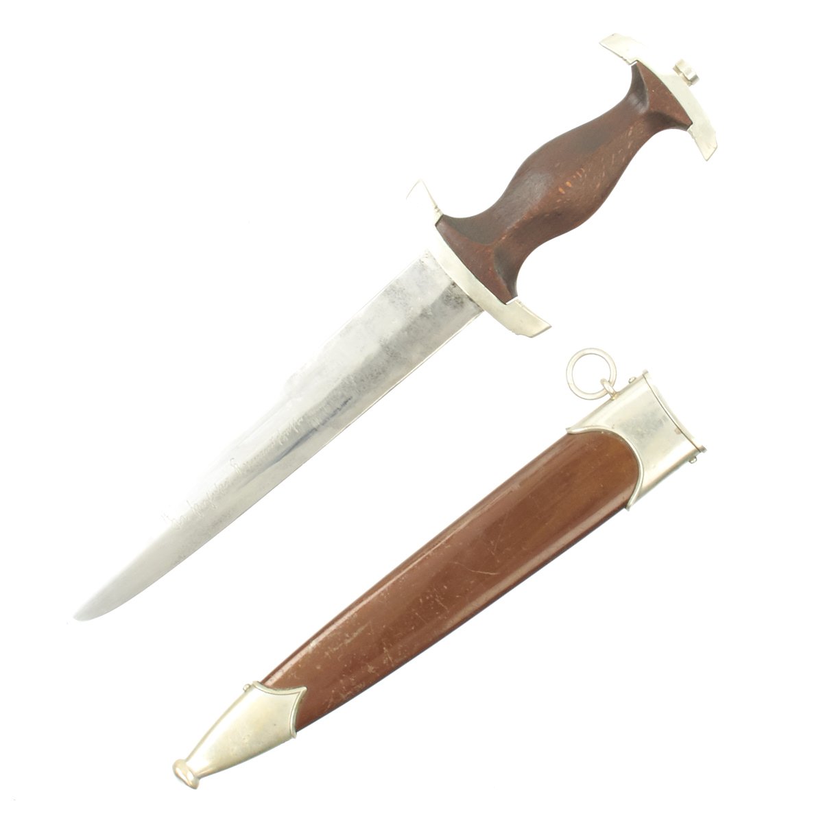The SA or Brown Shirts, were a private political formation which Adolf AH and the NSDAP used to maintain order at organized Party meetings and demonstrations. The group was formed in 1921, and grew to a huge force of nearly 3,000,000 men by the later 1930's. To instill esprit de corps, as well as create employment for the Blade City of Solingen, it was decided each SA man would carry a dagger with his Brown Shirt uniform. Huge quantities needed to be produced to accommodate the demand. The dagger initially was produced of hand-fitted nickel mounts with attractive finished wood grip and brown anodized (a bluing process) finished scabbard.