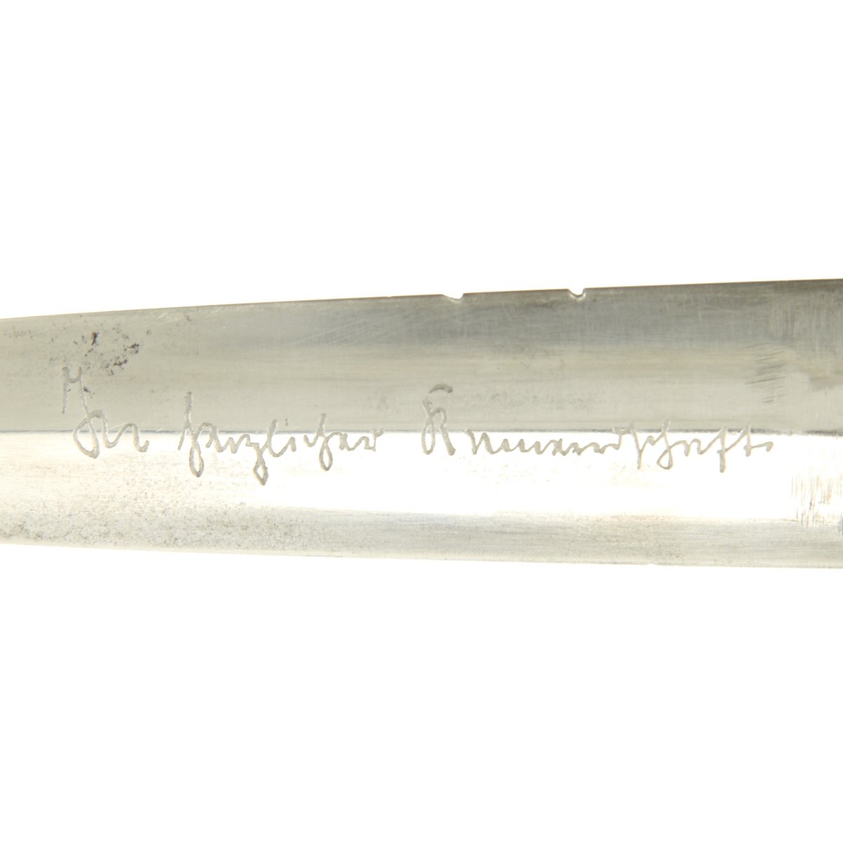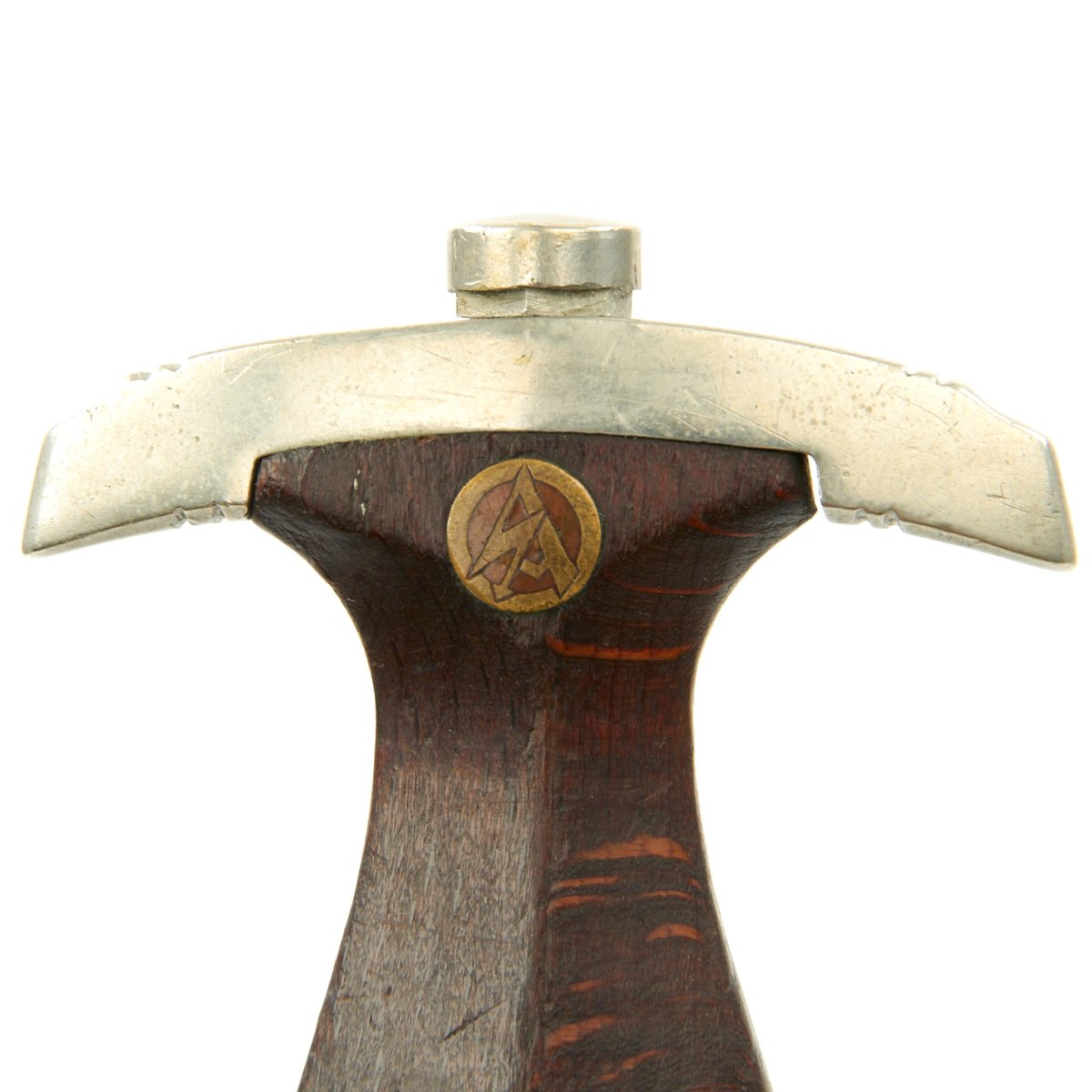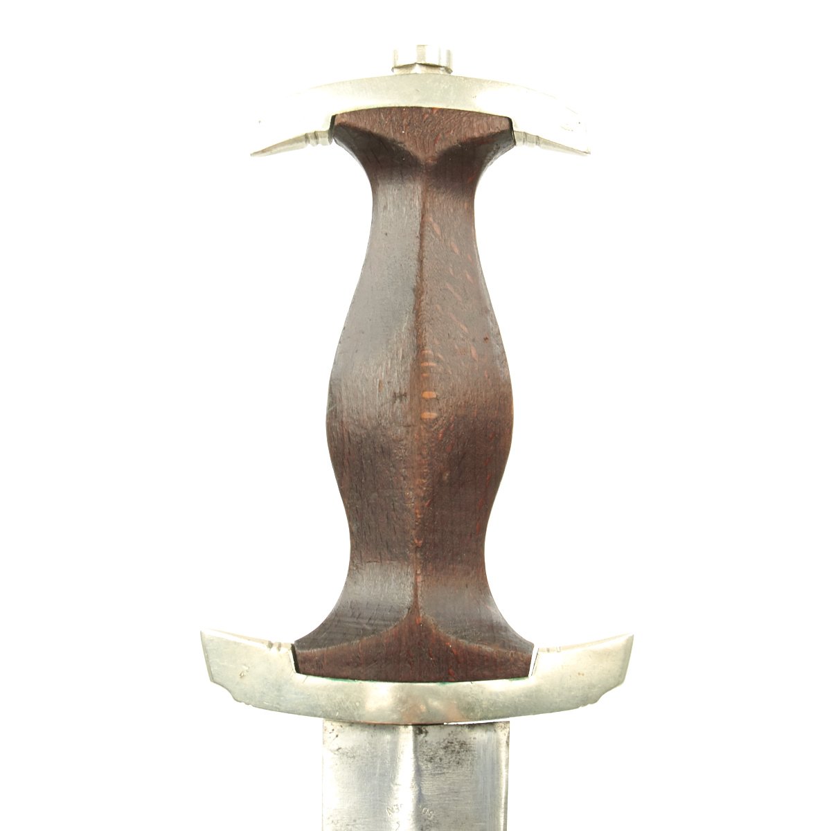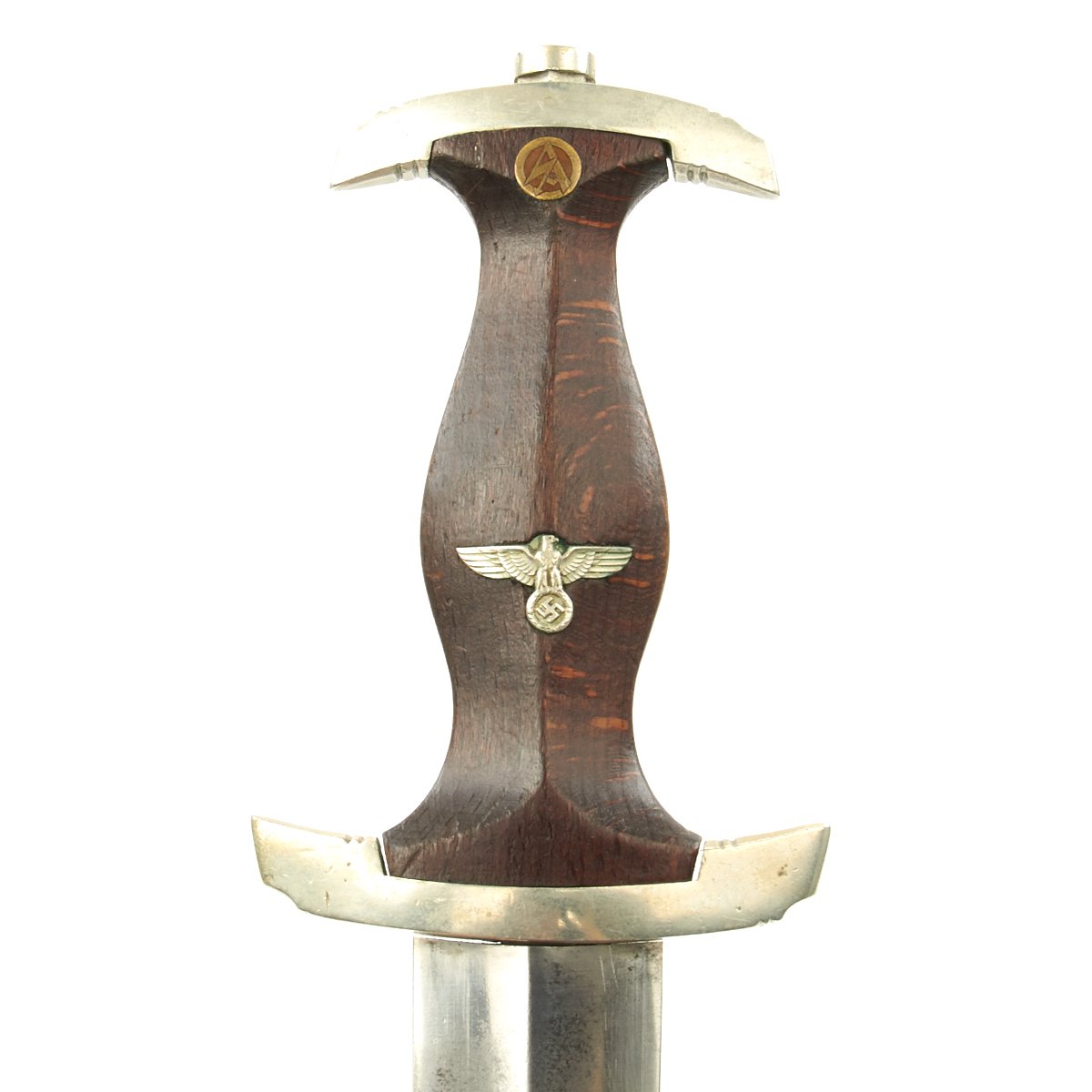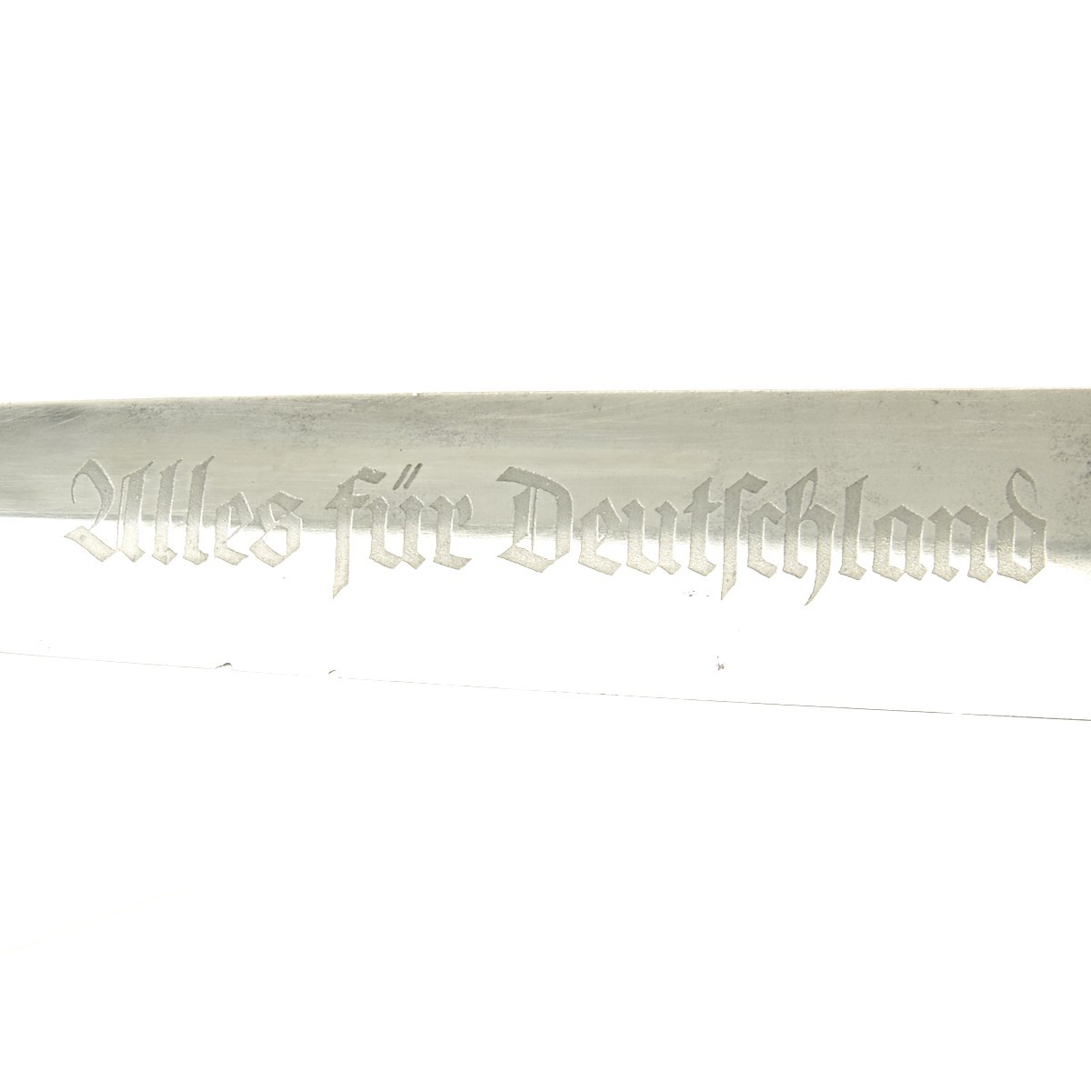 The blade was etched with the SA motto, Alles für Deutschland. Examples produced prior to 1935 were stamped with the German sector of the SA group on reverse lower crossguard. Later examples underwent standardization through the RZM ministry. These pieces were produced of cheaper plated zinc-base fittings and scabbards were simply painted brown.