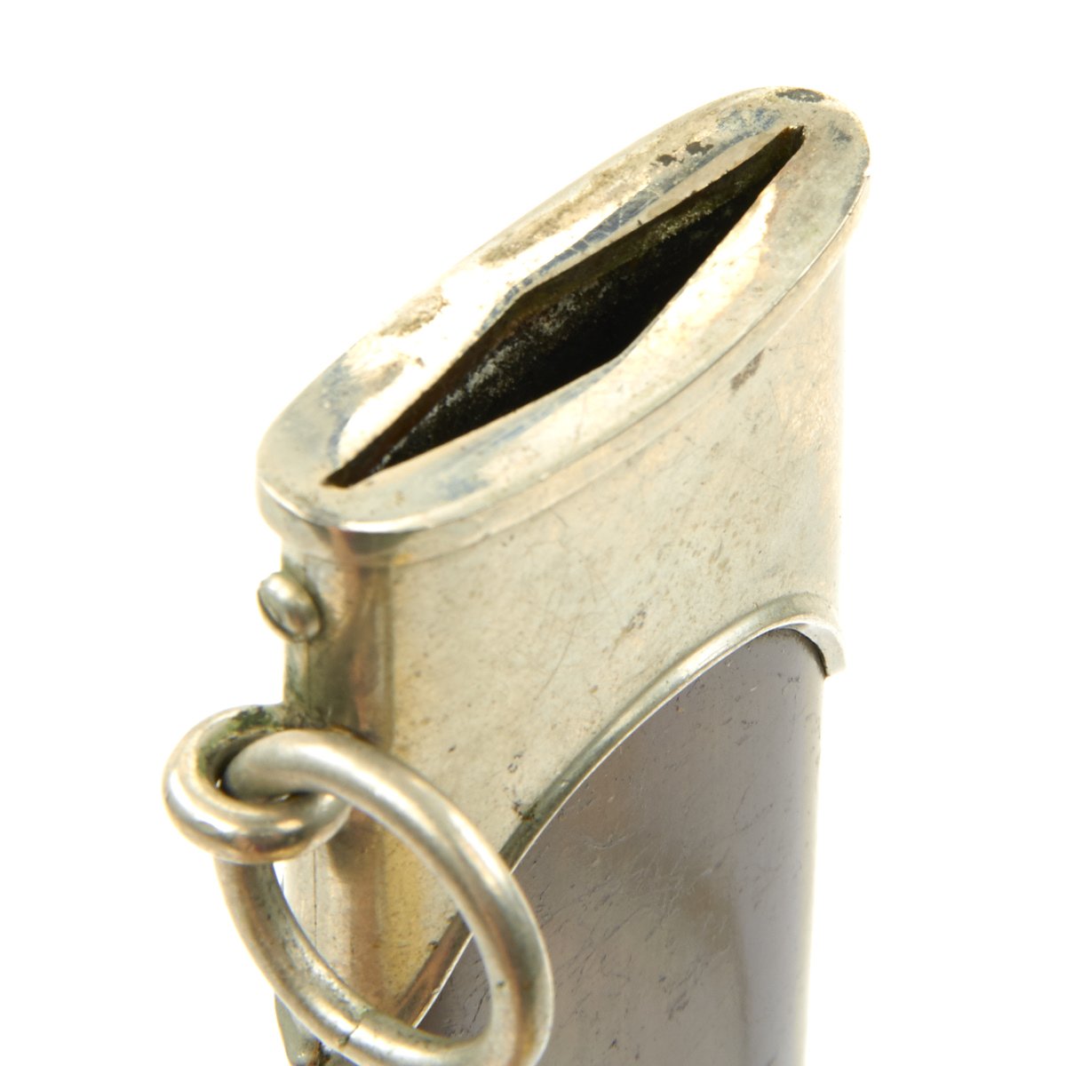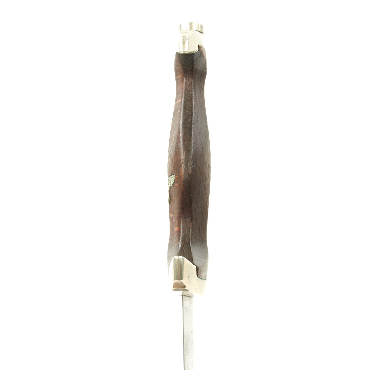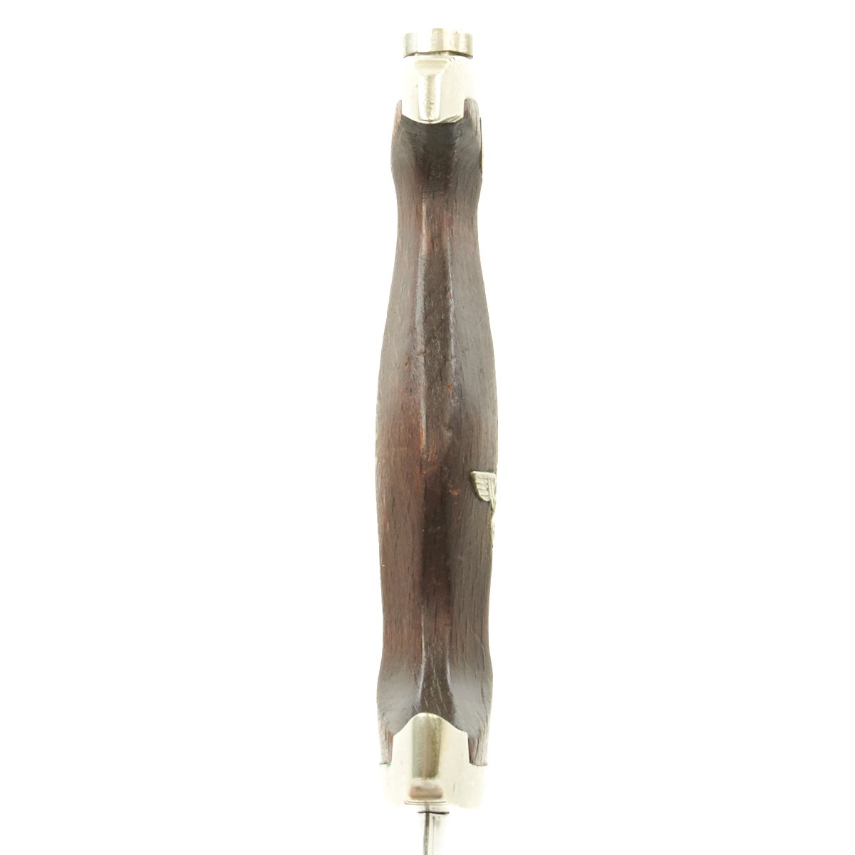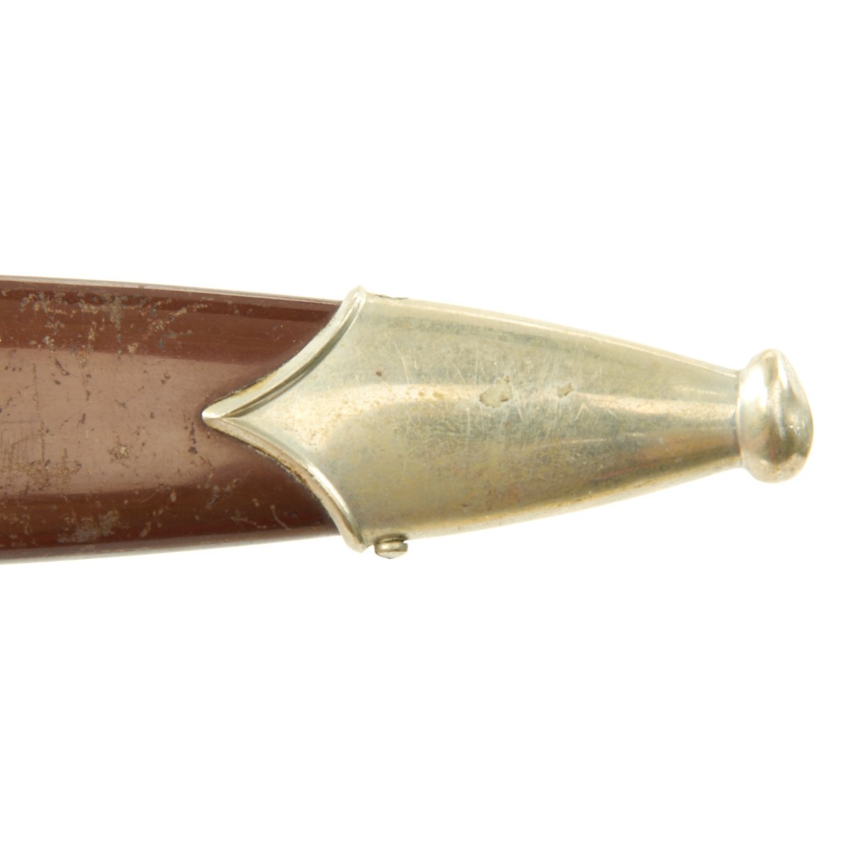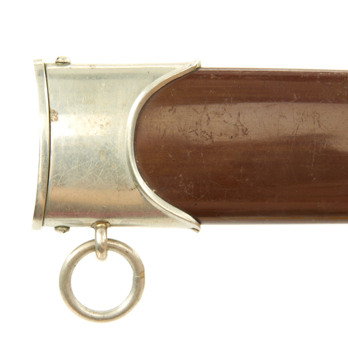 The steel based, brown scabbard looks great only shows minor wear. The solid nickel scabbard fittings are well done and in very good condition. All four screws remain intact. The solid nickel-silver scabbard fittings look excellent matching the scabbard fittings in color and patina. The scabbard to crossguard fit is near perfect.