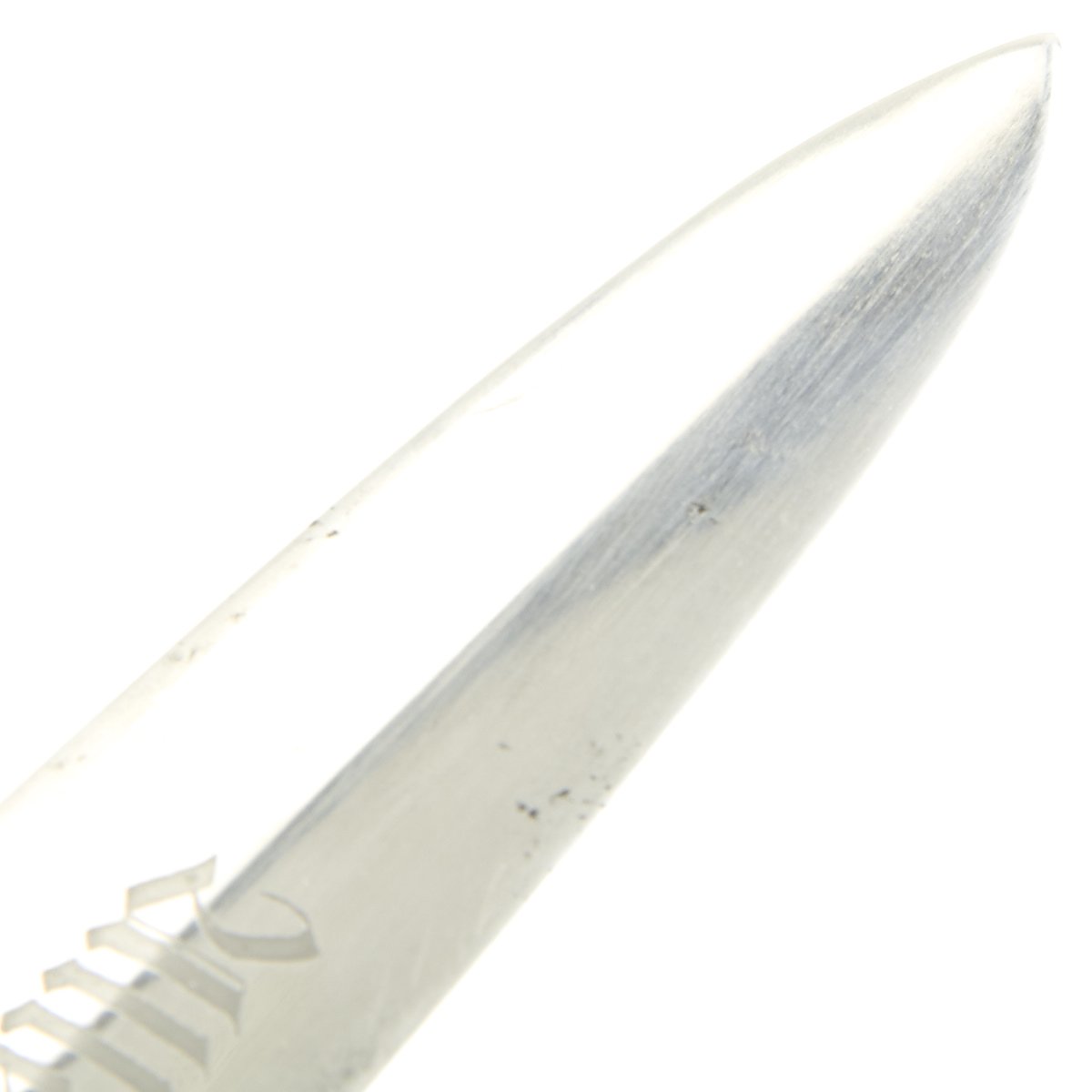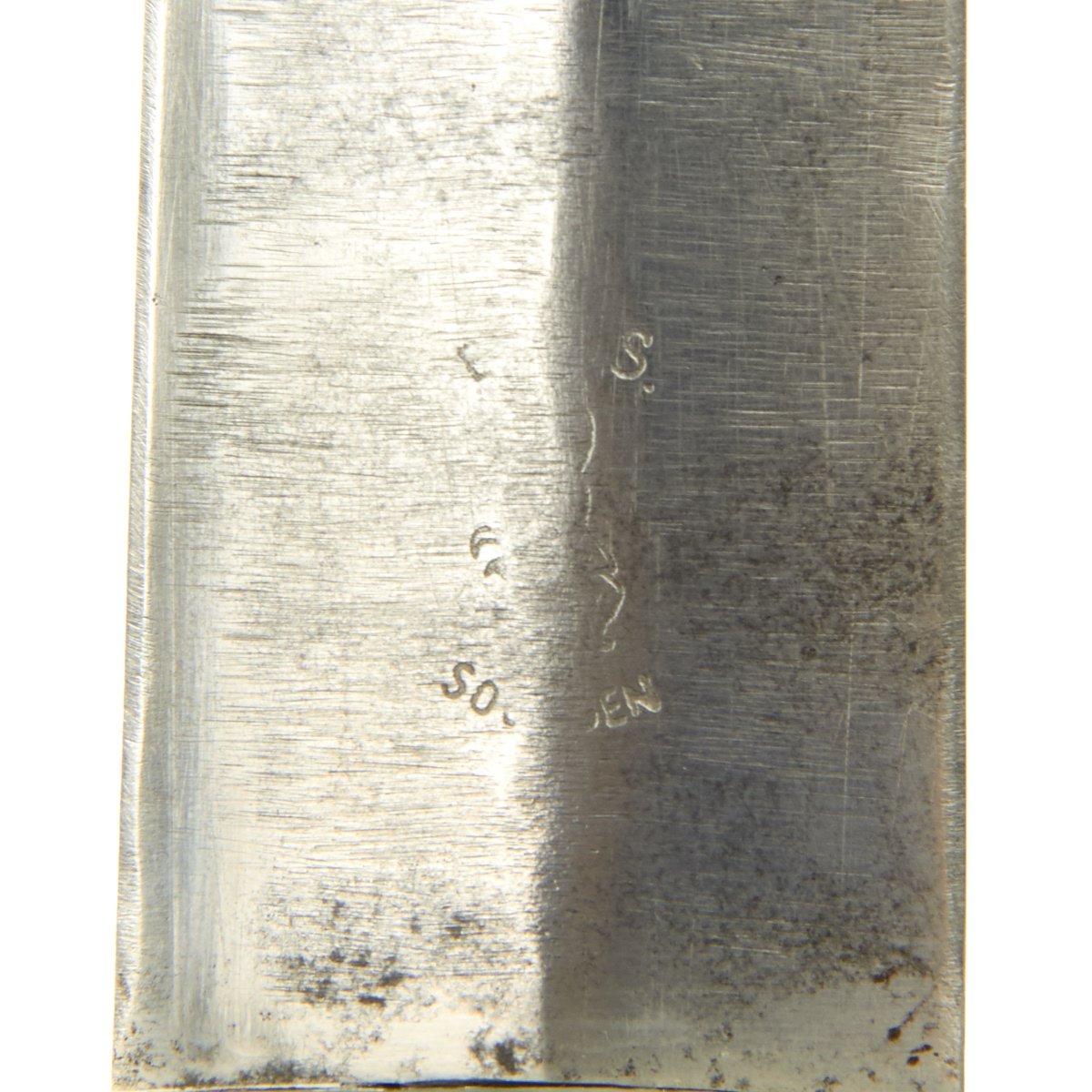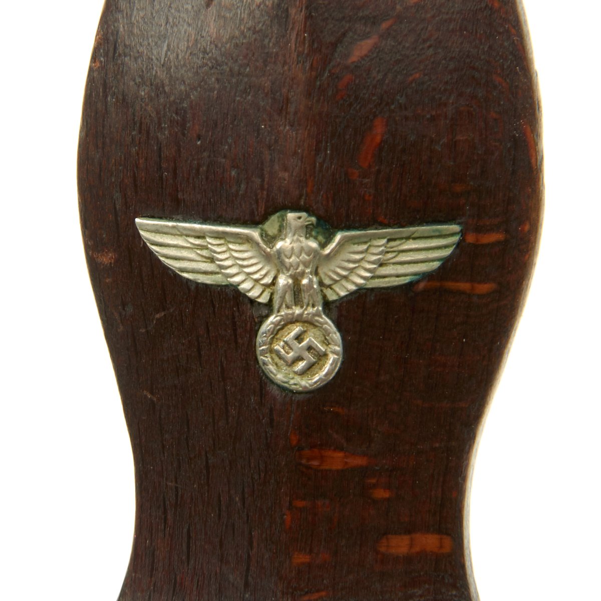J. Anthony Carter's book GERMAN KNIFE AND SWORD MAKERS, this firm used this trademark on early SA and NSKK daggers, which they made a good number of. The majority of the crossgrain remains visible throughout. The blade rates at very good.