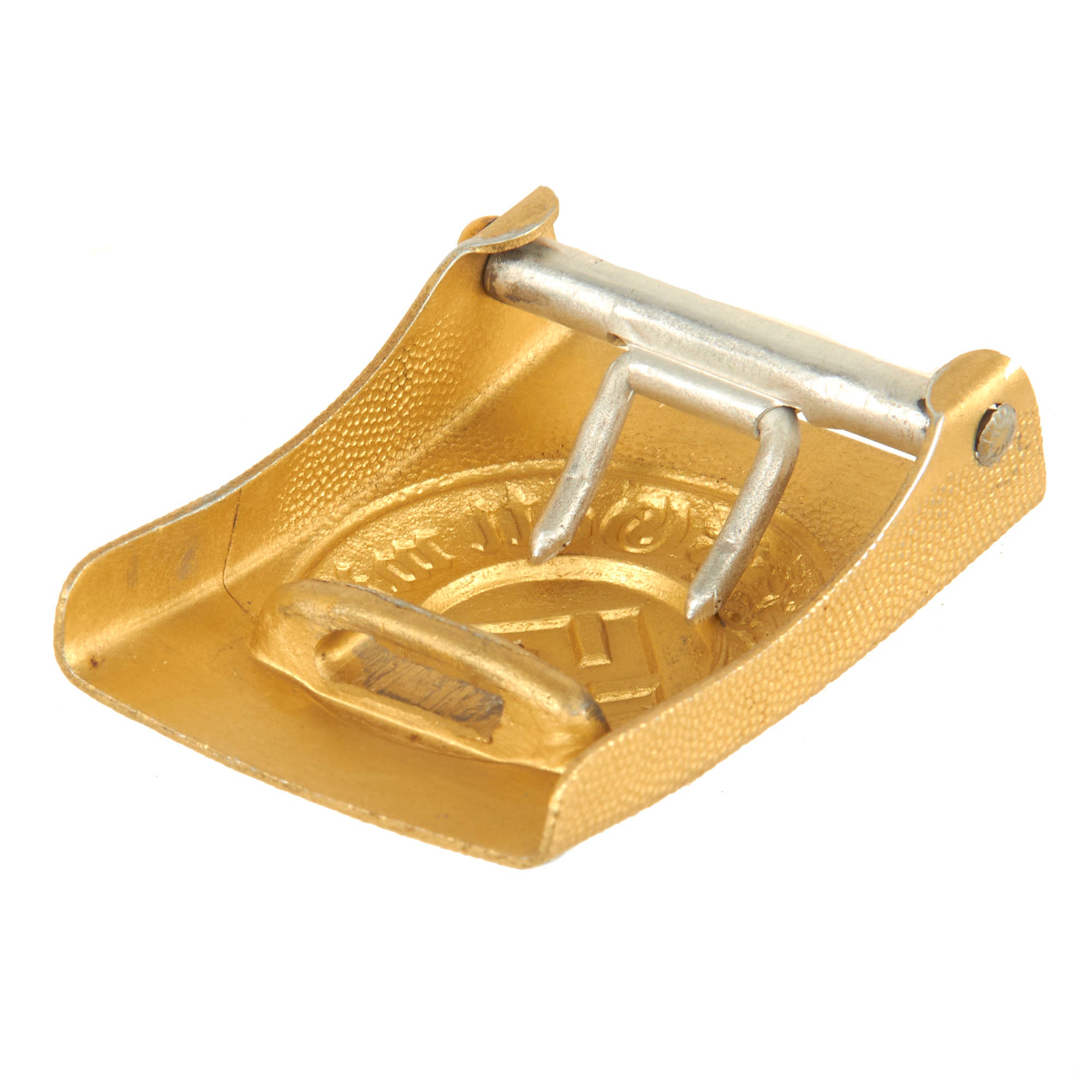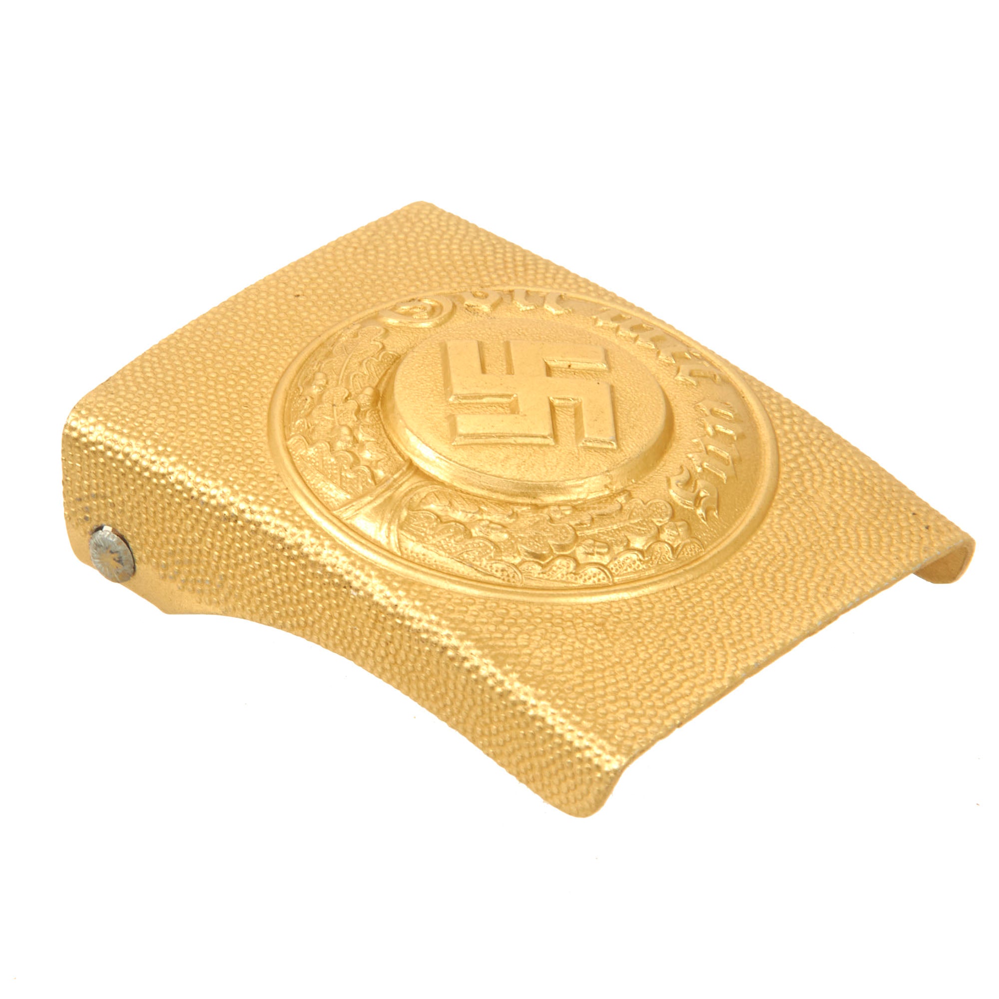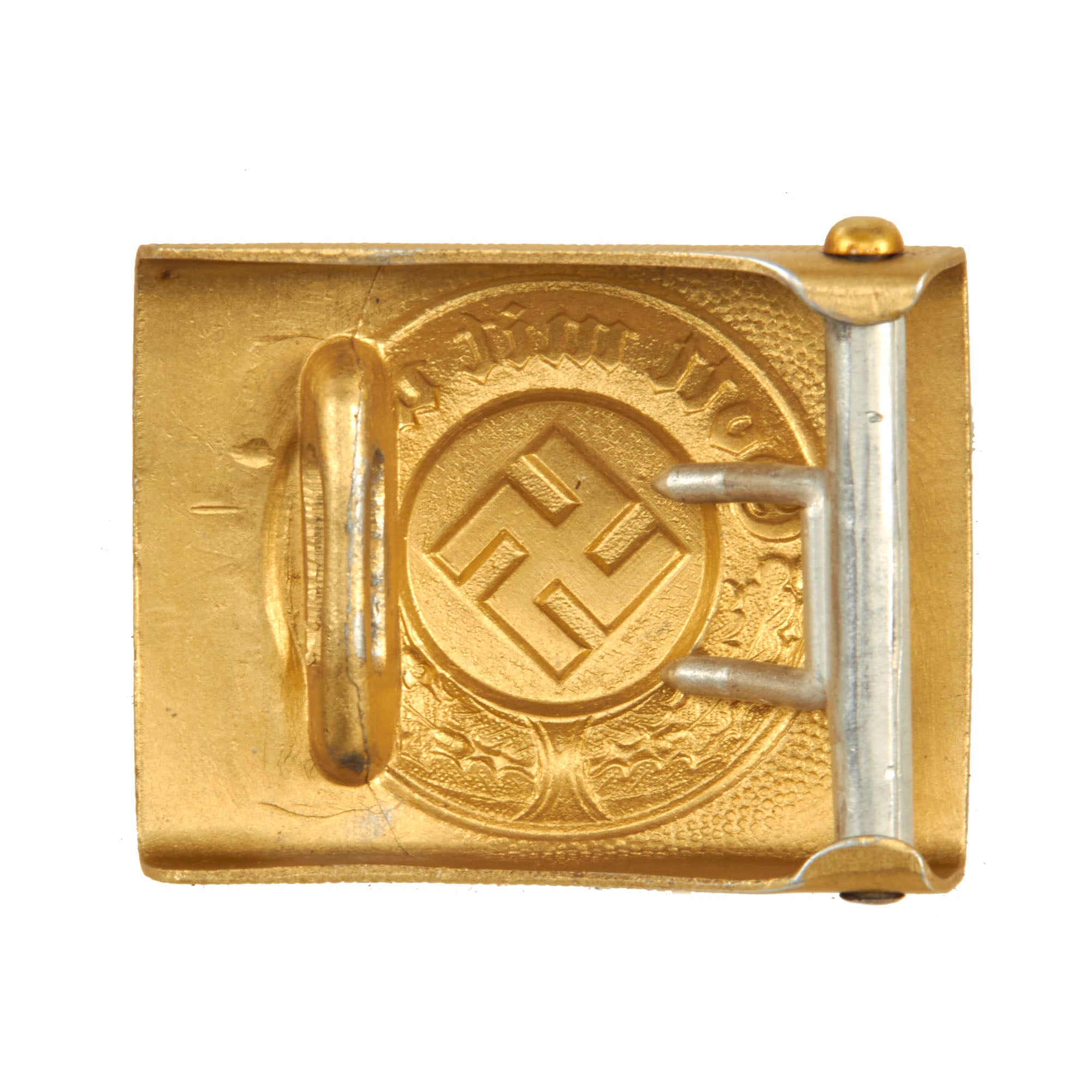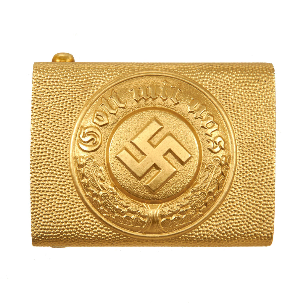 Original Item: Only One Available. This is a very good condition WWII German Wasserschutzpolizei (Water Protection Police) NCO's Belt Buckle (Koppelschloß) in gold painted / gilt pebbled aluminum. It is embossed with a central Swas (Hook Cross), with a wreath around it bearing the motto Gott mit uns (God with us). Nice single piece cast and bent aluminum construction box buckle with a pebbled background. The buckle is in very good condition, with all the pebbling present, as well as all of the details in the wreath. The gold paint is well retained on the front and back, and is what indicates that this is for the Water Police.
