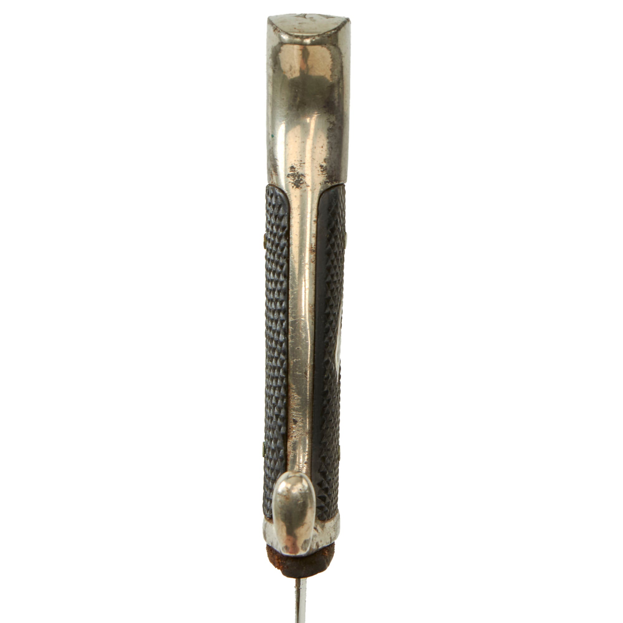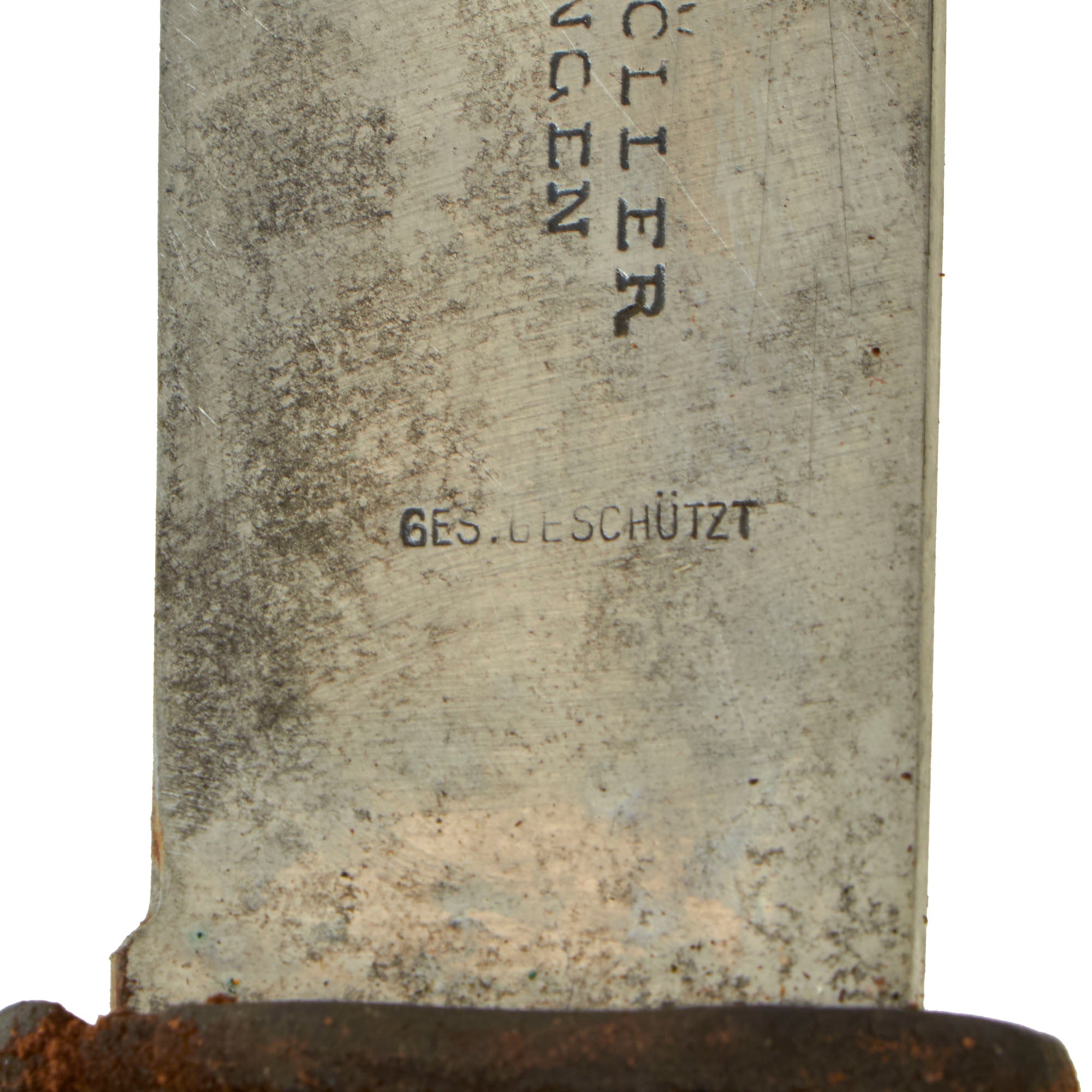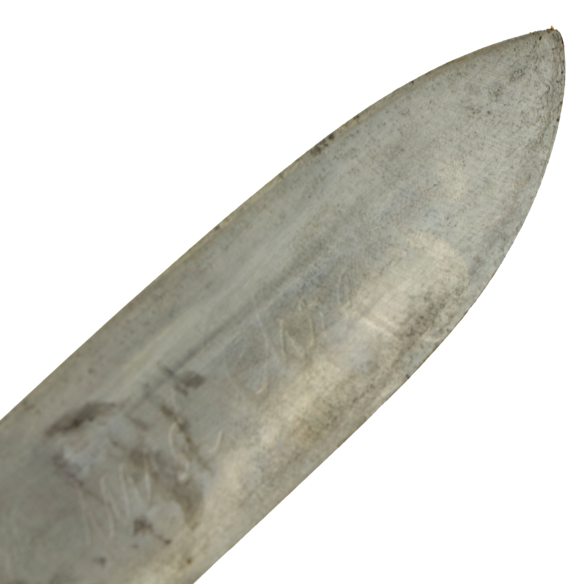 The blade of this example is in very good shape, showing wear from use and cleaning but not displaying any major pitting or edge damage. As is typical of the early period up until 1936, it has a thinner blade with no raised ricasso, and also no RZM codes. The blade has traces of the original crossgrain on the blade body and an intact tip. The blade is currently relatively dull from use and cleaning.