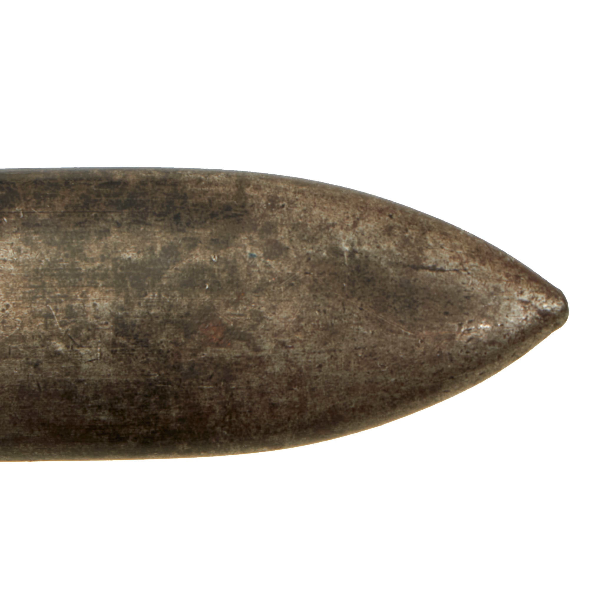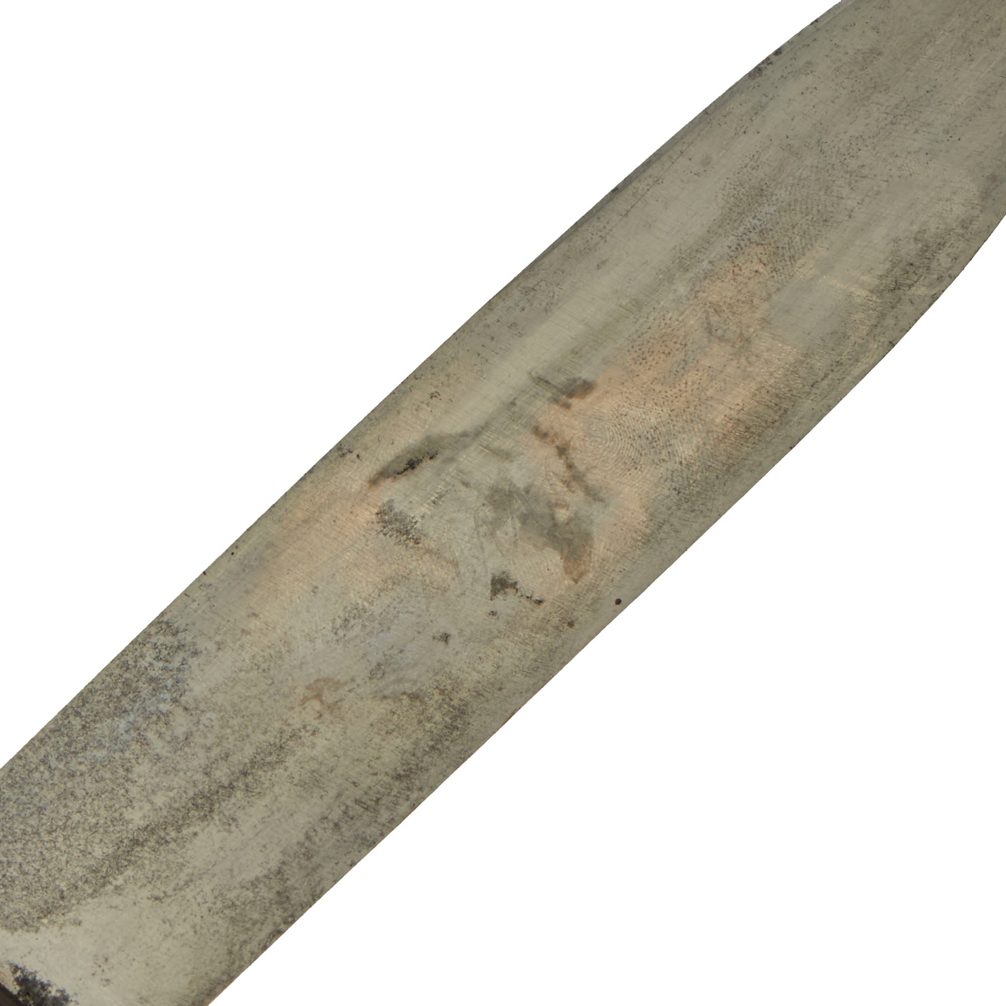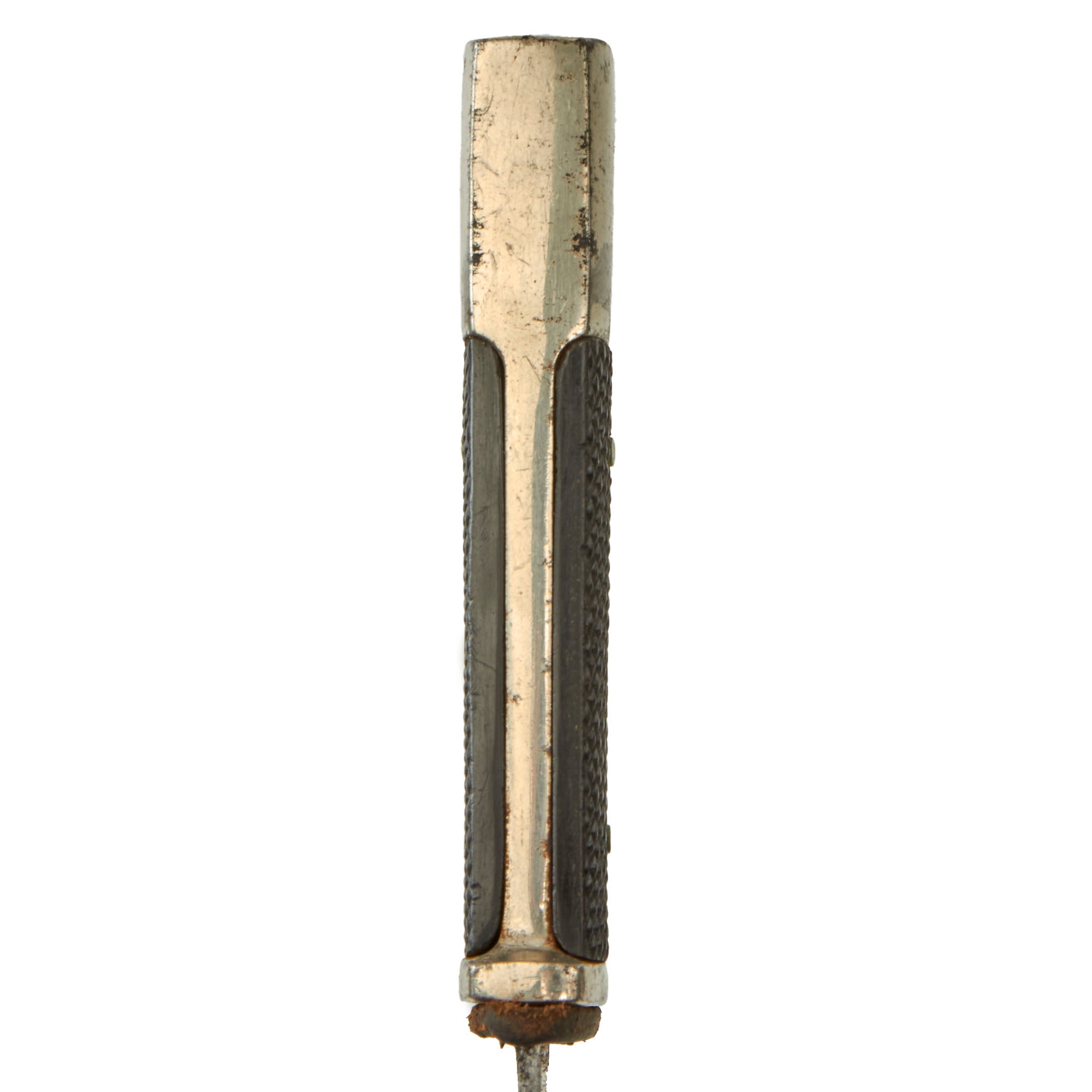 The blade of this example is in very good shape, showing wear from use and cleaning but not displaying any major pitting or edge damage. As is typical of the early period up until 1936, it has a thinner blade with no raised ricasso, and also no RZM codes. The blade has traces of the original crossgrain on the blade body and an intact tip. The blade is currently relatively dull from use and cleaning.