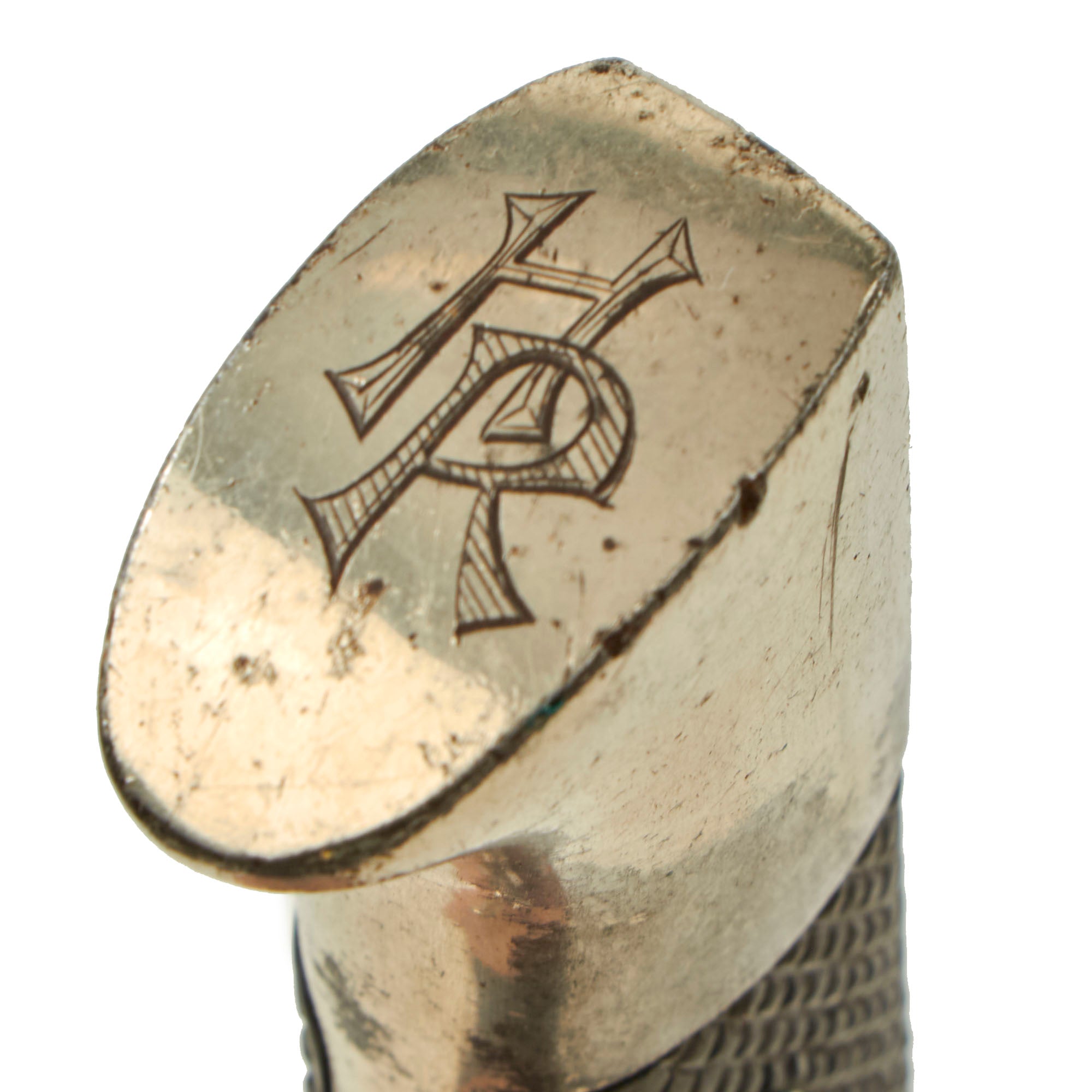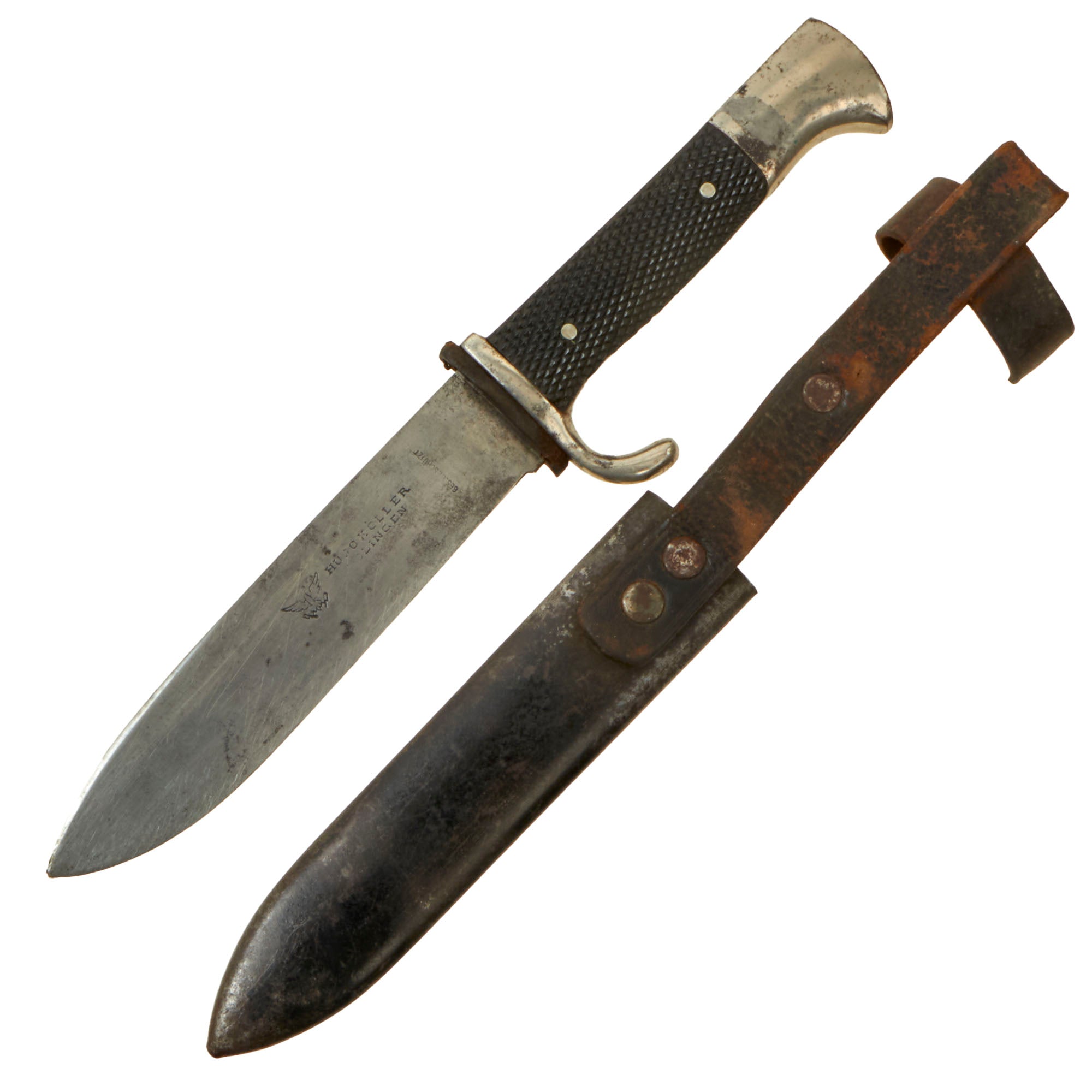 Original Item: Only One Available. This is a very nice service used condition early HJ National Youth Organization Fahrtenmesser (trip knife), marked on the blade by rare maker Hugo Köller of Solingen. This is the first item of any type that we have had by this maker. This early HJ Knife is a nice service used example of the type, with a handle that is nickel-plated over a steel base. The plating shows some wear, particularly around the pommel from the securing strap, but there is still about 75% intact. It also has a lovely overlapping H R monogram on the bottom of the pommel, which is very well executed!