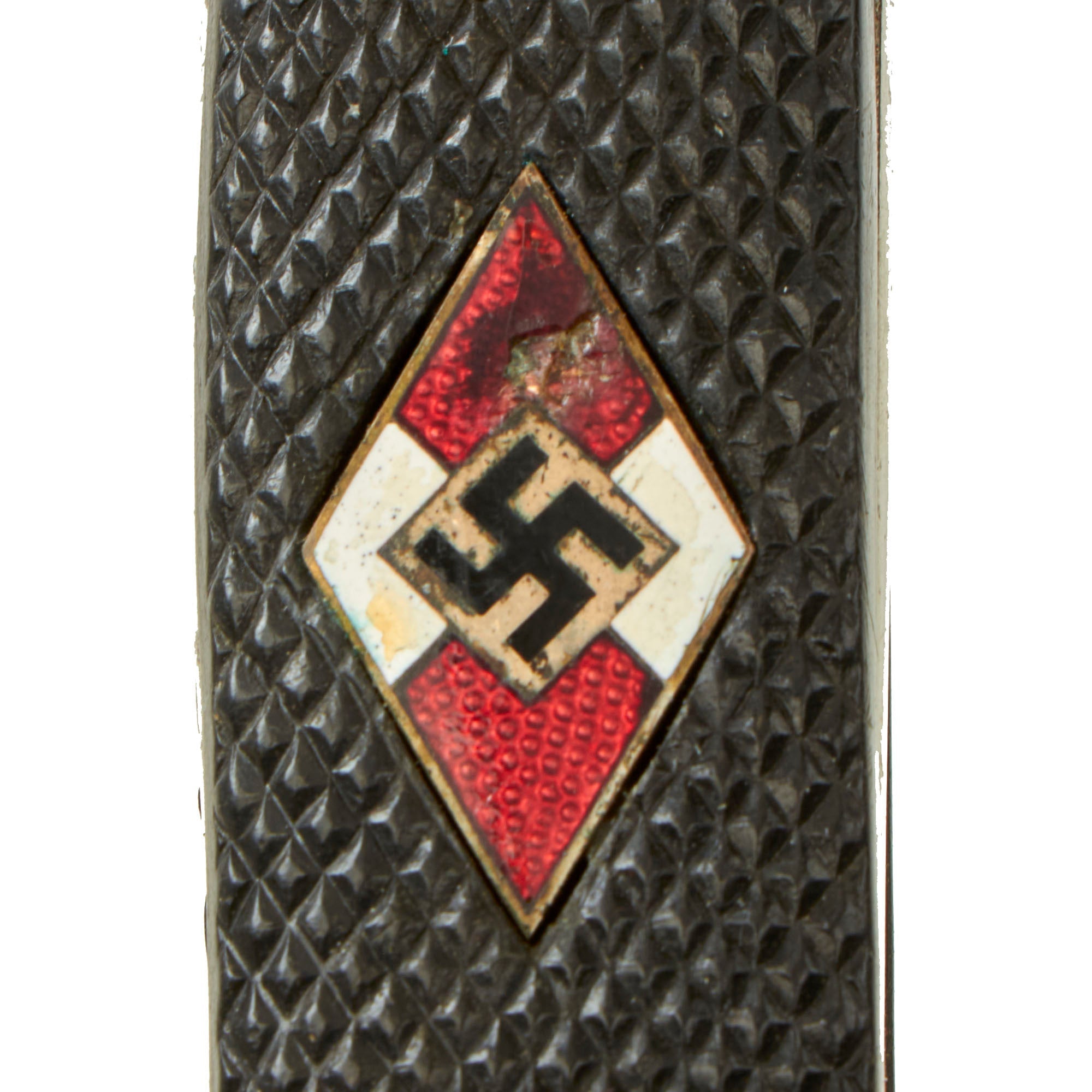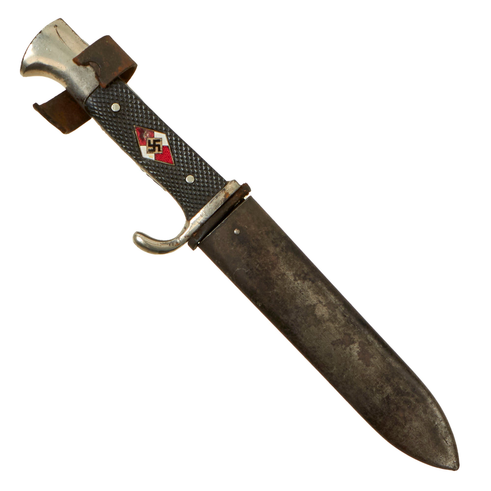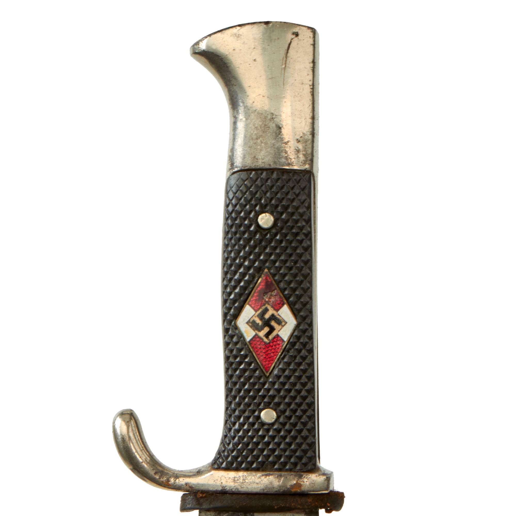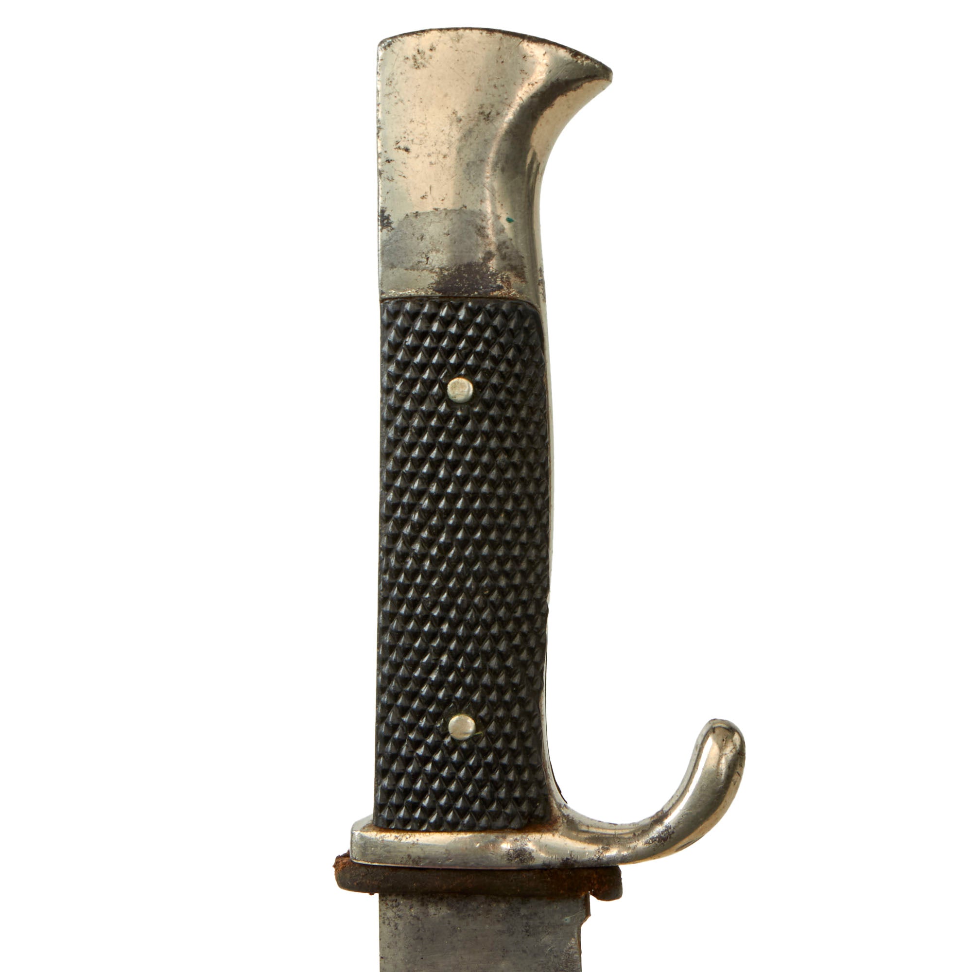 The HJ Leaders were professionals in charge of the training and NSDAP education of the German Youth. They wore a special dagger consisting of silvered hilt fittings with blue-black leather-covered scabbard. The grip was composed of tightly wrapped silver wire, over a wood base. The pommel cap featured an HJ diamond on top, complete with swas. The upper scabbard fitting portrayed an open-winged HJ eagle with swas cut into the bird's chest. The blade was etched with the HJ motto, Blut und Ehre!