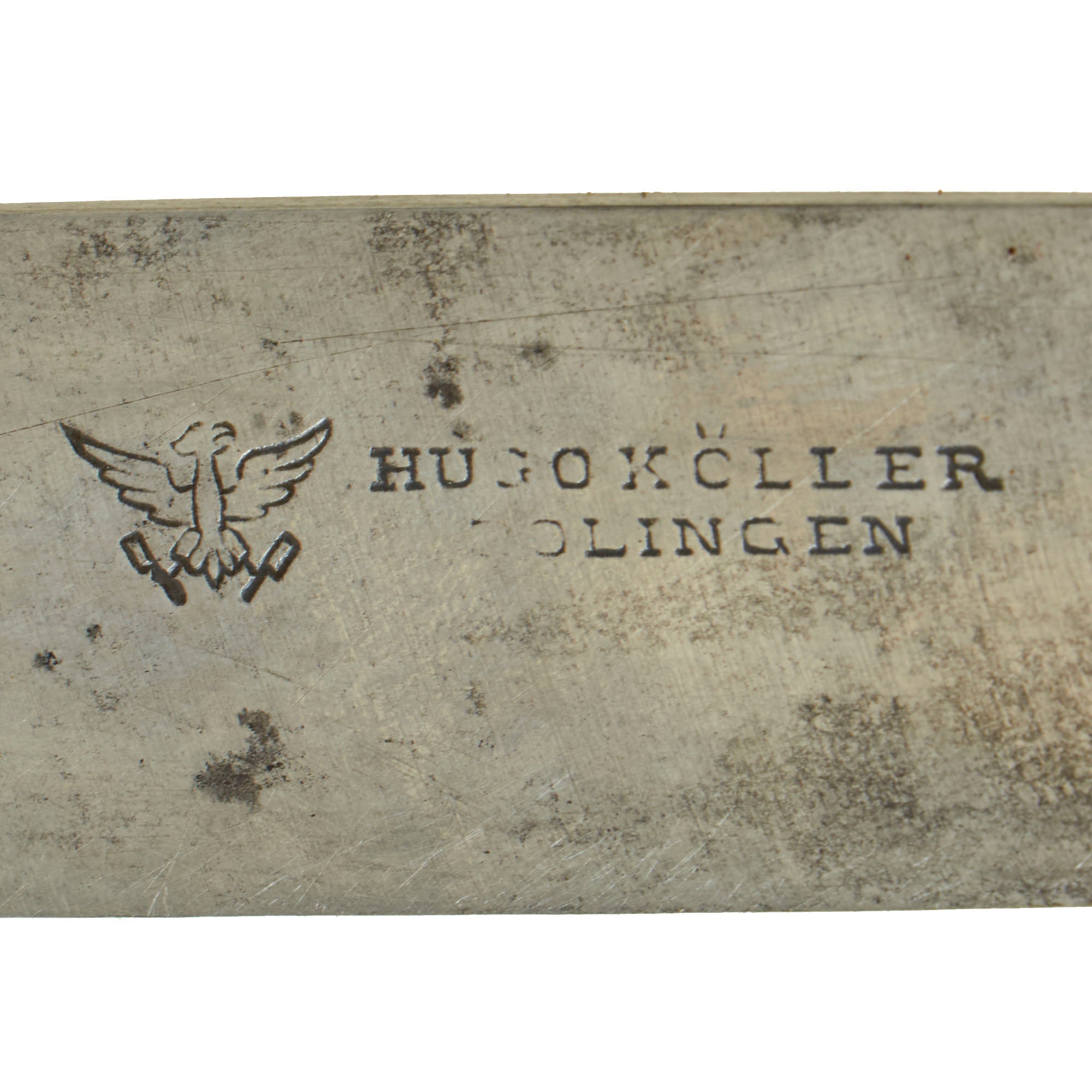 On the reverse the blade is is the "Eagle clasping a straight razor and table knife" trademark logo of Hugo Köller Stahlwarenfabrik (Steelware Factory) in Solingen, the legendary "City of Blades" in western Germany. To the right of this is the company address logo: