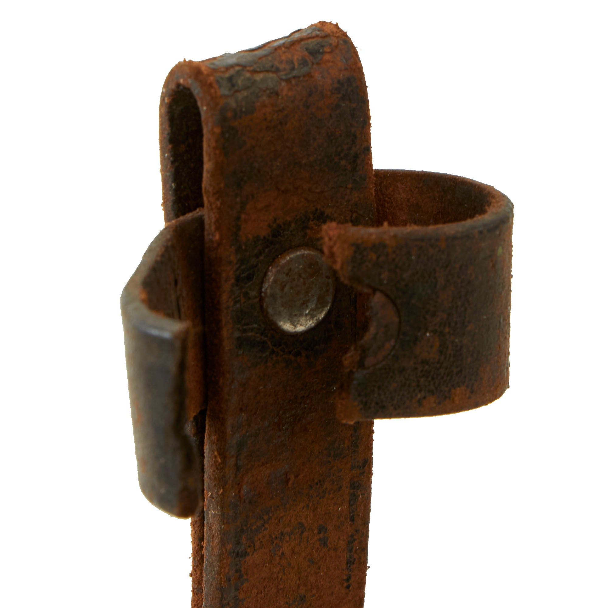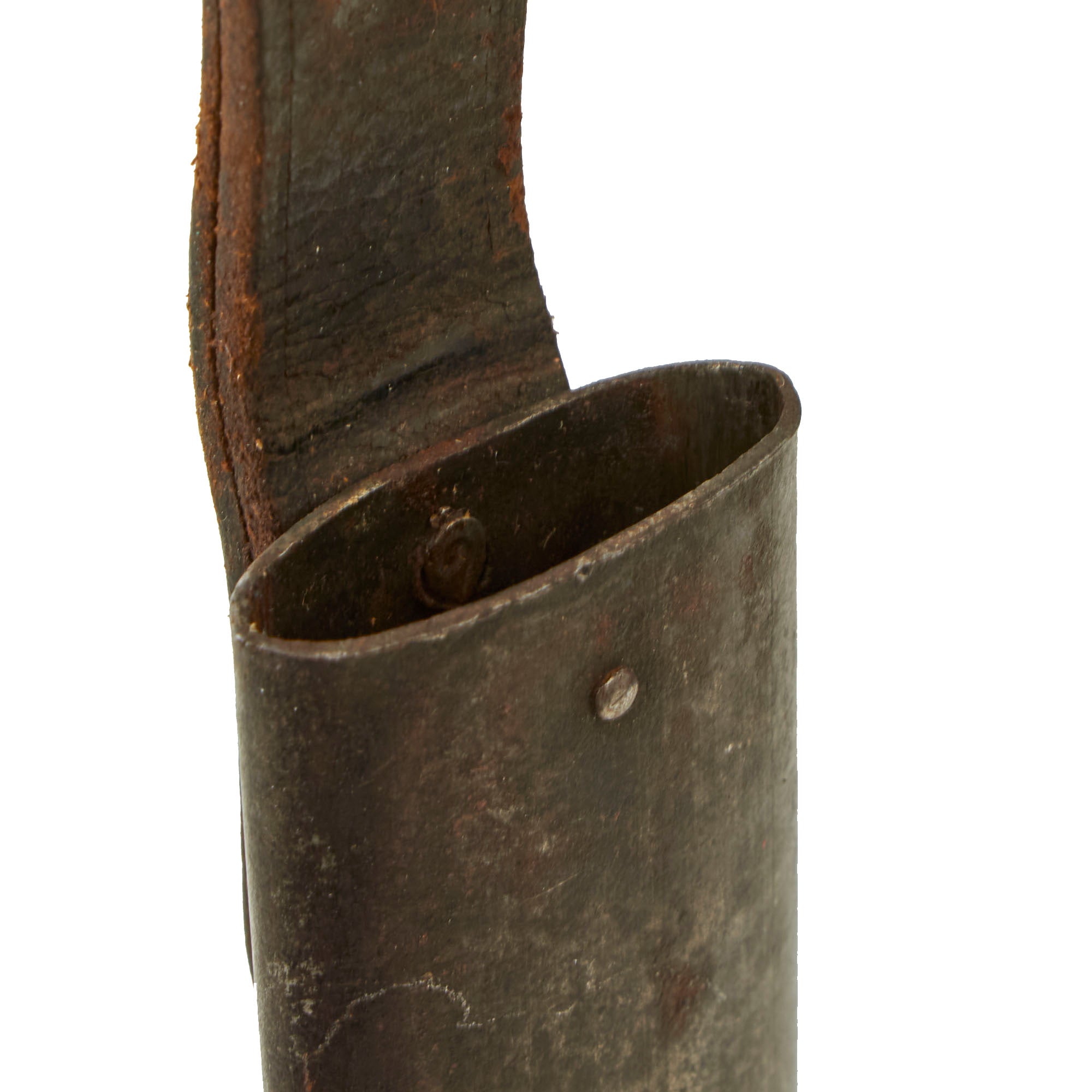 The scabbard shell is the typical tapered example, originally issued with a black enamel finish. This is now heavily worn, and probably only about 25% remains, mostly on the reverse of the scabbard. There is a nice gray oxidized patina where the paint is missing, giving it a great service worn look. The leather belt hanger is present, but worn, showing a lot of finish loss, and both ends of the securing strap have torn off.