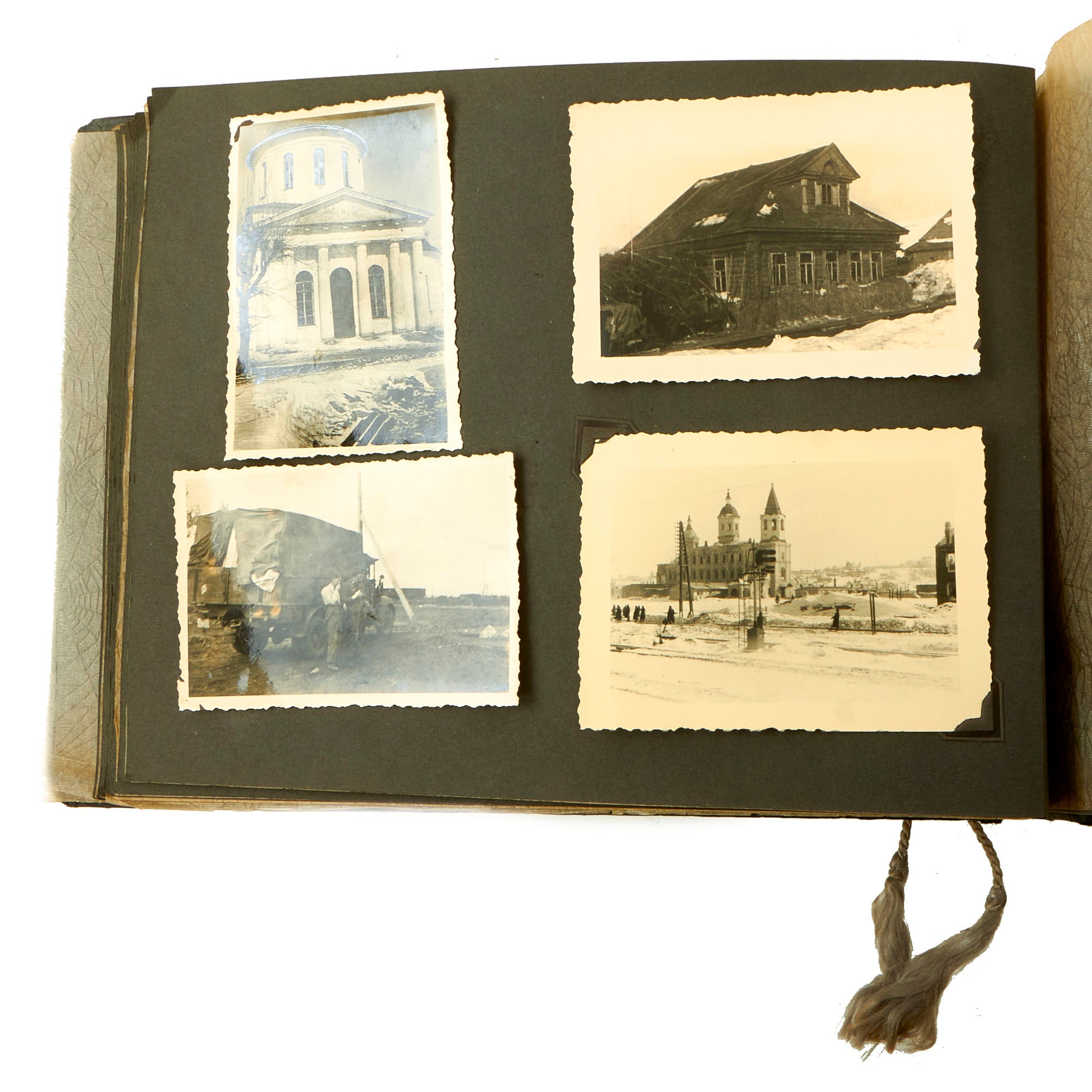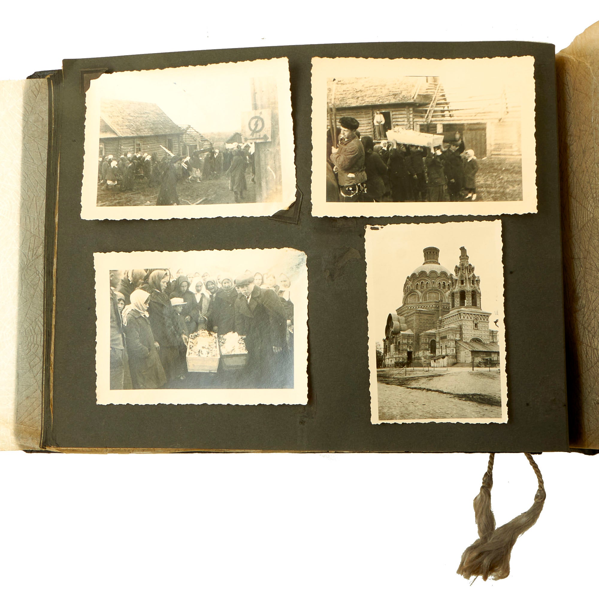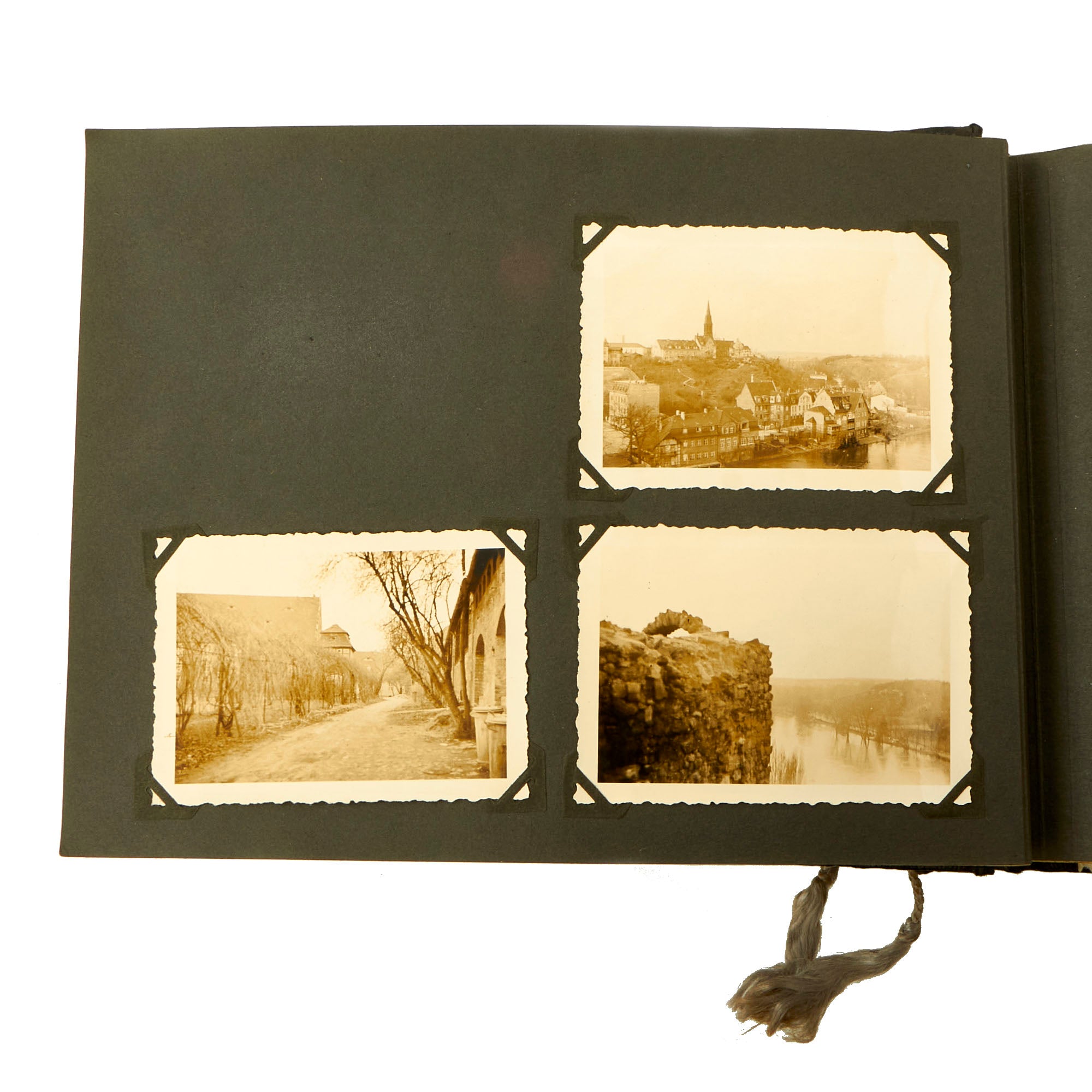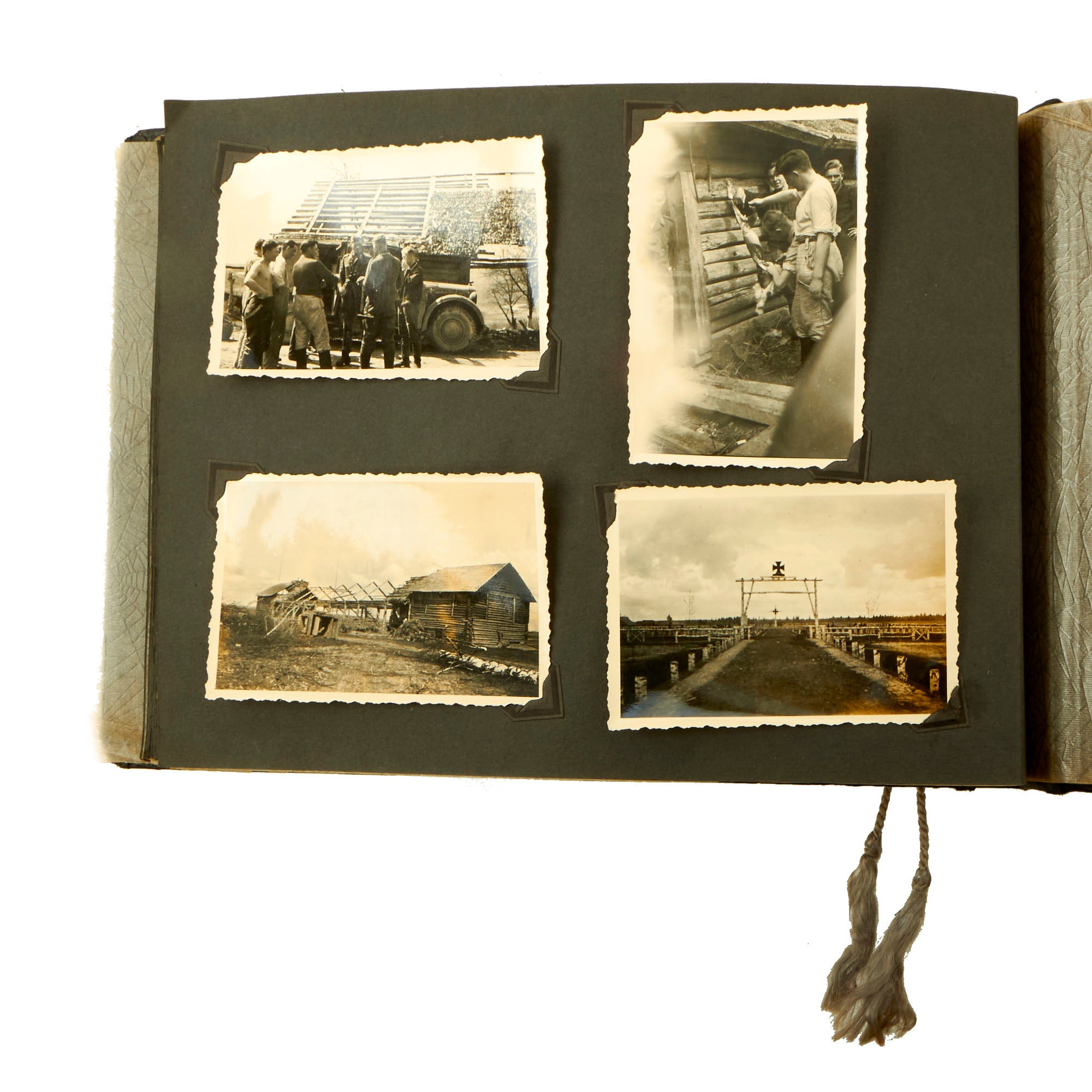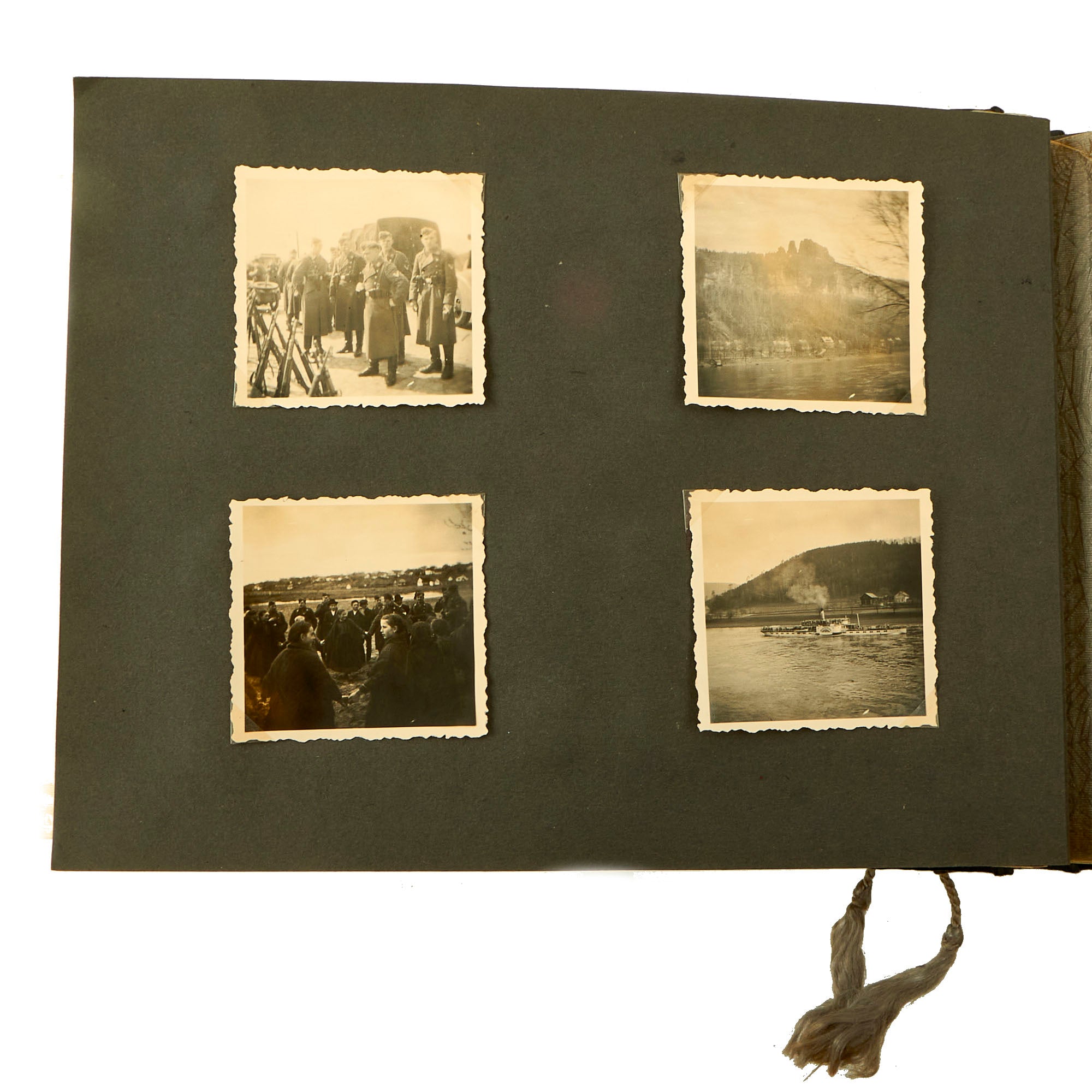 The Luftwaffe album of the older brother is the standard 10 1/2" x 7 1/2" size, with a textured black leatherette cover and a lovely embossed silver "Droop-Tail" eagle in the upper left corner. The lower lower corner has a Erinnengunen (memories) embossed in silver, and the album is bound by silver thread. The first picture is of the older brother with his parents, with the younger brother on the far right. Over 150 photographs fill the 23 pages of the album, which are separated by spider web pattern "onion skin" paper to keep them from sticking together. They show all manner of scenes, and include both military and personal photos, as well as photos from the island of Crete, where the Luftwaffe paratroopers served in numerous actions. It would appear that the older brother was in a Luftwaffe signals unit.