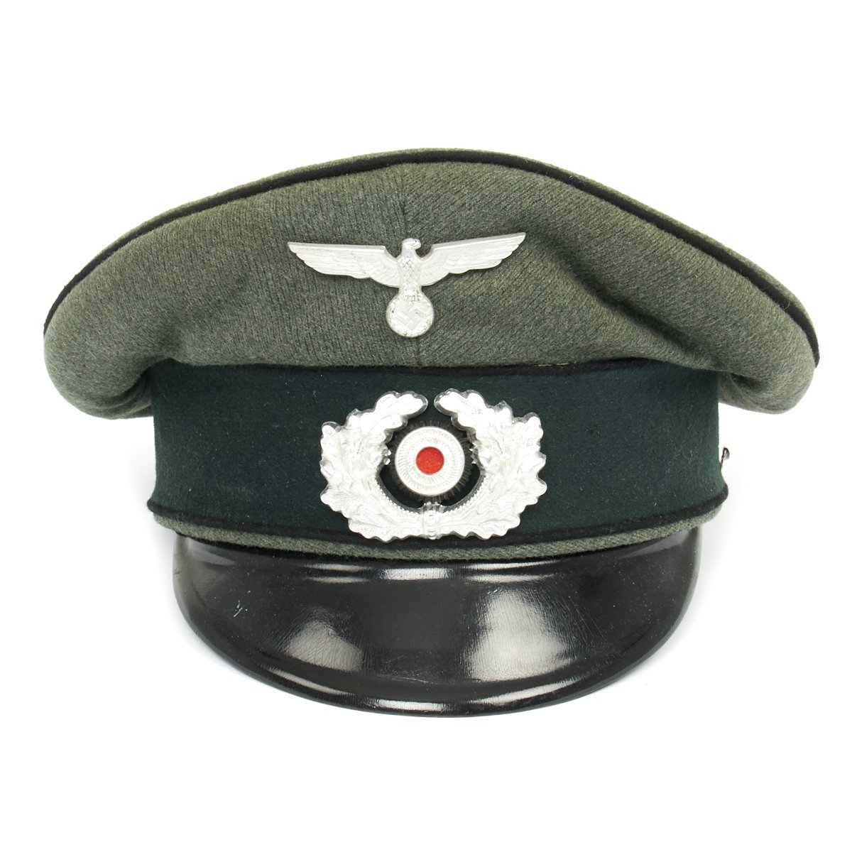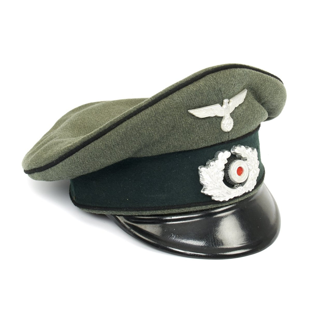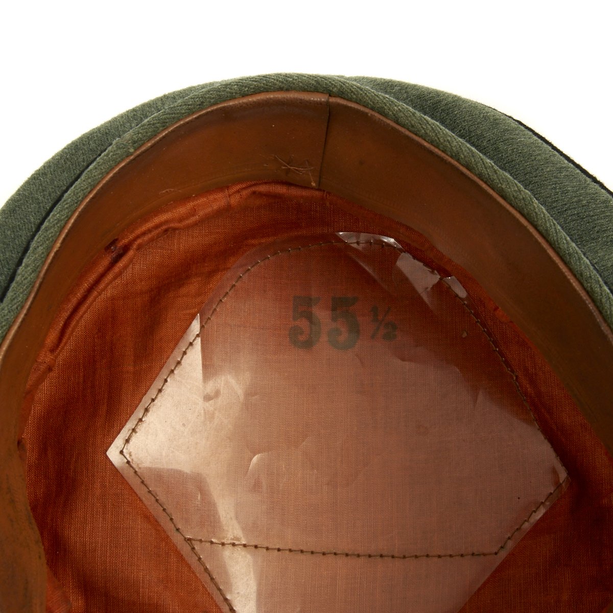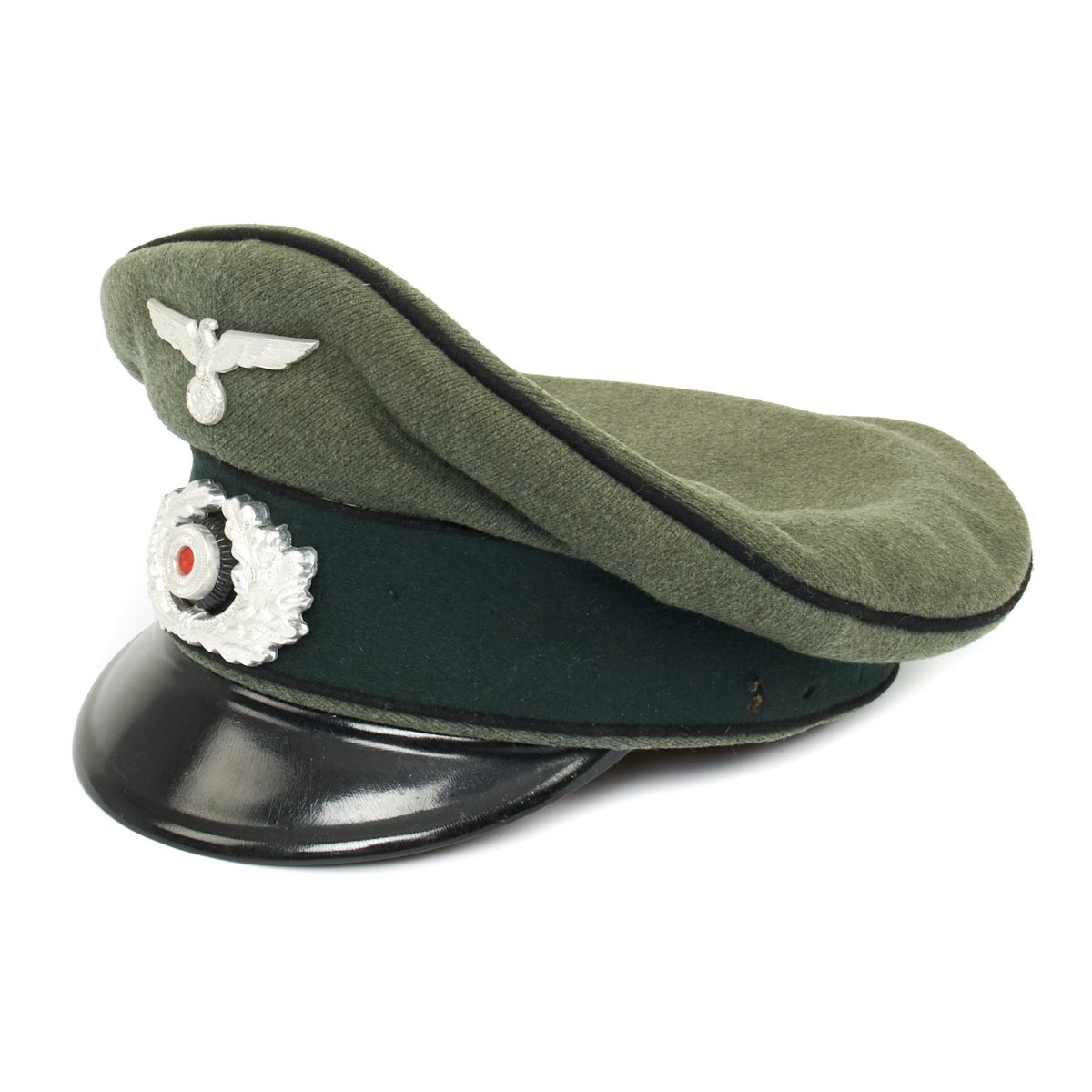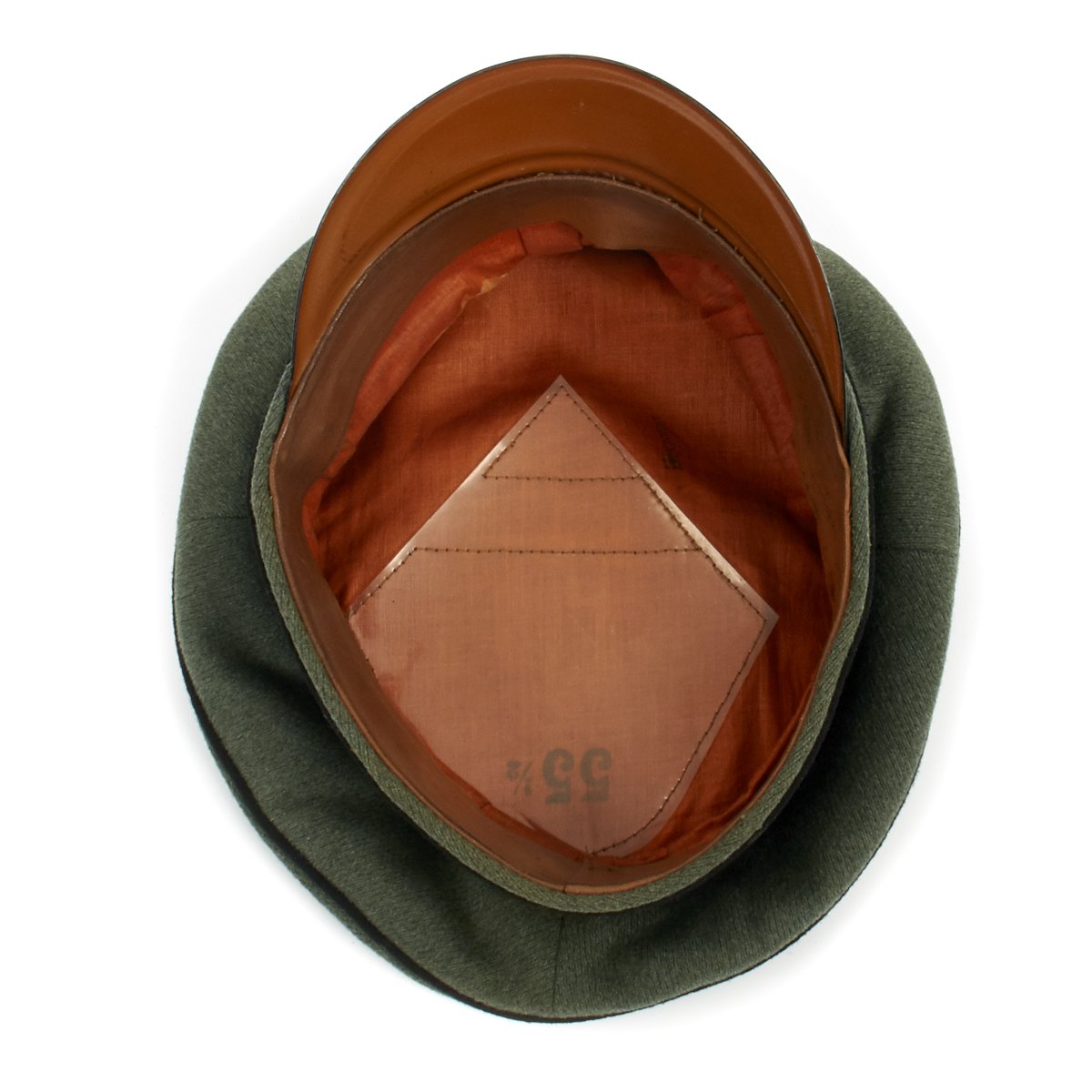 Original Item: Only One Available. Excellent condition 1942 dated Third Reich Wehrmacht Heer Pioneer regiment visor hat. This peak visor cap has a fine field moleskin wool crown, with dark green wool cap-band and black piping. The peak visor cap retains a metal eagle and swas badge, plus a fine set of zinc/aluminum oak leaves with cockade. The inner lining is champagne color with full celluloid diamond and a size 55 1/2 ink stamp. The visor retains all of its finish both on top and beneath. The tan leather sweatband is fully intact. It is missing the chin strap.