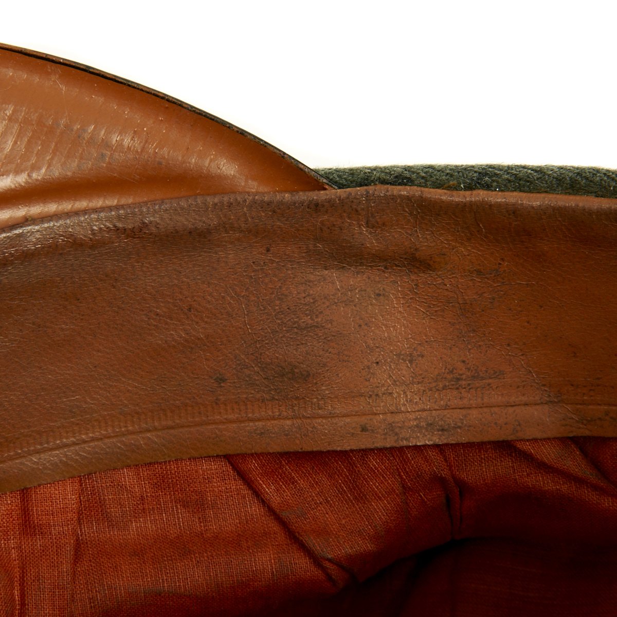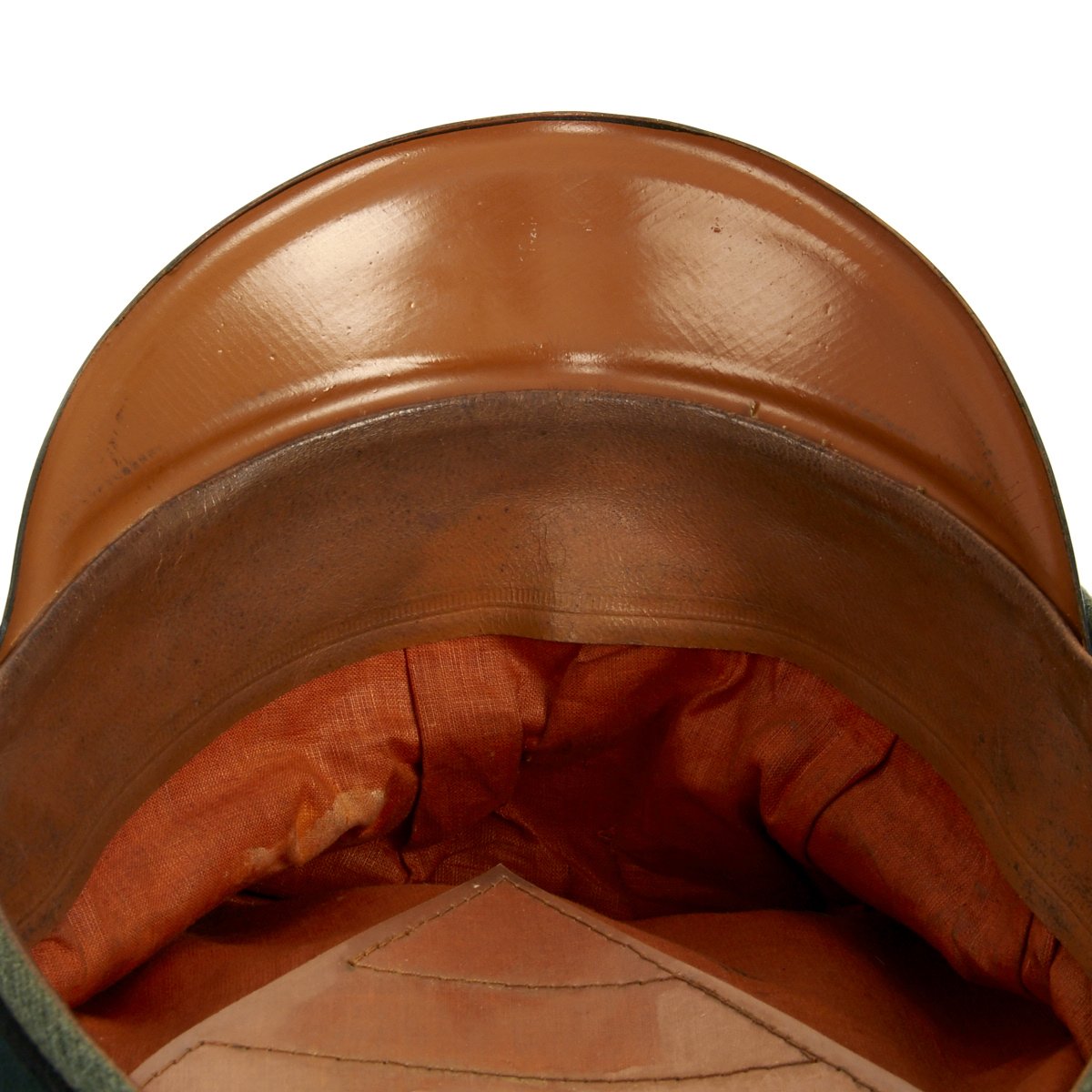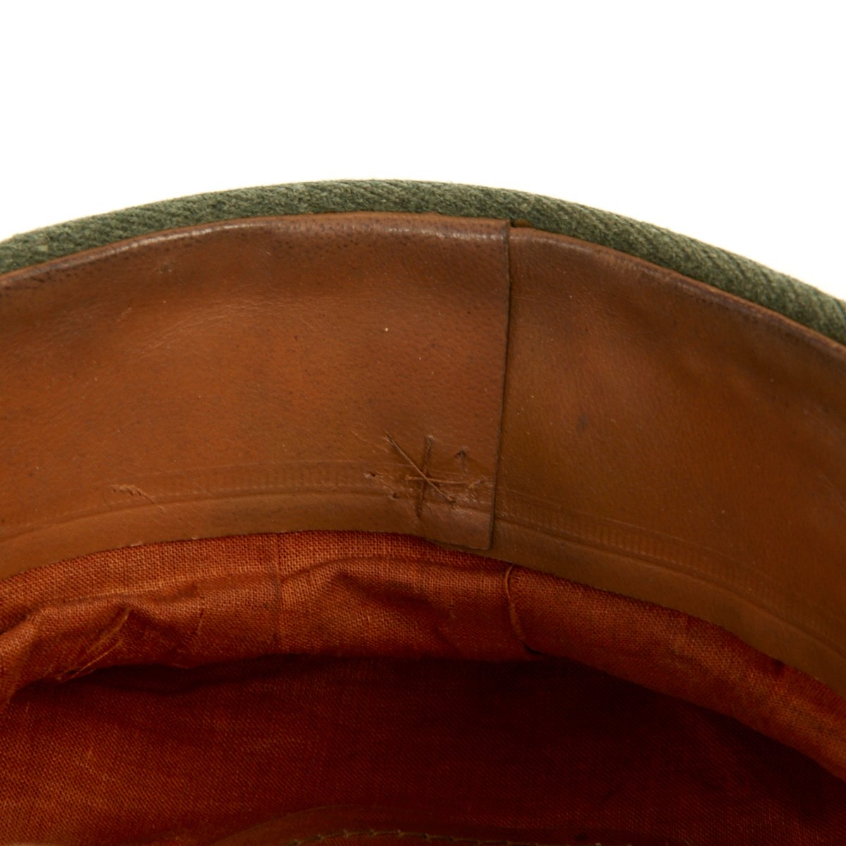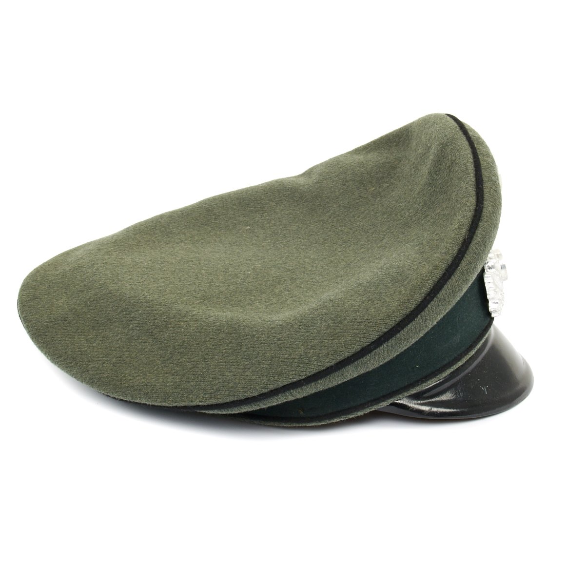 Original Item: Only One Available. Excellent condition 1942 dated Third Reich Wehrmacht Heer Pioneer regiment visor hat. This peak visor cap has a fine field moleskin wool crown, with dark green wool cap-band and black piping. The peak visor cap retains a metal eagle and swas badge, plus a fine set of zinc/aluminum oak leaves with cockade. The inner lining is champagne color with full celluloid diamond and a size 55 1/2 ink stamp. The visor retains all of its finish both on top and beneath. The tan leather sweatband is fully intact. It is missing the chin strap.