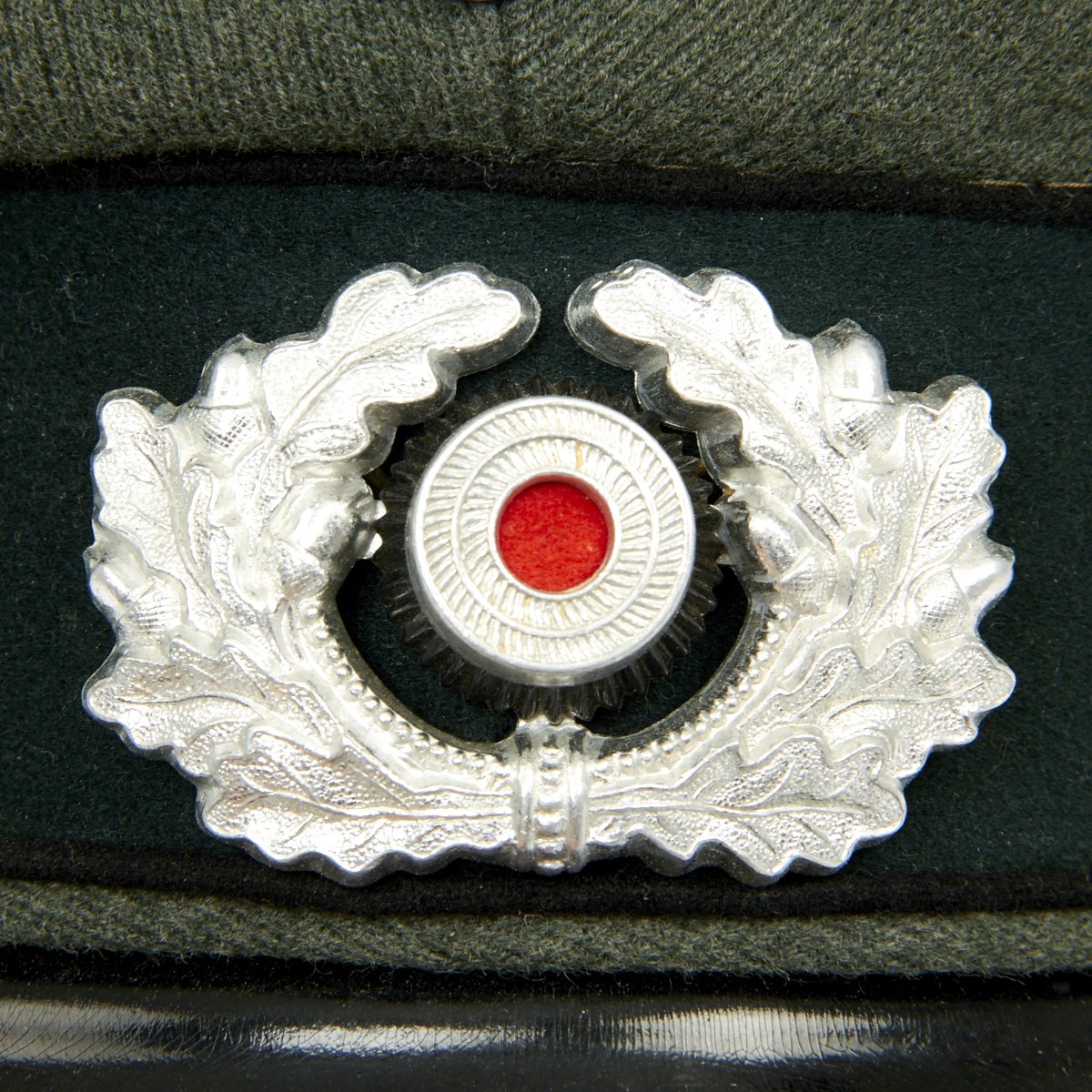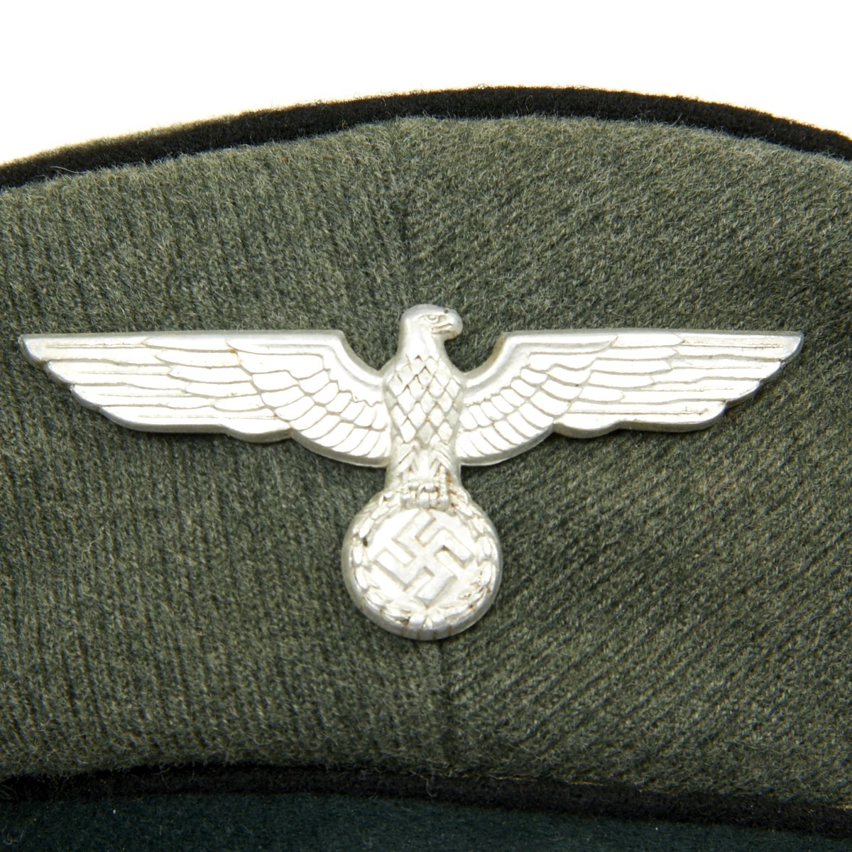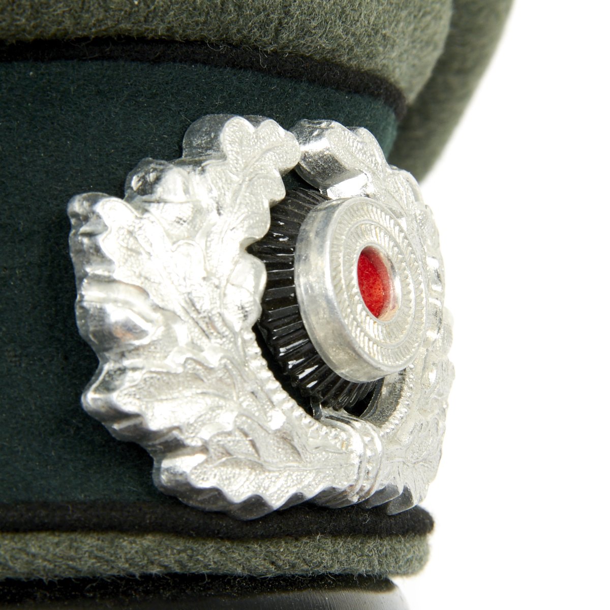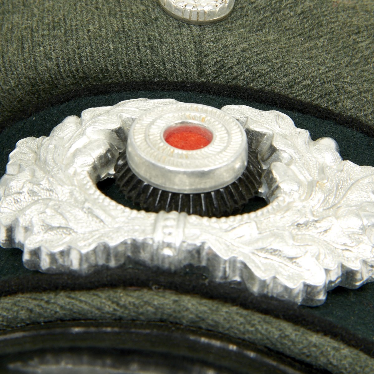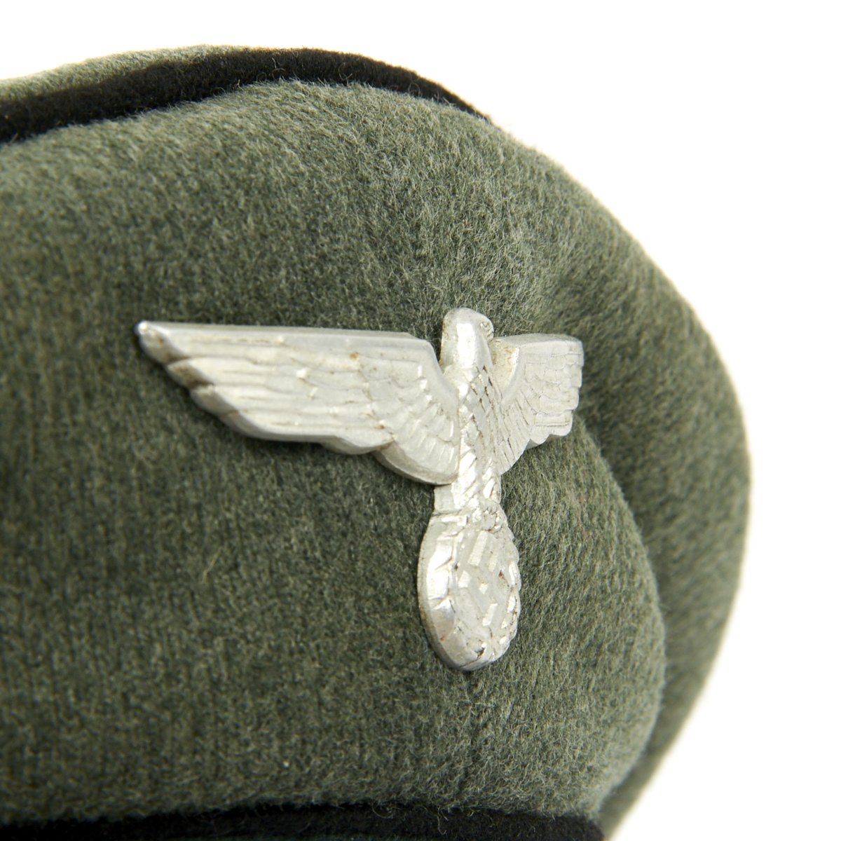 Original Item: Only One Available. Excellent condition 1942 dated Third Reich Wehrmacht Heer Pioneer regiment visor hat. This peak visor cap has a fine field moleskin wool crown, with dark green wool cap-band and black piping. The peak visor cap retains a metal eagle and swas badge, plus a fine set of zinc/aluminum oak leaves with cockade. The inner lining is champagne color with full celluloid diamond and a size 55 1/2 ink stamp. The visor retains all of its finish both on top and beneath. The tan leather sweatband is fully intact. It is missing the chin strap.